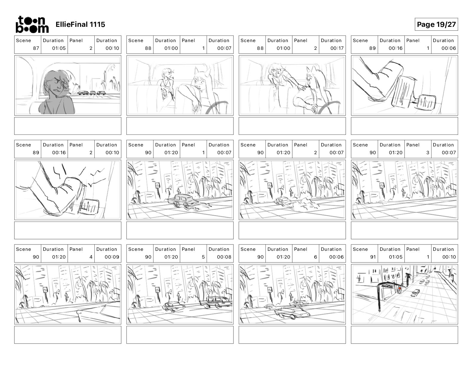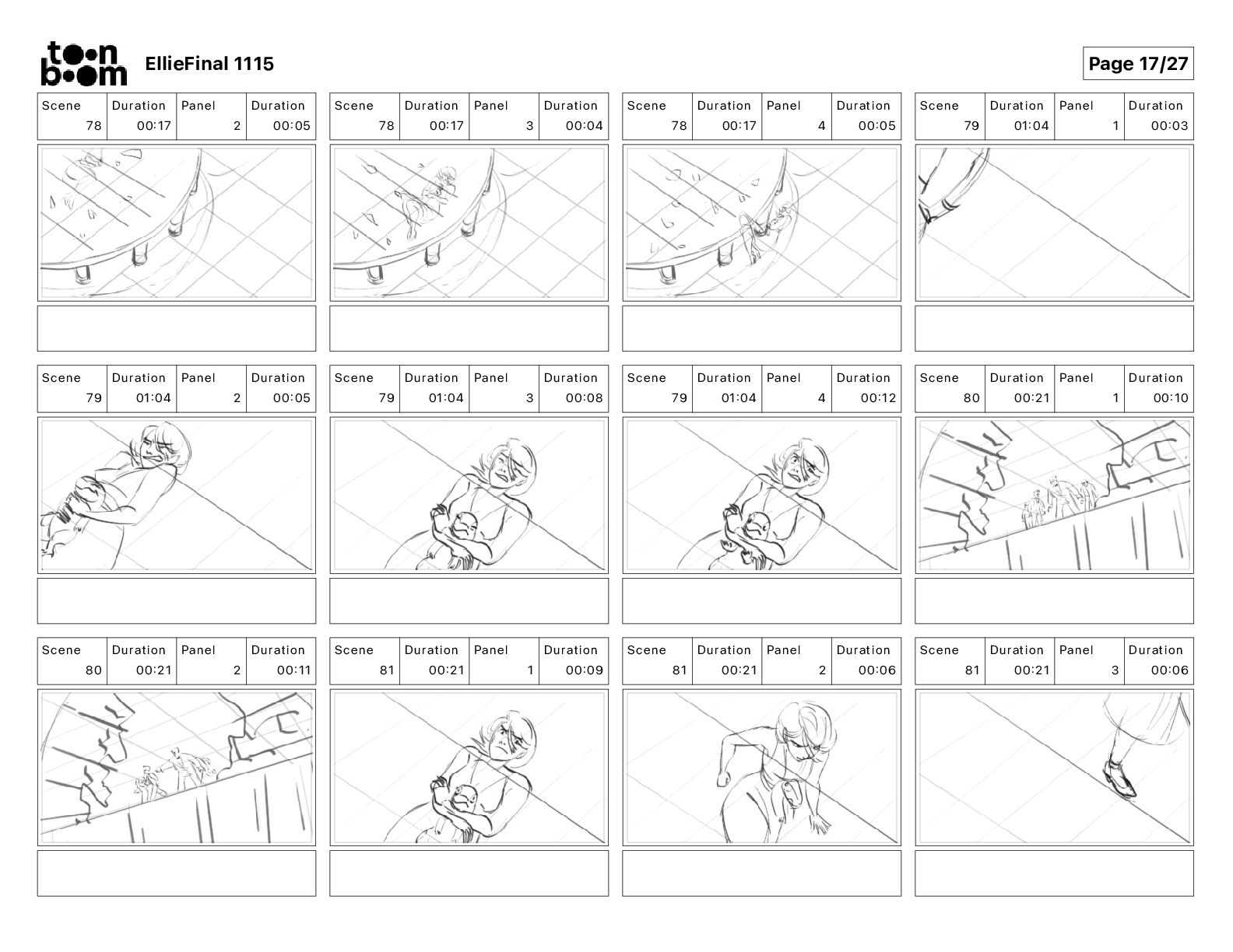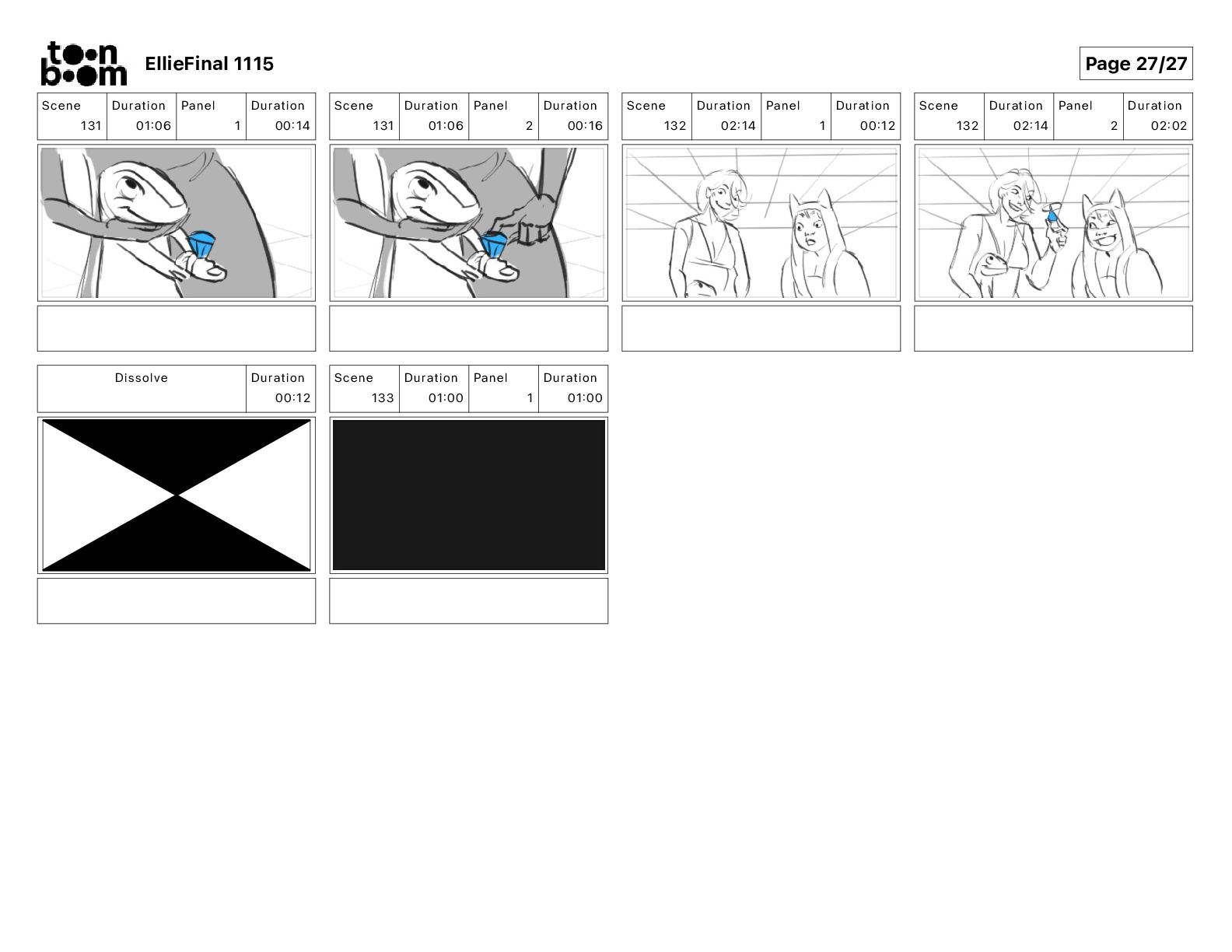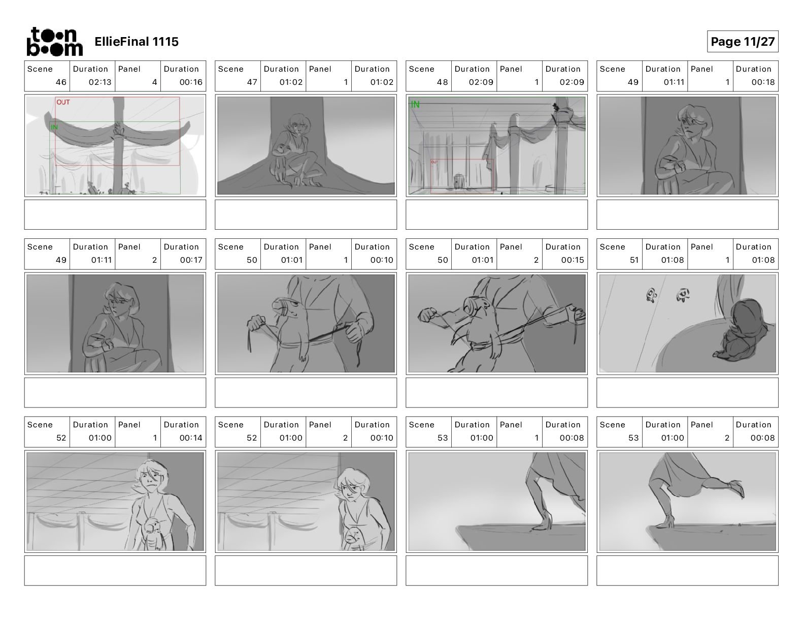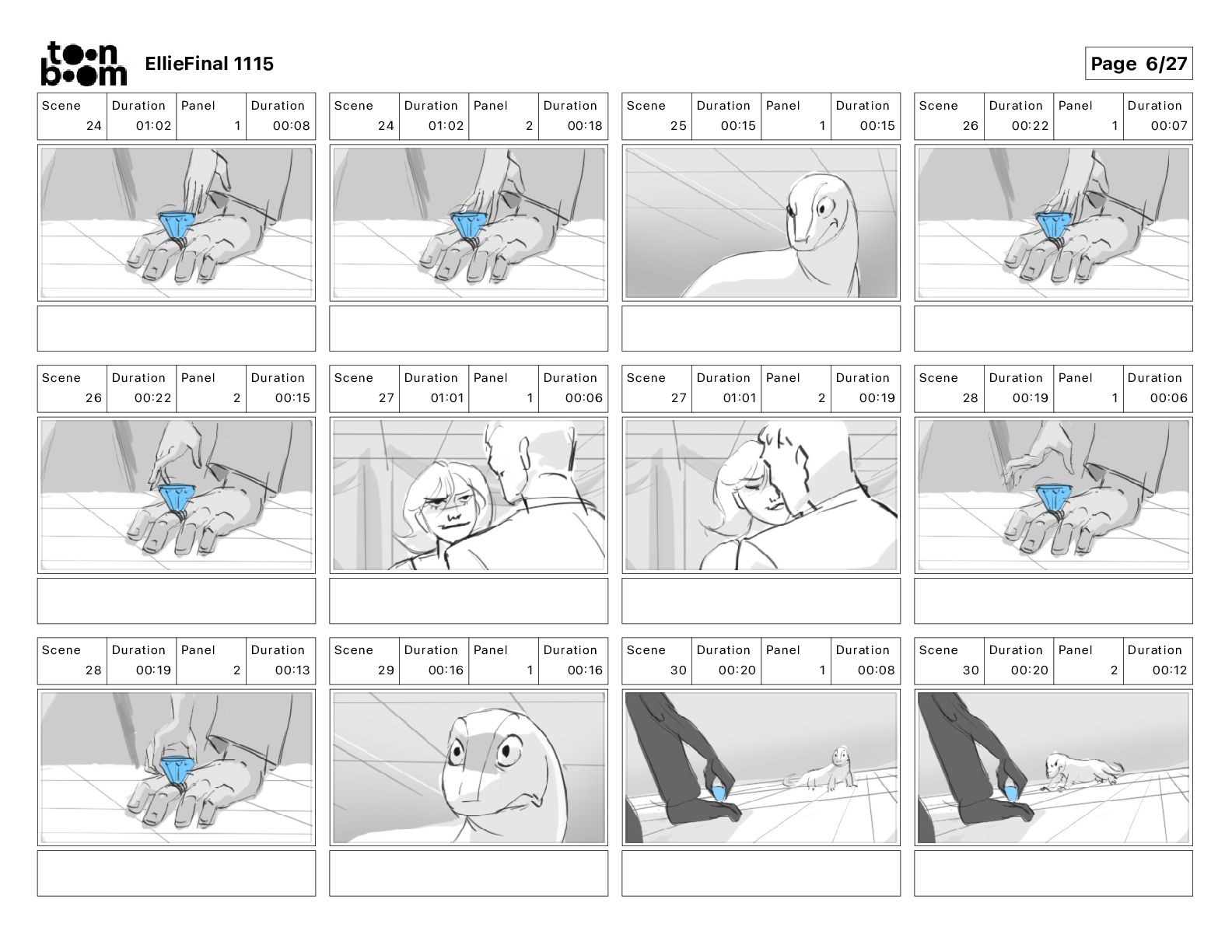 Scene 100 Duration 00 16 Panel 1 Duration 00 06 Scene 100 Duration 00 16 Panel 2 Duration 00 10 Scene 101 Duration 00 22 Panel 1 Duration 00 11 Scene 101 Duration 00 22 Panel 2 Duration 00 11 Scene 102 Duration 01 04 Panel 1 Duration 00 15 Scene 102 Duration 01 04 Panel 2 Duration 00 13 Scene 103 Duration 02 16 Panel 1 Duration 00 16 Scene 103 Duration 02 16 Panel 2 Duration 00 15 Scene 103 Duration 02 16 Panel 3 Duration 00 13 Scene 103 Duration 02 16 Panel 4 Duration 00 11 Scene 103 Duration 02 16 Panel 5 Duration 00 09 EllieFinal 1115 Page 22/27