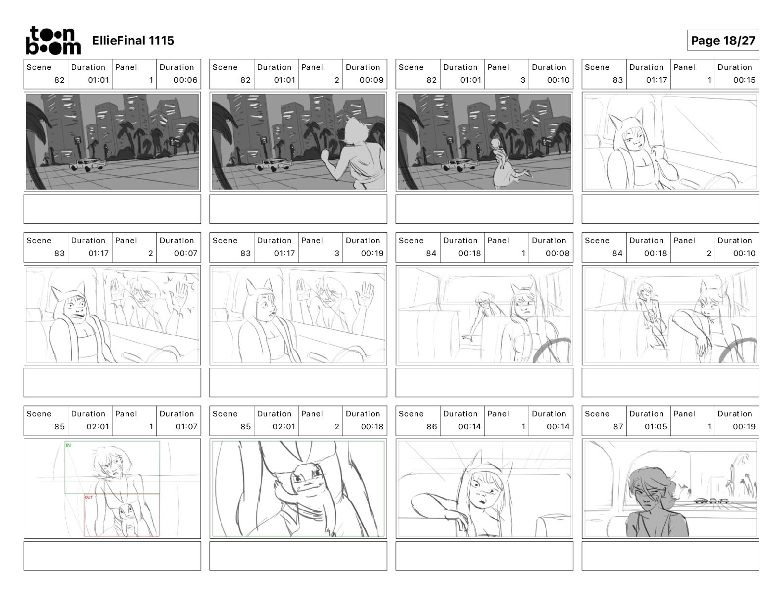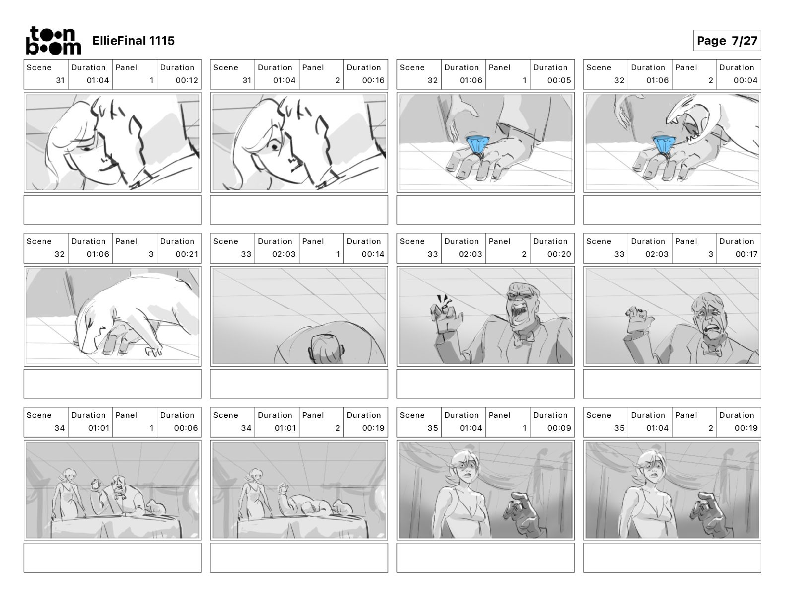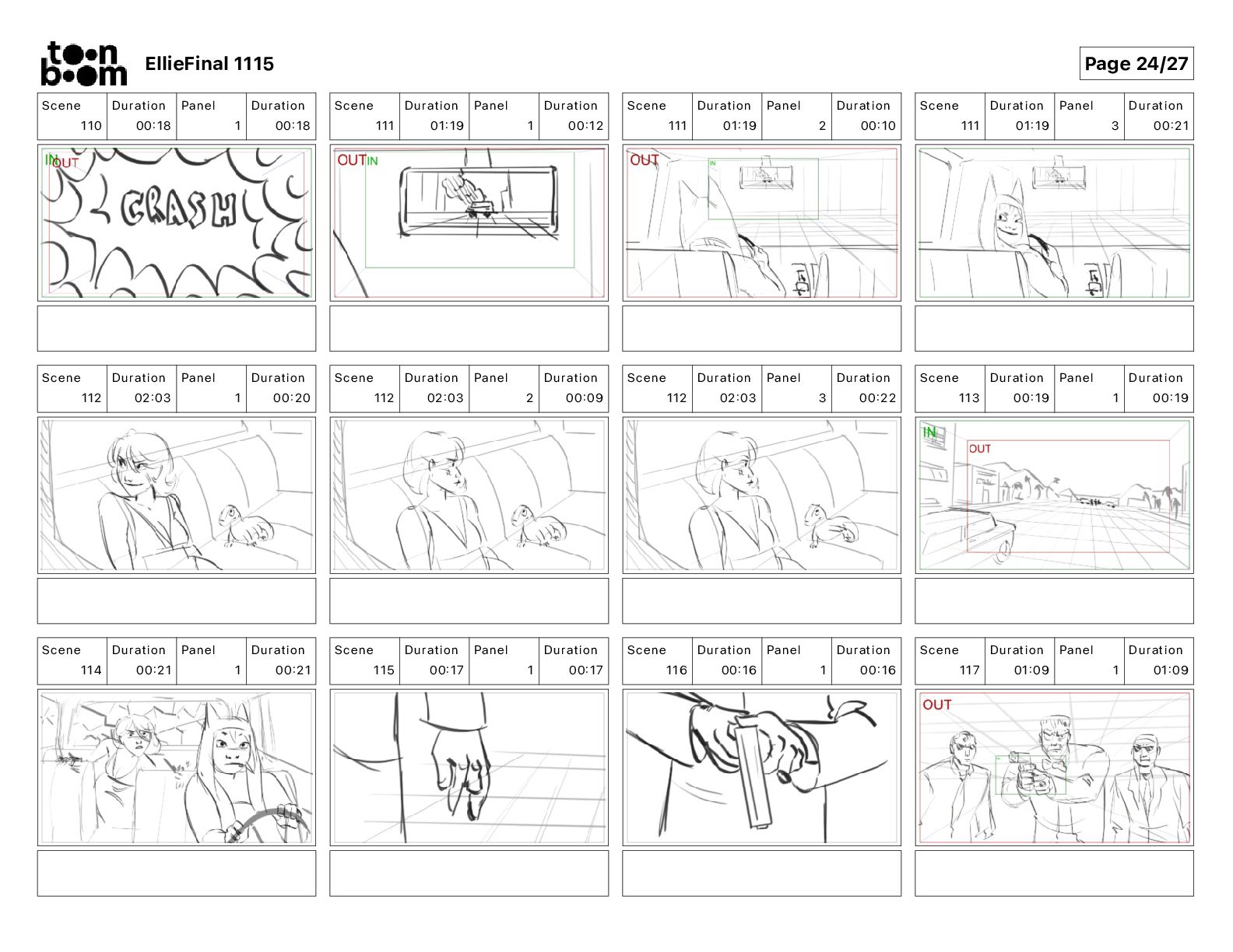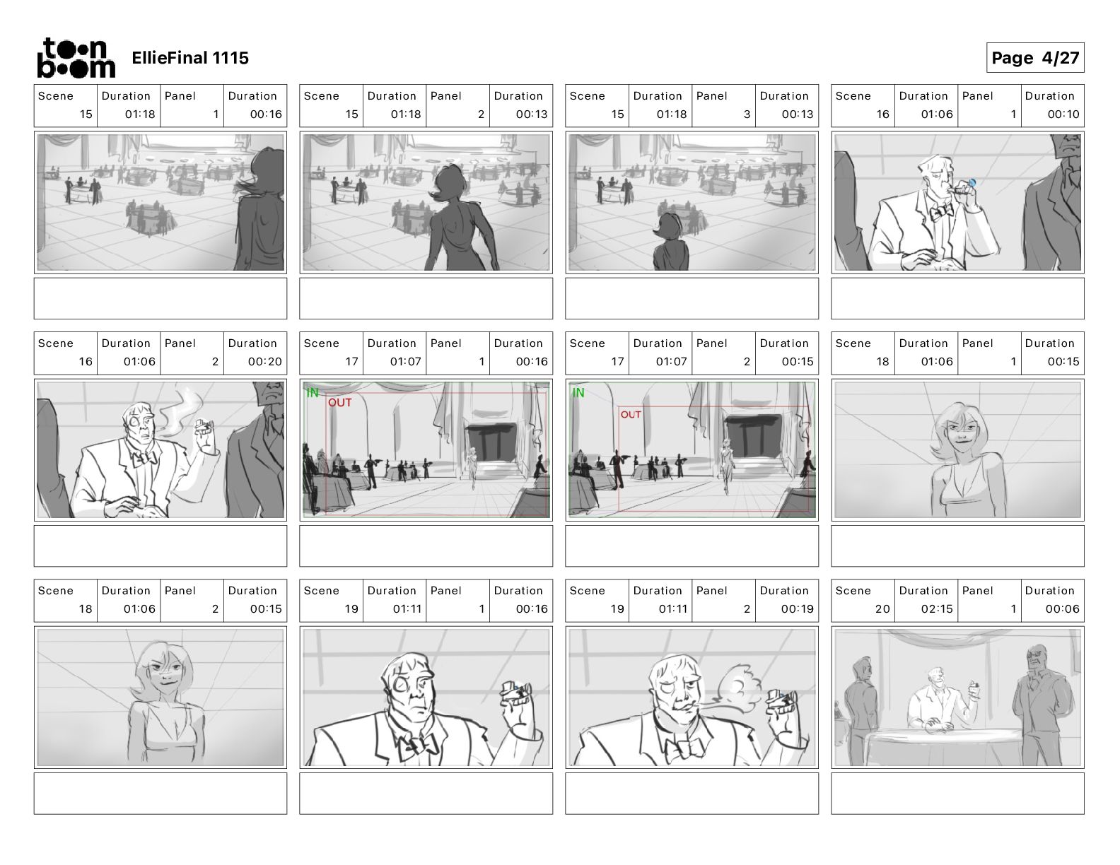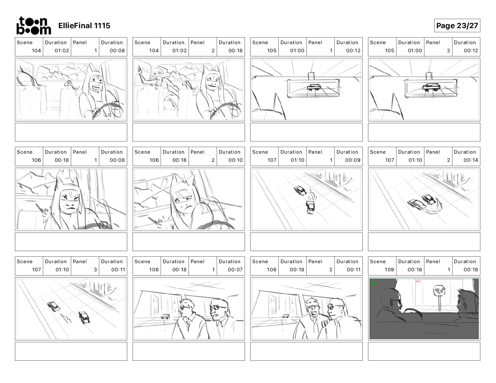 Scene 100 Duration 00 16 Panel 1 Duration 00 06 Scene 100 Duration 00 16 Panel 2 Duration 00 10 Scene 101 Duration 00 22 Panel 1 Duration 00 11 Scene 101 Duration 00 22 Panel 2 Duration 00 11 Scene 102 Duration 01 04 Panel 1 Duration 00 15 Scene 102 Duration 01 04 Panel 2 Duration 00 13 Scene 103 Duration 02 16 Panel 1 Duration 00 16 Scene 103 Duration 02 16 Panel 2 Duration 00 15 Scene 103 Duration 02 16 Panel 3 Duration 00 13 Scene 103 Duration 02 16 Panel 4 Duration 00 11 Scene 103 Duration 02 16 Panel 5 Duration 00 09 EllieFinal 1115 Page 22/27