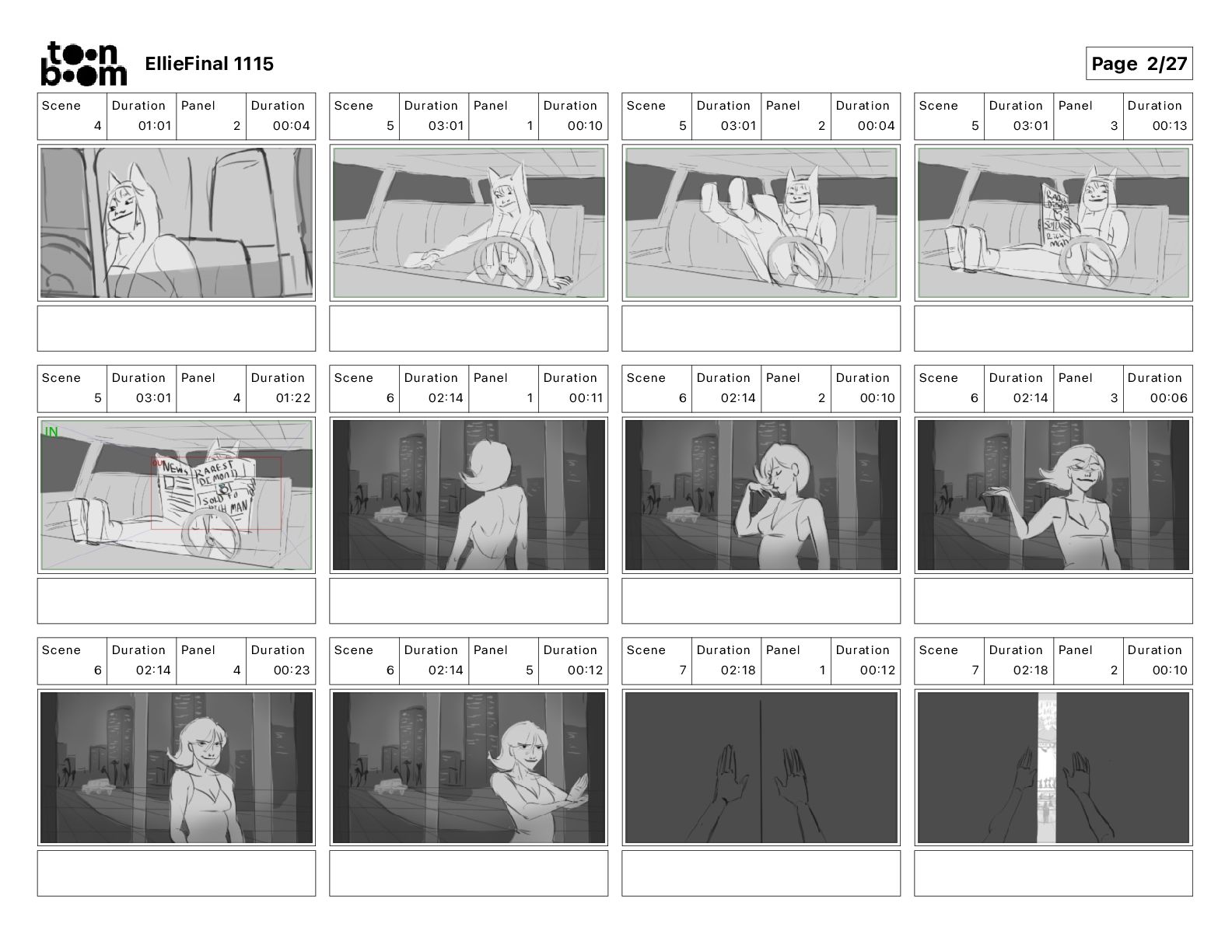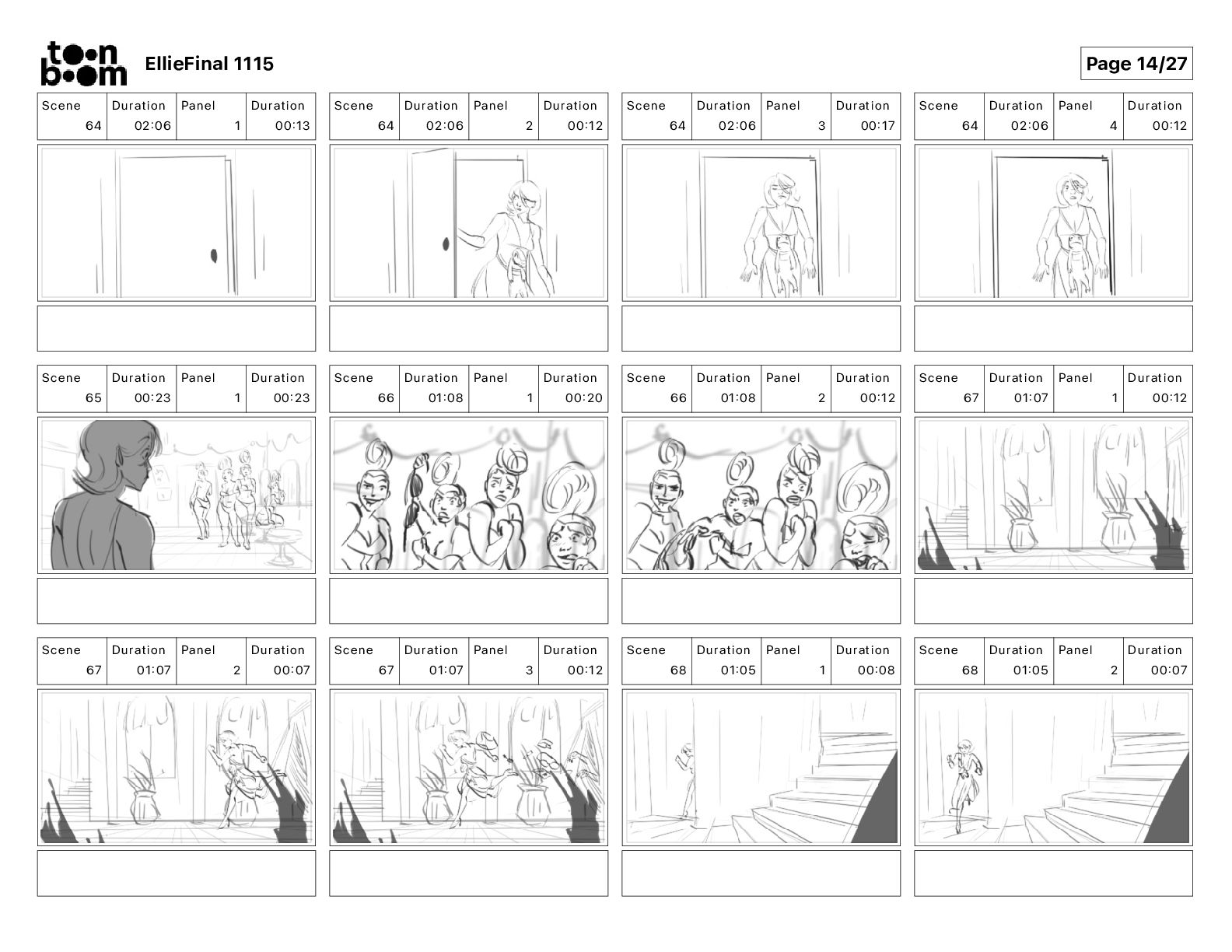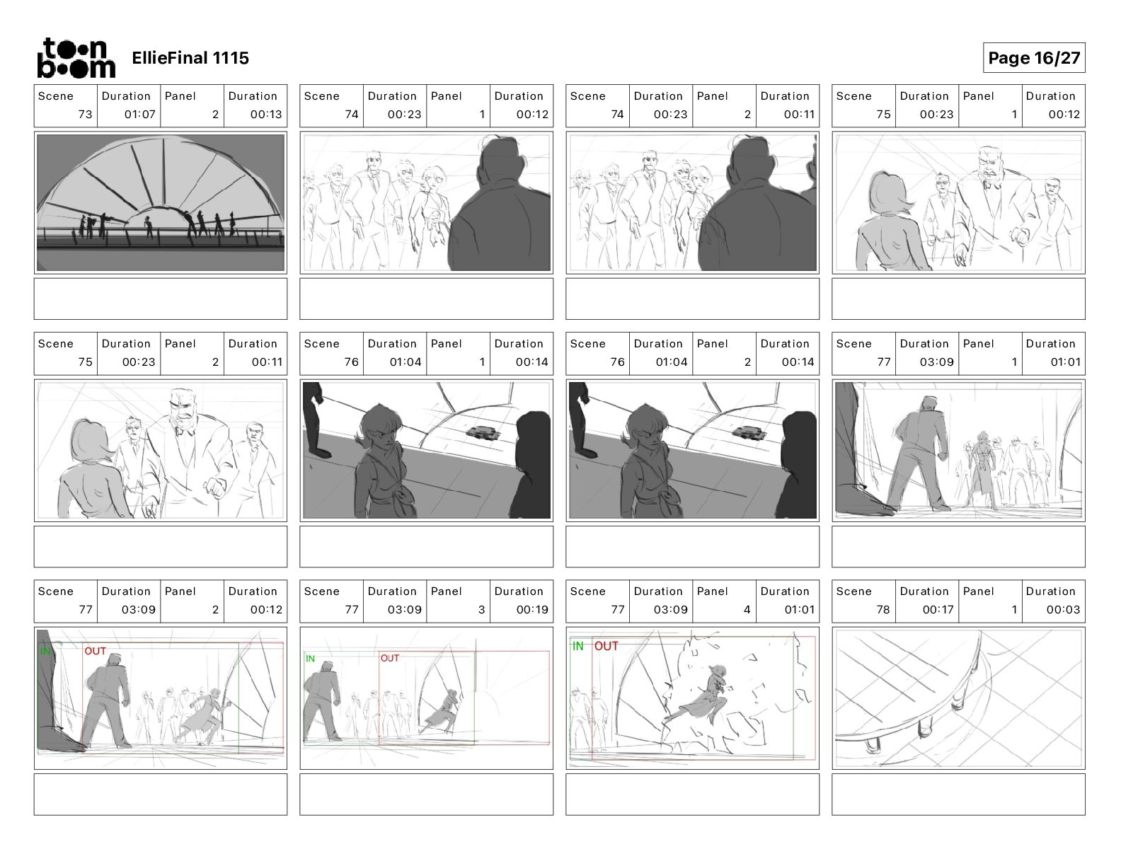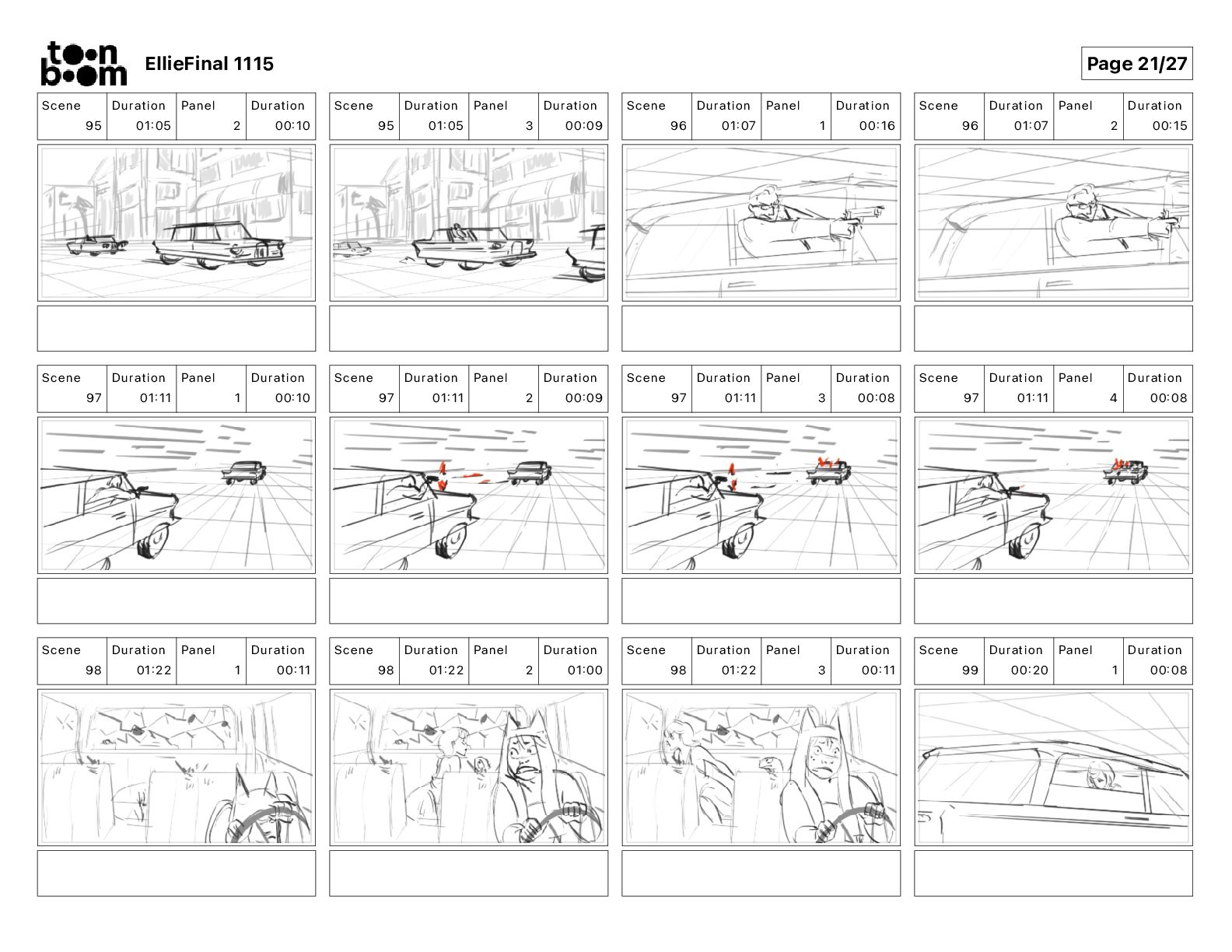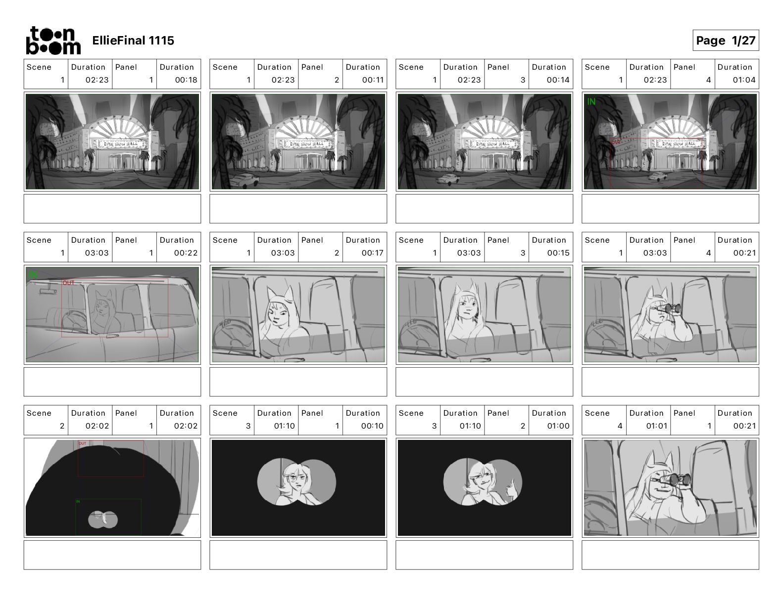 Scene 100 Duration 00 16 Panel 1 Duration 00 06 Scene 100 Duration 00 16 Panel 2 Duration 00 10 Scene 101 Duration 00 22 Panel 1 Duration 00 11 Scene 101 Duration 00 22 Panel 2 Duration 00 11 Scene 102 Duration 01 04 Panel 1 Duration 00 15 Scene 102 Duration 01 04 Panel 2 Duration 00 13 Scene 103 Duration 02 16 Panel 1 Duration 00 16 Scene 103 Duration 02 16 Panel 2 Duration 00 15 Scene 103 Duration 02 16 Panel 3 Duration 00 13 Scene 103 Duration 02 16 Panel 4 Duration 00 11 Scene 103 Duration 02 16 Panel 5 Duration 00 09 EllieFinal 1115 Page 22/27