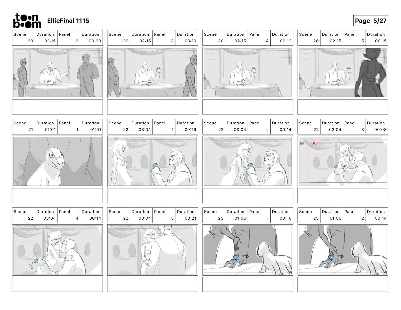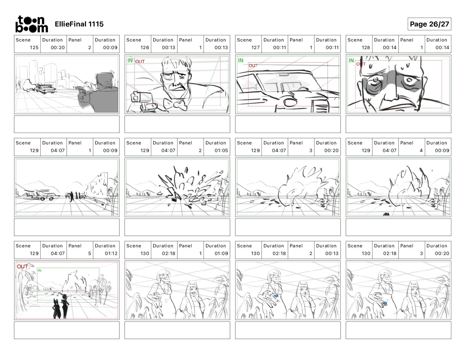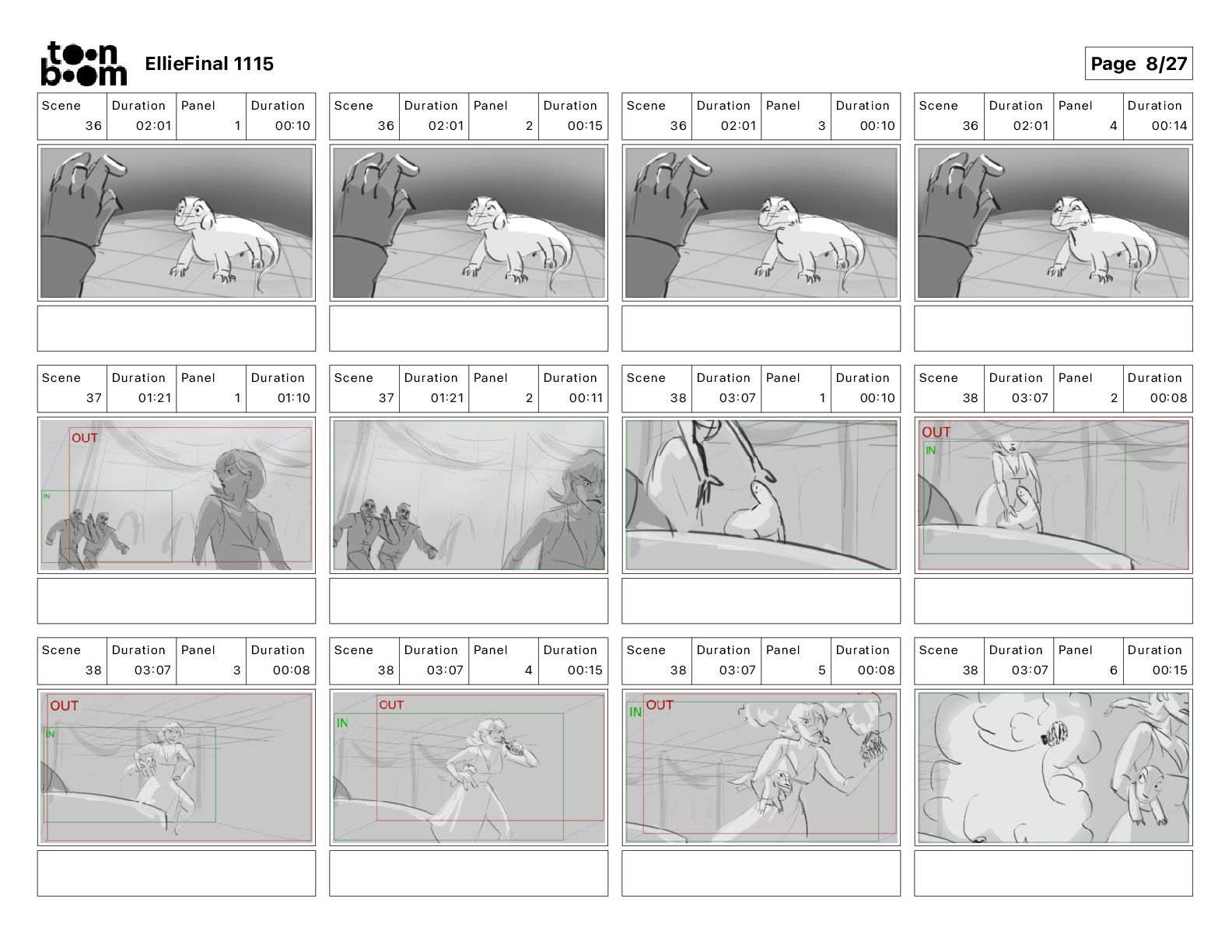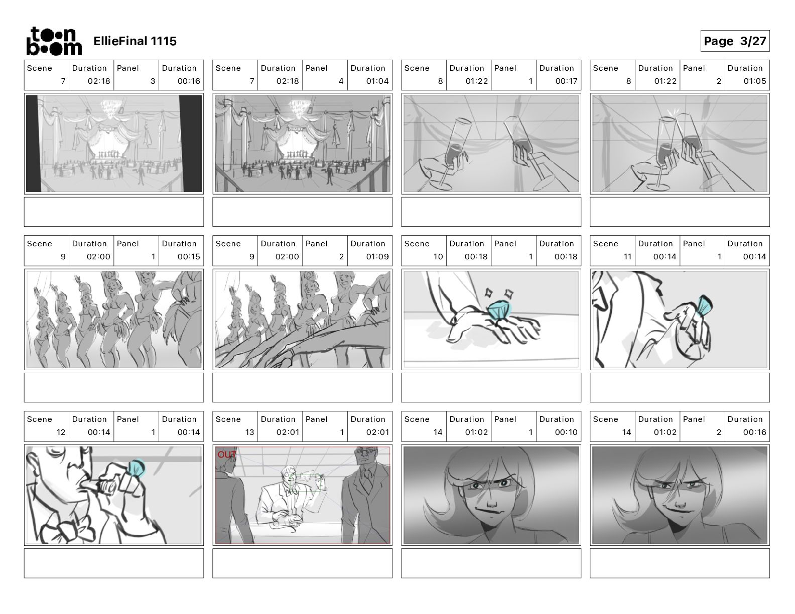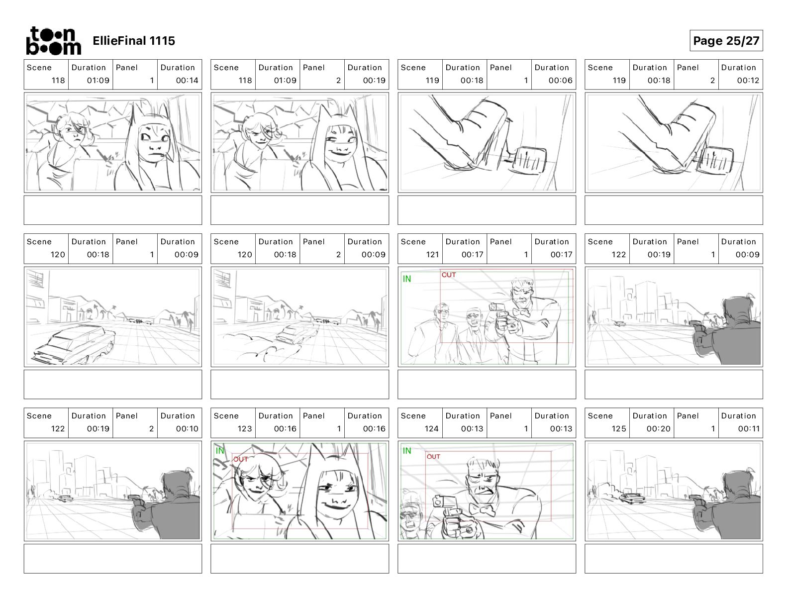 Scene 100 Duration 00 16 Panel 1 Duration 00 06 Scene 100 Duration 00 16 Panel 2 Duration 00 10 Scene 101 Duration 00 22 Panel 1 Duration 00 11 Scene 101 Duration 00 22 Panel 2 Duration 00 11 Scene 102 Duration 01 04 Panel 1 Duration 00 15 Scene 102 Duration 01 04 Panel 2 Duration 00 13 Scene 103 Duration 02 16 Panel 1 Duration 00 16 Scene 103 Duration 02 16 Panel 2 Duration 00 15 Scene 103 Duration 02 16 Panel 3 Duration 00 13 Scene 103 Duration 02 16 Panel 4 Duration 00 11 Scene 103 Duration 02 16 Panel 5 Duration 00 09 EllieFinal 1115 Page 22/27