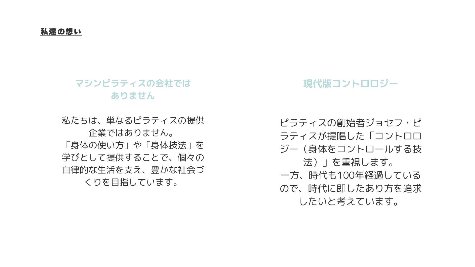 私達の想い マシンピラティスの会社では ありません 私たちは、単なるピラティスの提供 企業ではありません。 「身体の使い方」や「身体技法」を 学びとして提供することで、個々の 自律的な生活を支え、豊かな社会づ くりを目指しています。 現代版コントロロジー