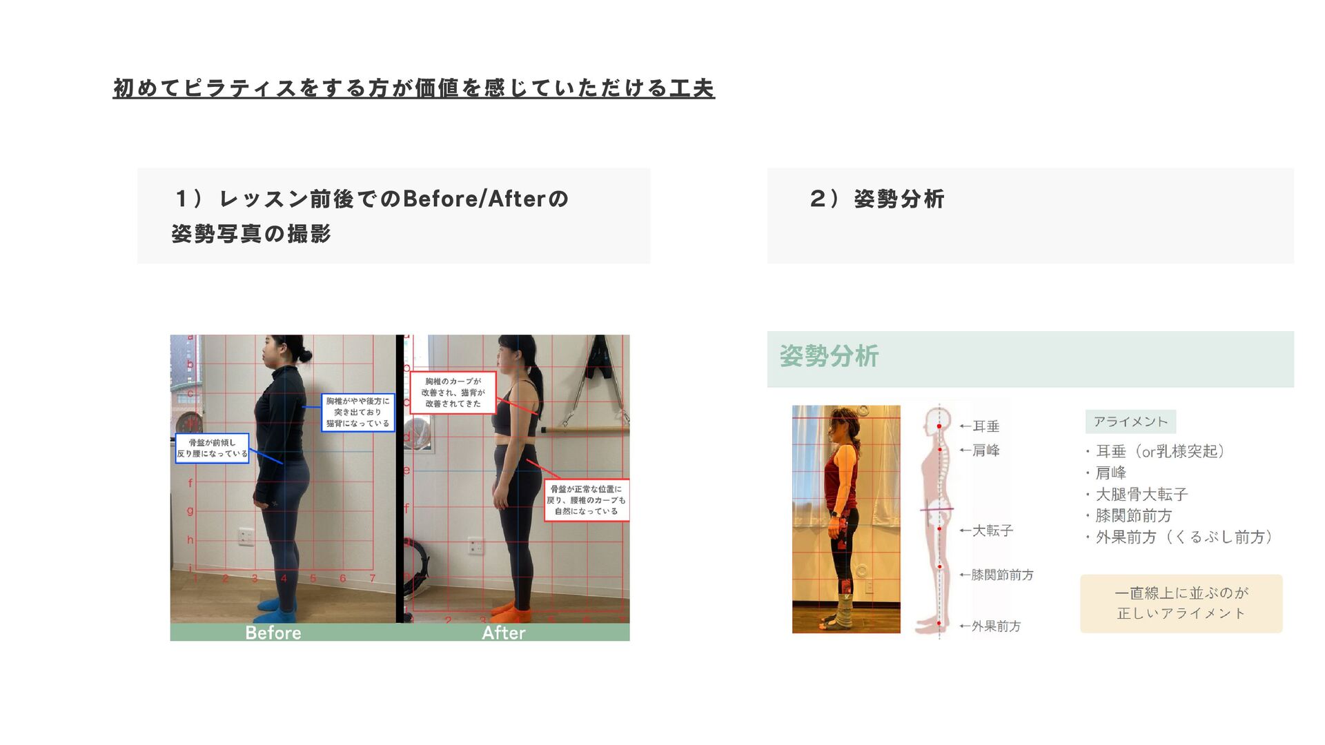 初めてピラティスをする方が価値を感じていただける工夫 1)レッスン前後でのBefore/Afterの 姿勢写真の撮影 2)姿勢分析