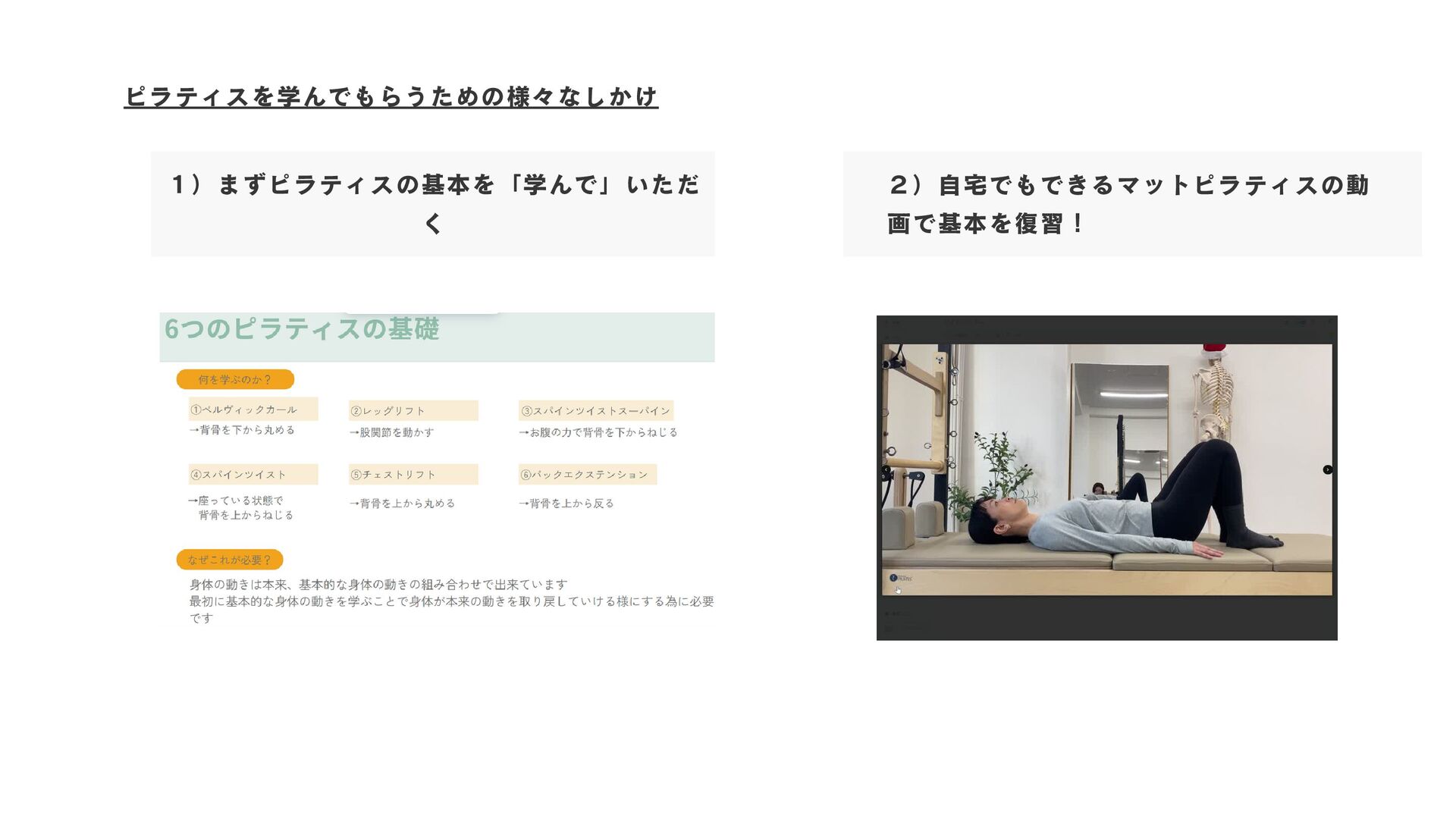 1)まずピラティスの基本を「学んで」いただ く ピラティスを学んでもらうための様々なしかけ 2)自宅でもできるマットピラティスの動 画で基本を復習!
