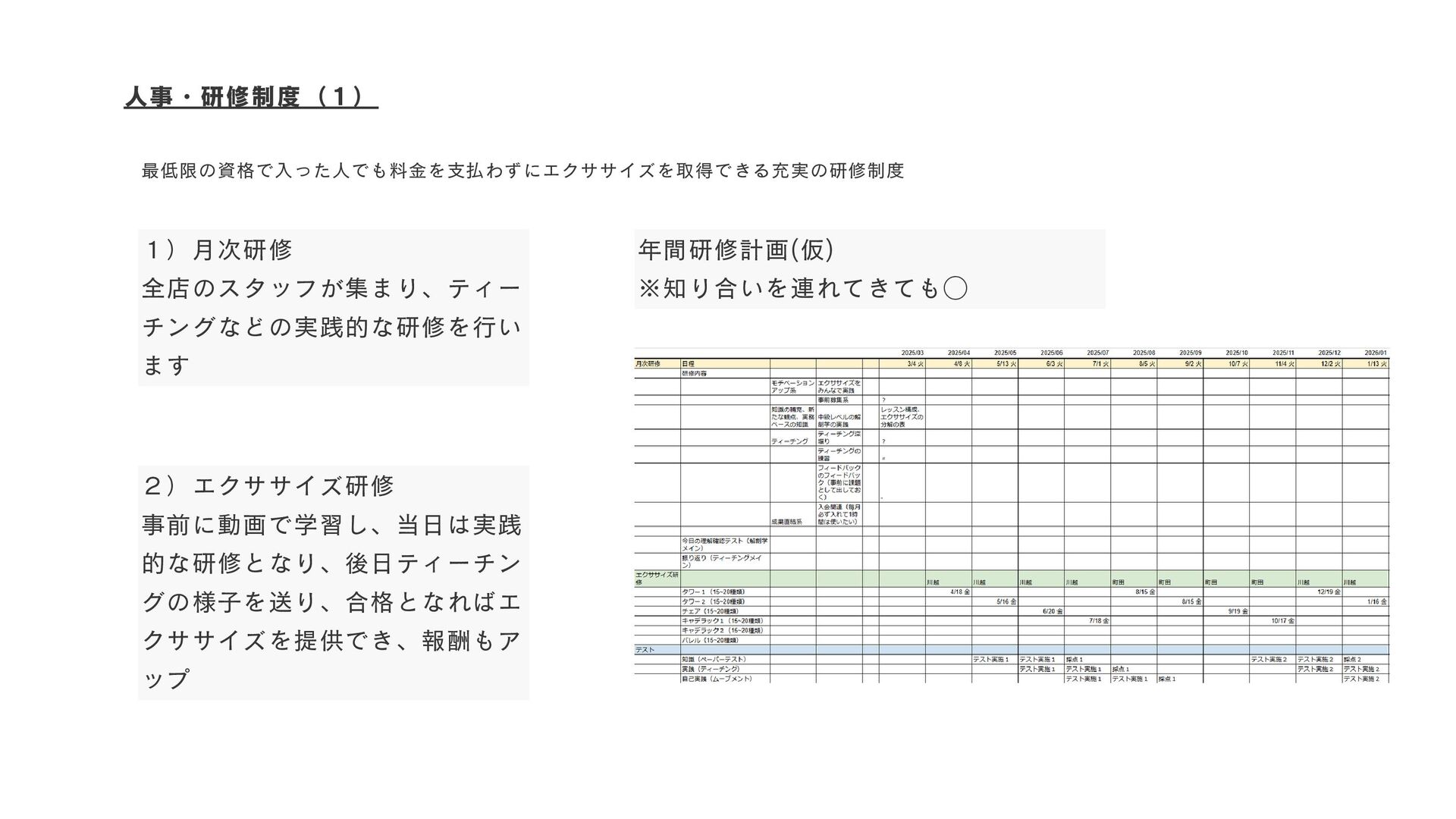 人事・研修制度(1) 1)月次研修 全店のスタッフが集まり、ティー チングなどの実践的な研修を行い ます 2)エクササイズ研修 事前に動画で学習し、当日は実践 的な研修となり、後日ティーチン グの様子を送り、合格となればエ クササイズを提供でき、報酬もア