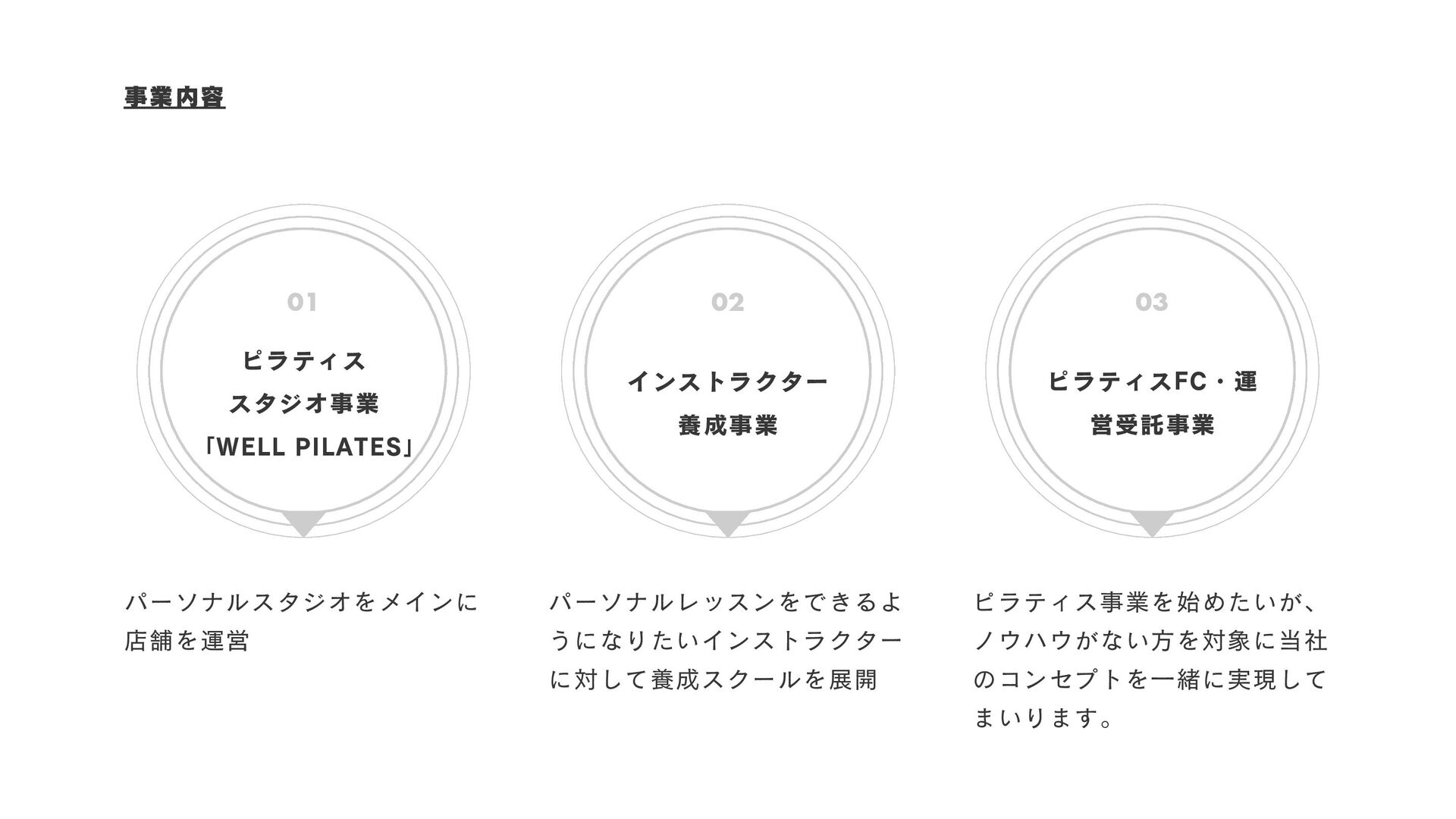 店舗を運営 パーソナルレッスンをできるよ うになりたいインストラクター に対して養成スクールを展開 ピラティス事業を始めたいが、 ノウハウがない方を対象に当社 のコンセプトを一緒に実現して まいります。 01 02 03