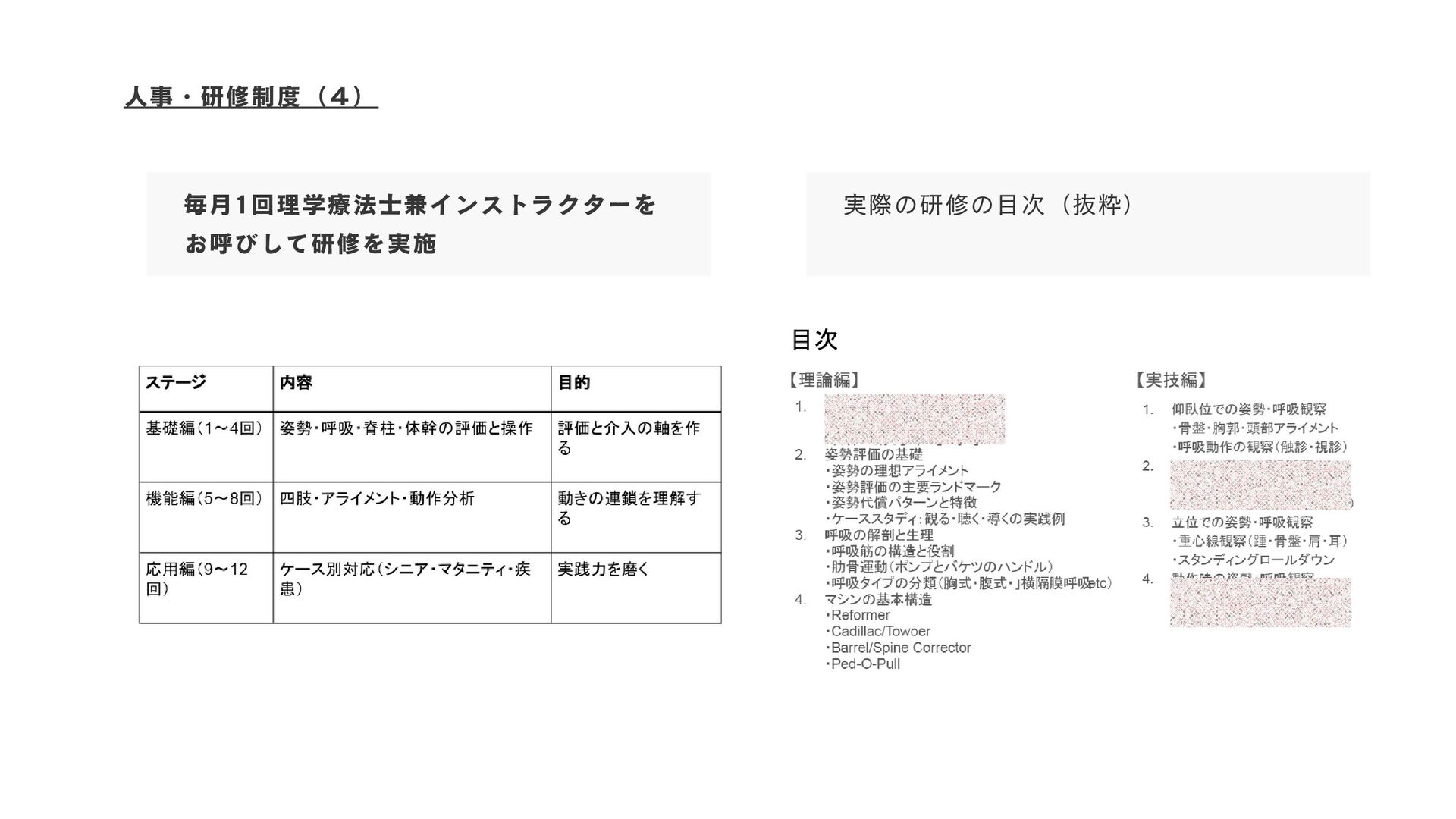 人事・研修制度(4) 毎月1回理学療法士兼インストラクターを お呼びして研修を実施 実際の研修の目次(抜粋)