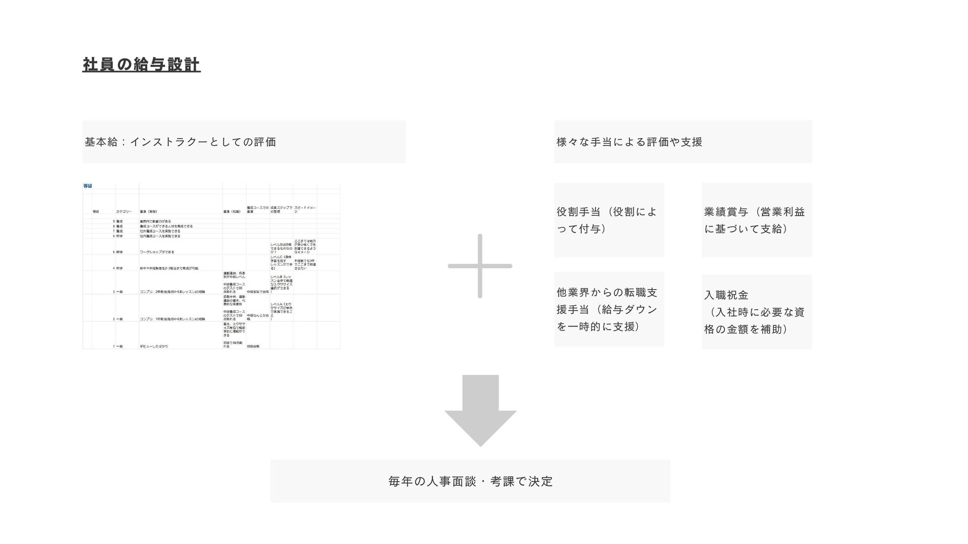 基本給:インストラクーとしての評価 毎年の人事面談・考課で決定 様々な手当による評価や支援 役割手当(役割によ って付与) 業績賞与(営業利益 に基づいて支給) 他業界からの転職支 援手当(給与ダウン を一時的に支援)