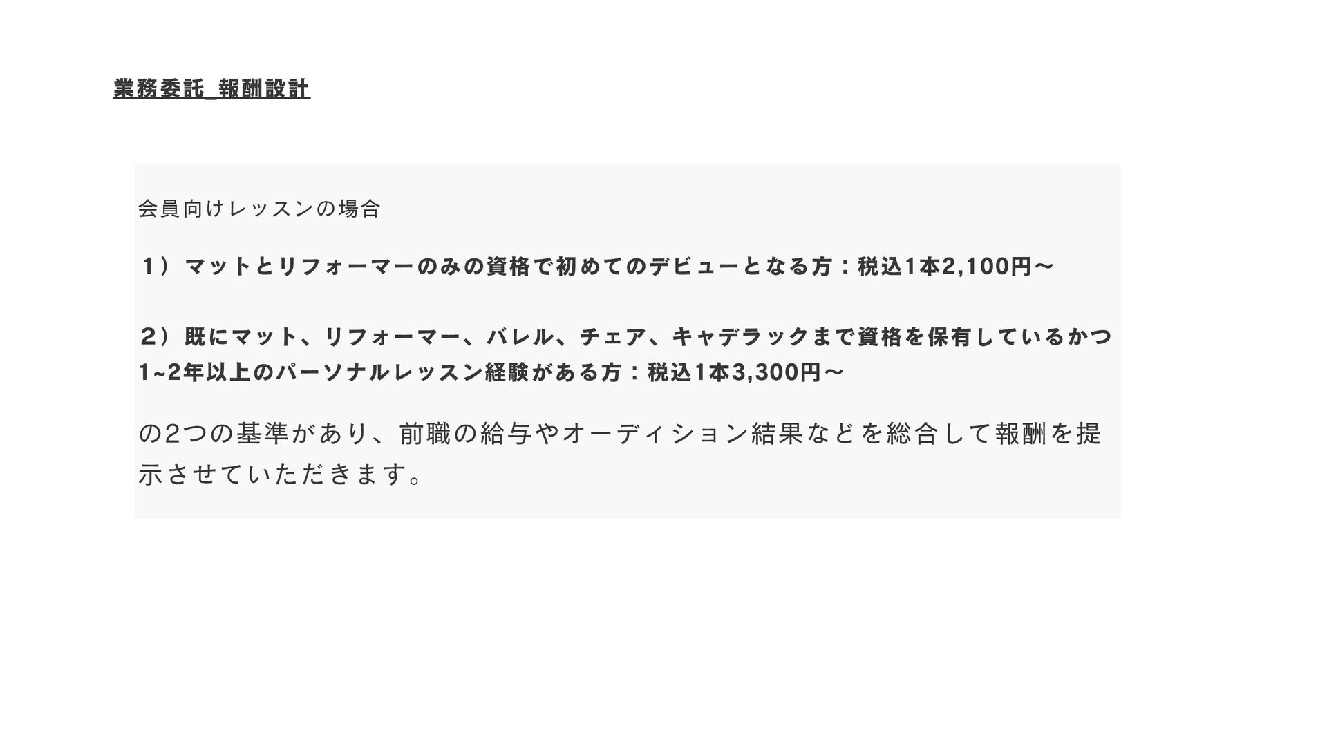 会員向けレッスンの場合 1)マットとリフォーマーのみの資格で初めてのデビューとなる方:税込1本2,100円~ 2)既にマット、リフォーマー、バレル、チェア、キャデラックまで資格を保有しているかつ 1~2年以上のパーソナルレッスン経験がある方:税込1本3,300円~ の2つの基準があり、前職の給与やオーディション結果などを総合して報酬を提 示させていただきます。 業務委託_報酬設計