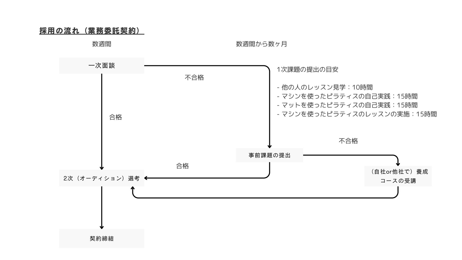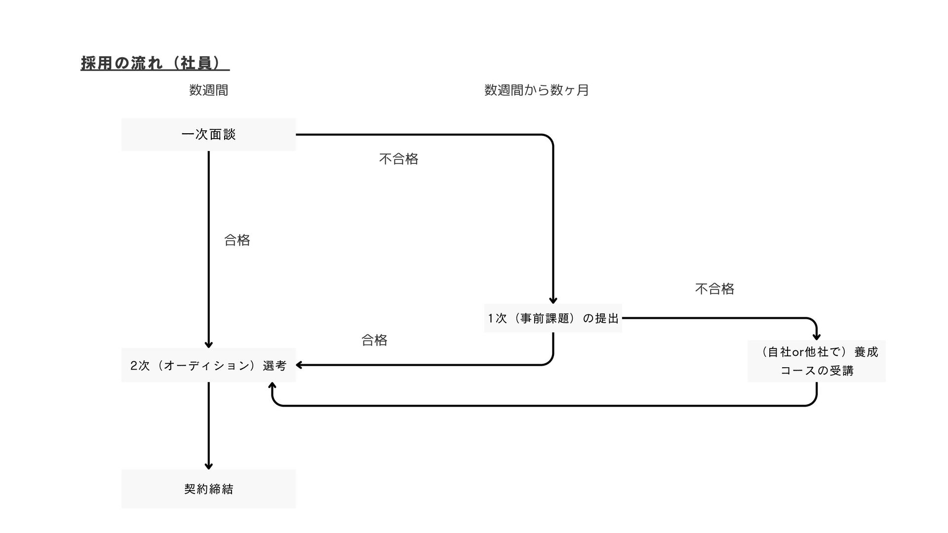 一次面談 1次(事前課題)の提出 2次(オーディション)選考 (自社or他社で)養成 コースの受講 契約締結 採用の流れ(社員) 数週間 数週間から数ヶ月 不合格
