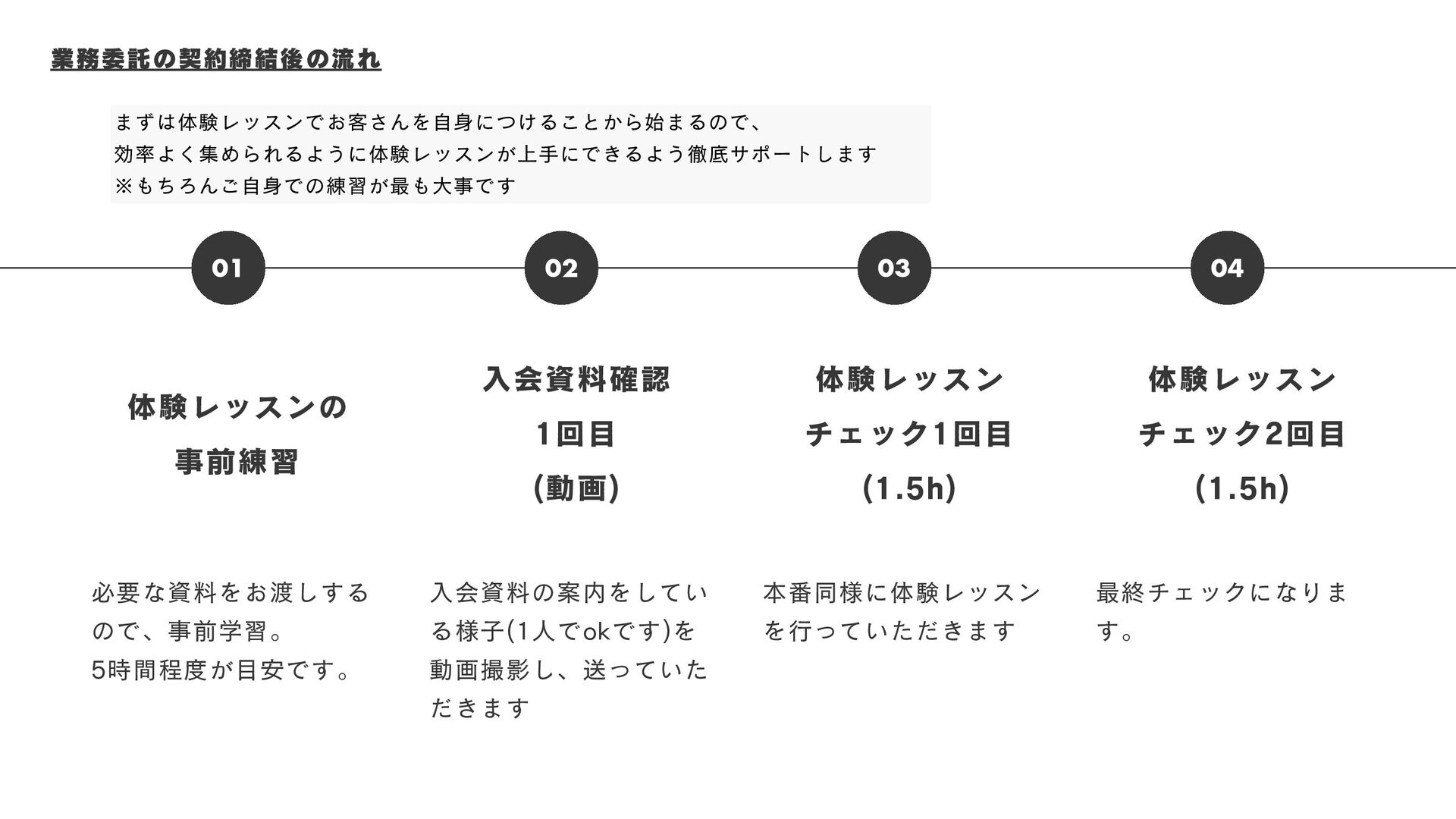 業務委託の契約締結後の流れ 入会資料確認 1回目 (動画) 入会資料の案内をしてい る様子(1人でokです)を 動画撮影し、送っていた だきます 01 体験レッスン