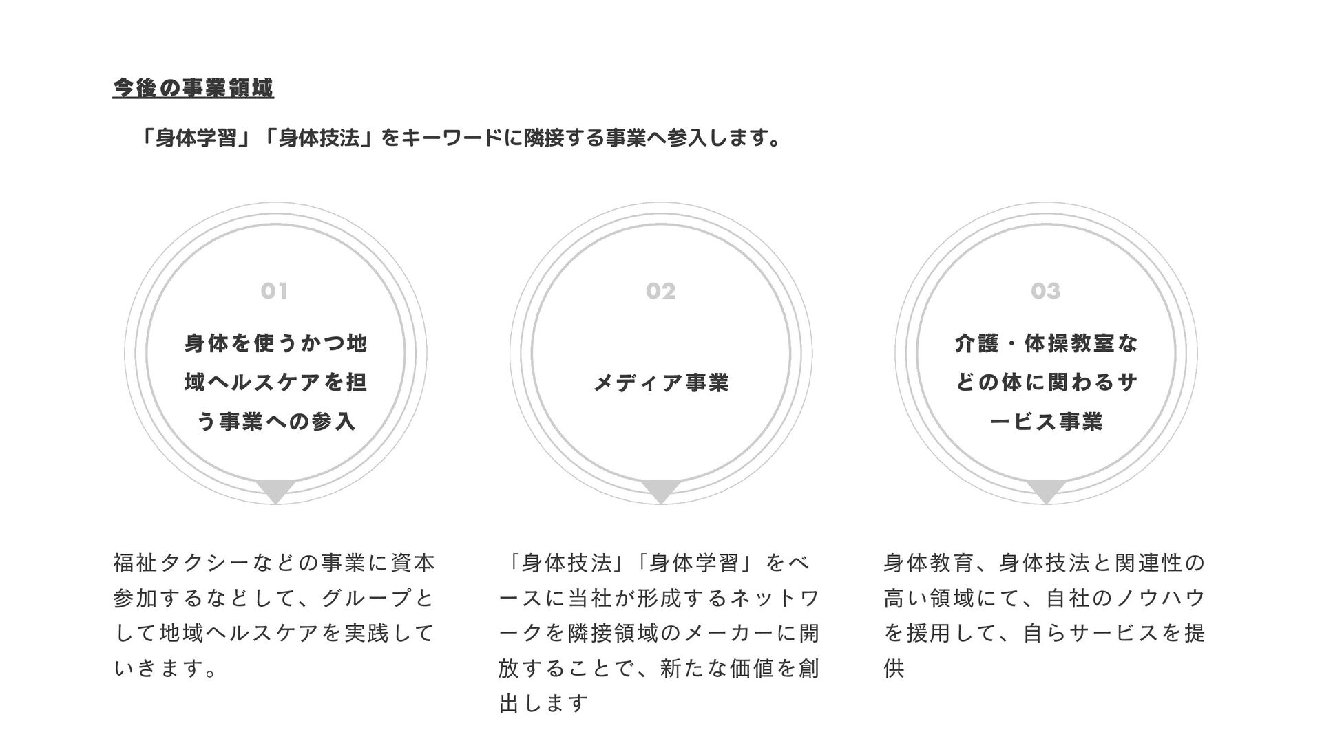 して地域ヘルスケアを実践して いきます。 「身体技法」 「身体学習」をベ ースに当社が形成するネットワ ークを隣接領域のメーカーに開 放することで、新たな価値を創 出します 身体教育、身体技法と関連性の 高い領域にて、自社のノウハウ を援用して、自らサービスを提 供 01 02 03 「身体学習」「身体技法」をキーワードに隣接する事業へ参入します。
