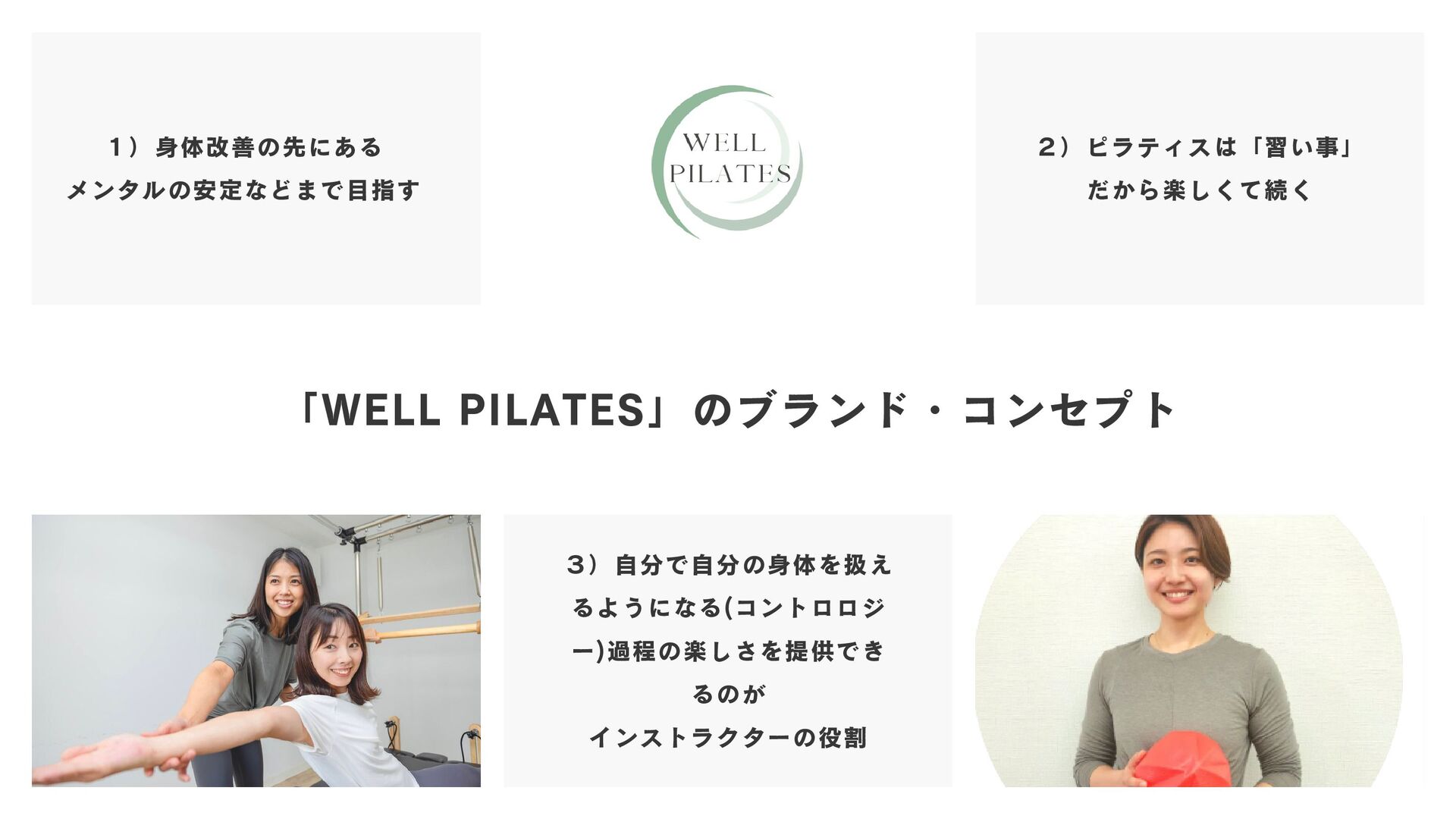 「WELL PILATES」のブランド・コンセプト 3)自分で自分の身体を扱え るようになる(コントロロジ ー)過程の楽しさを提供でき るのが インストラクターの役割 1)身体改善の先にある メンタルの安定などまで目指す 2)ピラティスは「習い事」