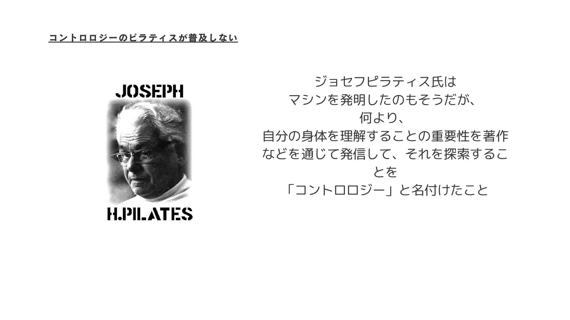 コントロロジーのピラティスが普及しない ジョセフピラティス氏は マシンを発明したのもそうだが、 何より、 自分の身体を理解することの重要性を著作 などを通じて発信して、それを探索するこ とを 「コントロロジー」と名付けたこと