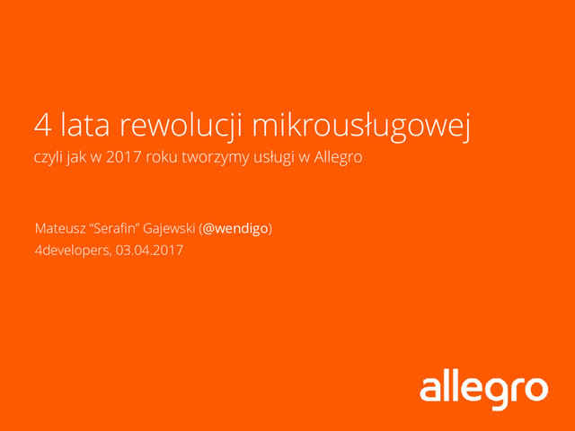 w rolach programisty, Incident Managera, architekta i lidera, • twórca projektu nowej architektury Allegro (a.k.a. Projekt Rubikon), • @wendigo na Twitterze, Githubie, Keybase