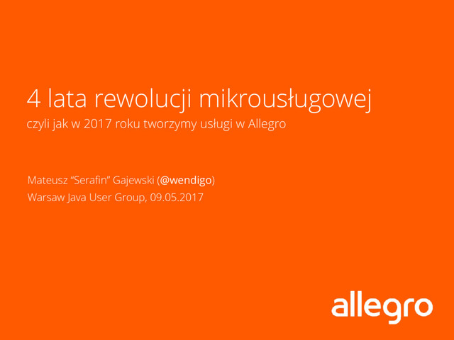 w rolach programisty, Incident Managera (ITILv3), architekta i lidera, • twórca projektu nowej architektury Allegro (a.k.a. Projekt Rubikon), • @wendigo na Twitterze, Githubie, Keybase