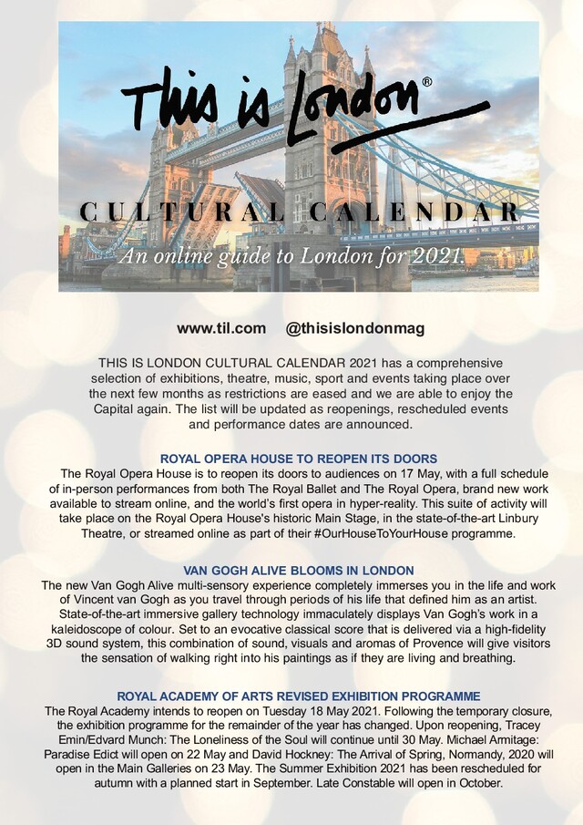 MAKING OF RODIN – Working at the turn of the 20th century, Auguste Rodin created sculptures with an emotion rarely seen before. This major exhibition offers a unique insight into Rodin’s processes, highlighting the crucial role of plaster in his practice. GARDEN MUSEUM The Garden Museum explores and celebrates British gardens and gardening through its collection, temporary exhibitions, events and garden. 3 APRIL TO 24 MAY: SHARA HUGHES – New site specific paintings and works on paper by New York-based artist, a series of large-scale flower paintings which will hang together in the Nave in the heart of the Museum. 14 APRIL TO 30 SEPTEMBER: CONSTANCE SPRY AND THE FASHION FOR FLOWERS – The exhibition will explore Spry’s exceptional life, achievements and legacy, with exclusive access to her archive at the RHS. DESIGN MUSEUM The Design Museum exhibits product, industrial, graphic, fashion, and architectural design. In 2018, the museum won the European Museum of the Year Award. 30 APRIL TO 24 OCTOBER: SNEAKERS UNBOXED: STUDIO TO STREET – A major exhibition exploring one of the most universal design objects, bought and worn by millions of people worldwide every day. HOUSEHOLD CAVALRY MUSEUM Rare, thought provoking and often moving artefacts combined with, friendly and extremely knowledgeable staff, self guided audio visual tours and the opportunity to watch troopers tending to their horses in the working stables. BRITISH LIBRARY The British Library is the national library of the United Kingdom and one of the largest libraries in the world. It is estimated to contain 170–200 million- plus items from many countries. HEBREW MANUSCRIPTS: JOURNEYS OF THE WRITTEN WORLD – Journey beyond the Bible to discover the history, culture and traditions of Jewish people from all corners of the world through the ages. MAY BARBICAN ART GALLERY 17 MAY TO 22 AUGUST: Jean Dubuffet, Brutal Beauty – An exhibition celebrating French artist Jean Dubuffet (1901-1985), one of the most singular and provocative voices in postwar modern art. ROYAL ACADEMY Situated in the heart of London, the Royal Academy is where art is made, exhibited and debated. 23 MAY TO 26 SEPTEMBER: DAVID HOCKNEY: THE ARRIVAL OF SPRING, NORMANDY 2020 – More than 100 pictures produced on an iPad at his home in rural France during lockdown 2020. BRITISH MUSEUM 27 MAY TO 24 OCTOBER: NERO – New exhibition challenges the view of the much-maligned leader who famously fiddled while Rome burned. WHITECHAPEL GALLERY 19 MAY TO 29 AUGUST: EILEEN AGAR: ANGEL OF ANARCHY – Retrospective of work from the British artist who spent time in the company of the cubists and surrealists. Whitechapel Gallery. LATER IN 2021/2022 NATIONAL GALLERY The Nation's Gallery. The story of European art, masterpiece by masterpiece. 11 SEPTEMBER: DECORATIONS: THE BIRTH OF MODERN DECOR – IMPRESSIONIST 9 OCTOBER: POUSSIN AND THE DANCE – Poussin’s paintings and drawings of dance shown alongside the antique sculpture he studied, inviting viewers to trace the evolution of his ideas from marble to paper to paint. 20 NOVEMBER TO 27 FEBRUARY: DURER’S JOURNEYS – Travelogue show chronicling the journeys to the Alps, Venice and the Low Countries, undertaken by the German Renaissance artist. SPRING 2022: RAPHAEL – His life was short, his work prolific, and his legacy immortal. TATE MODERN 15 JULY: SOPHIE TAEUBER-ARP 12 OCTOBER: HYUNDAI COMMISSION: ANICKA YI 25 NOVEMBER: LUBAINA HIMID TATE BRITAIN 7 JULY TO 24 OCTOBER: PAULA REGO – Detailed retrospective of Britain’s greatest female artist. Photo: Norman Wilcox-Geissen Helen Kirkum x Matthew Needham. From Sneakers Unboxed: Studio to Street at the Design Museum. THIS IS LONDON MAGAZINE • THIS IS LONDON ONLINE • www.til.com • @thisislondonmag