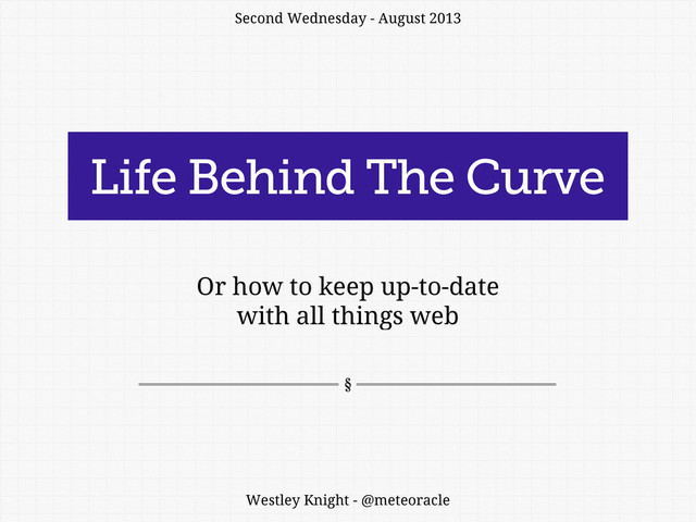 The slides for the first full 30 minute presentation of Life Behind The Curve for the wonderful and friendly people who came to Second Wednesday in Nottingham on 14th August 2013