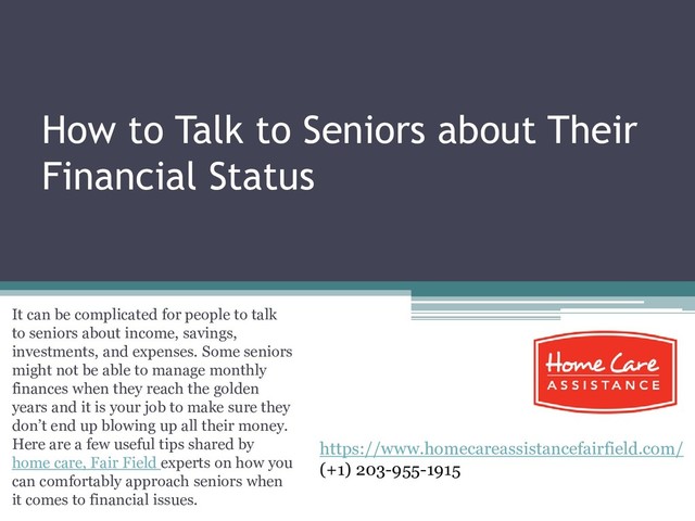 can be complicated for people to talk to seniors about income, savings, investments, and expenses. Some seniors might not be able to manage monthly finances when they reach the golden years and it is your job to make sure they don’t end up blowing up all their money. Here are a few useful tips shared by home care, Fair Field experts on how you can comfortably approach seniors when it comes to financial issues. https://www.homecareassistancefairfield.com/ (+1) 203-955-1915