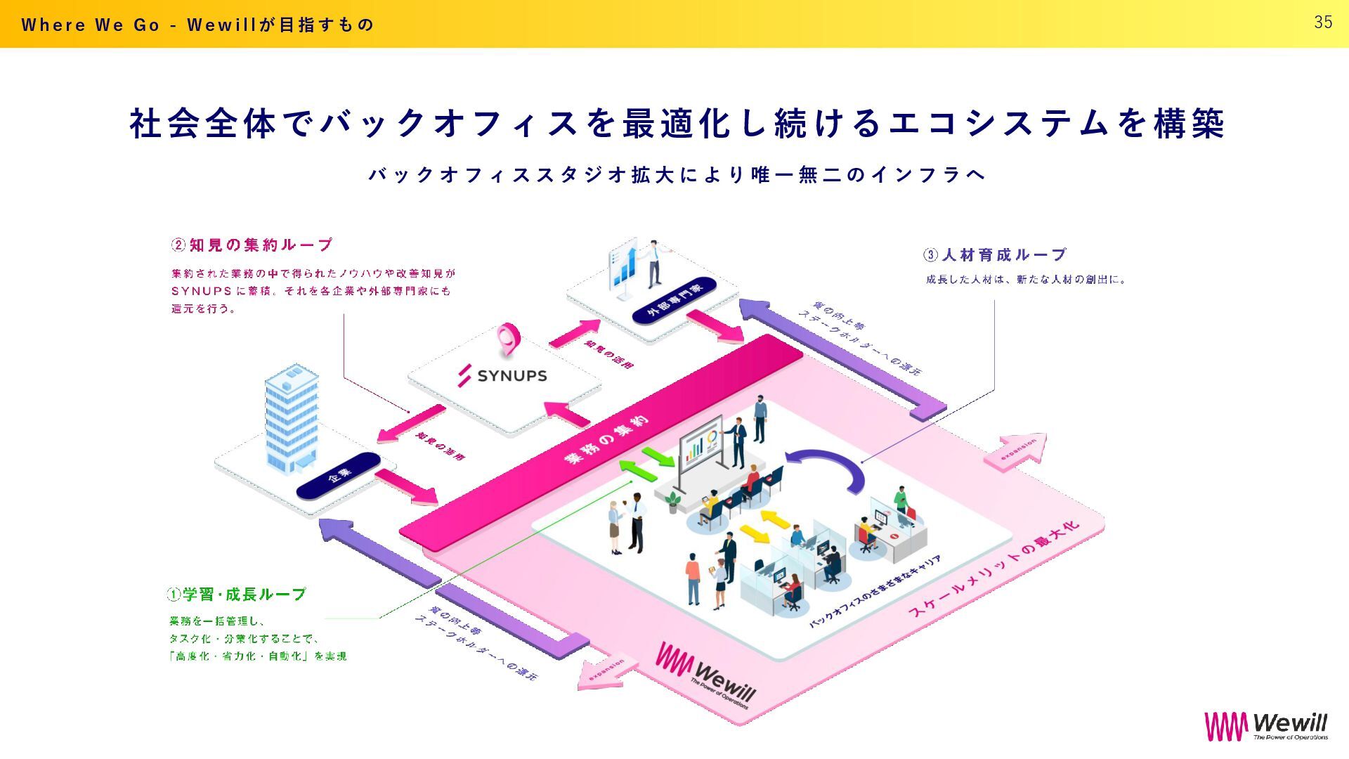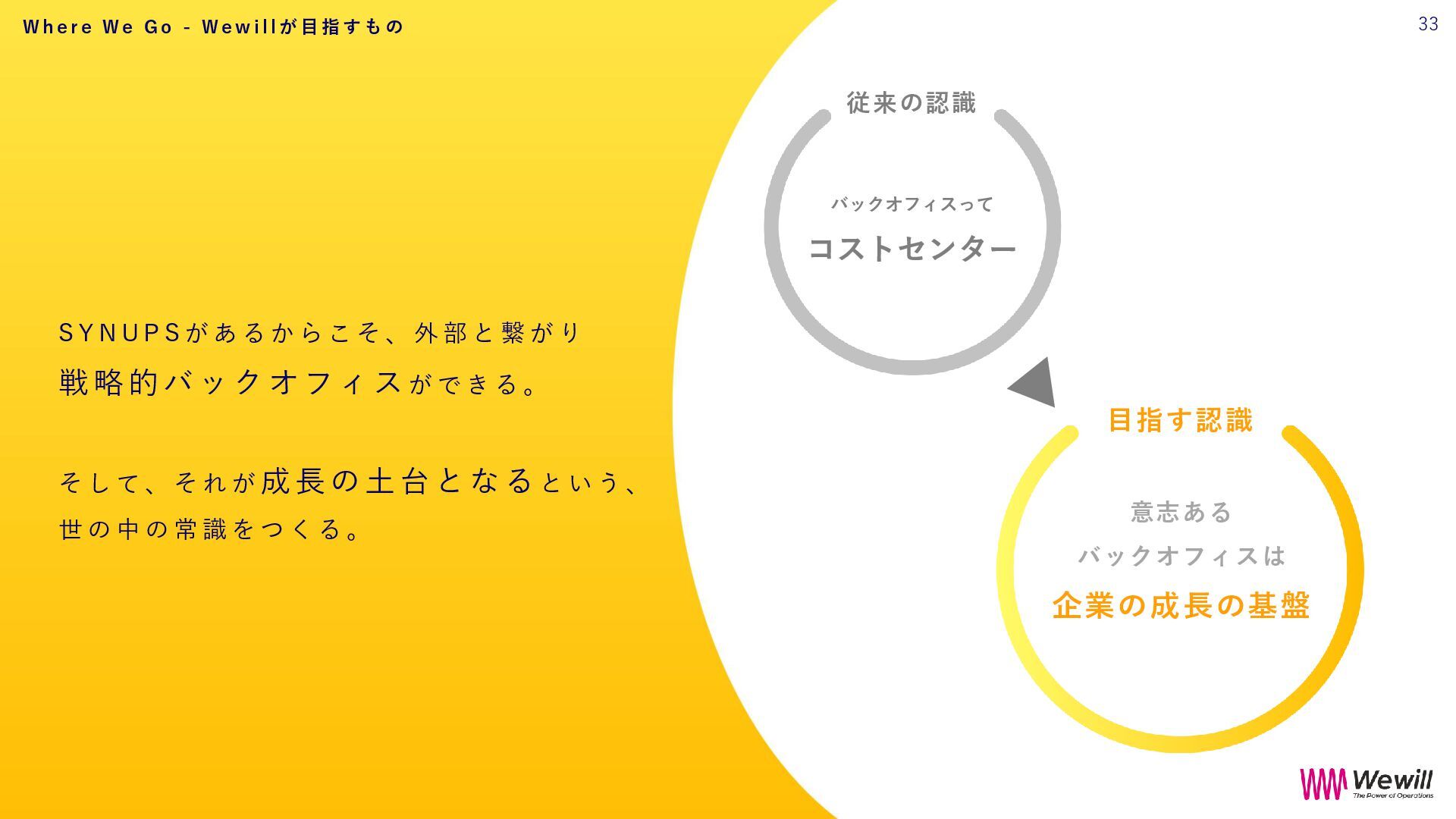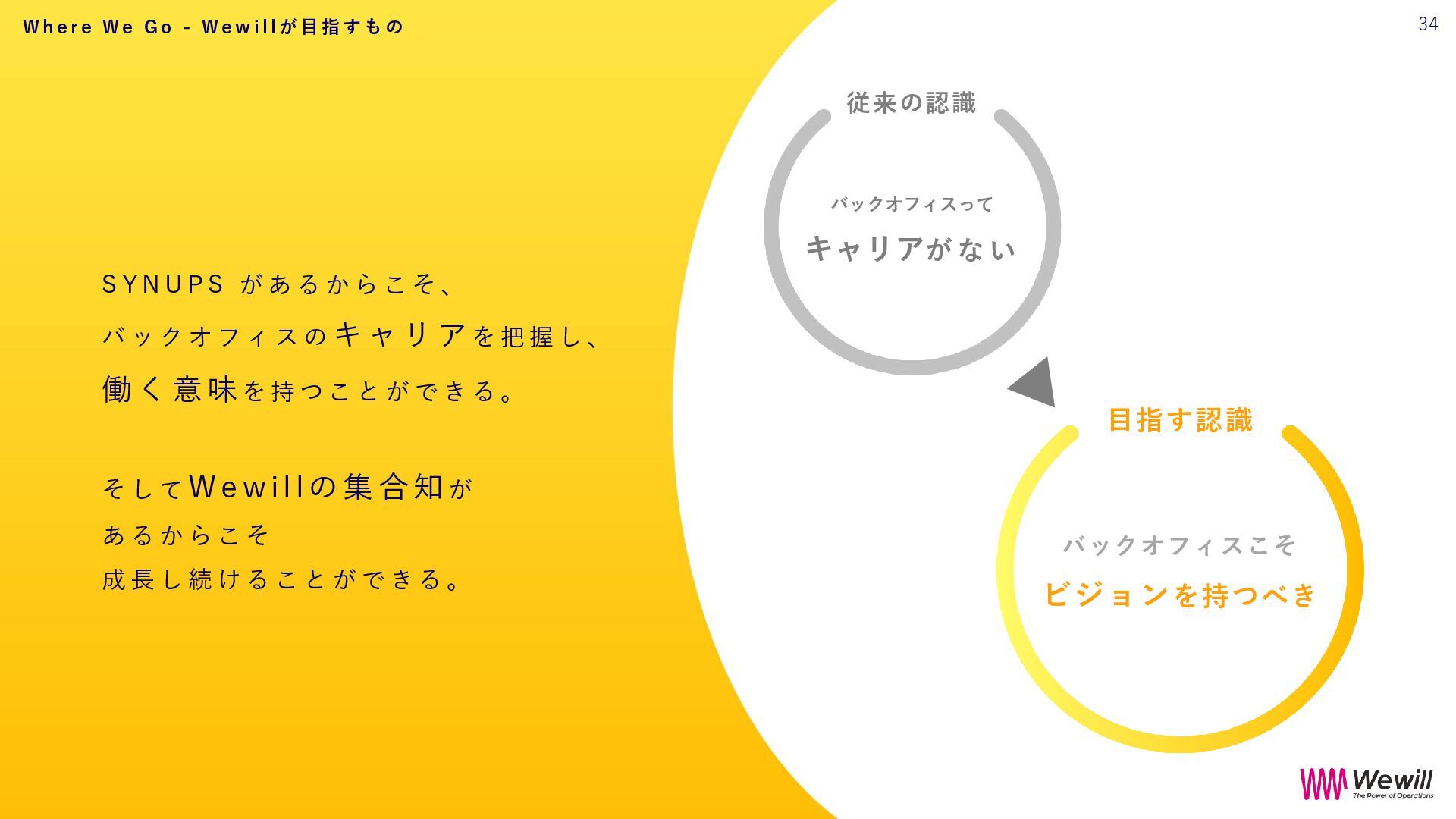 ら こ そ 、 外 部 と 繋 が り 戦略的バックオフィスが で き る 。 そ し て 、 そ れ が 成長の土台となる と い う 、 世 の 中 の 常 識 を つ く る 。 目指す認識 意志ある バックオフィスは 企業の成長の基盤 従来の認識 バックオフィスって コストセンター 33 W h e r e W e G o - W e w i l l が 目 指 す も の