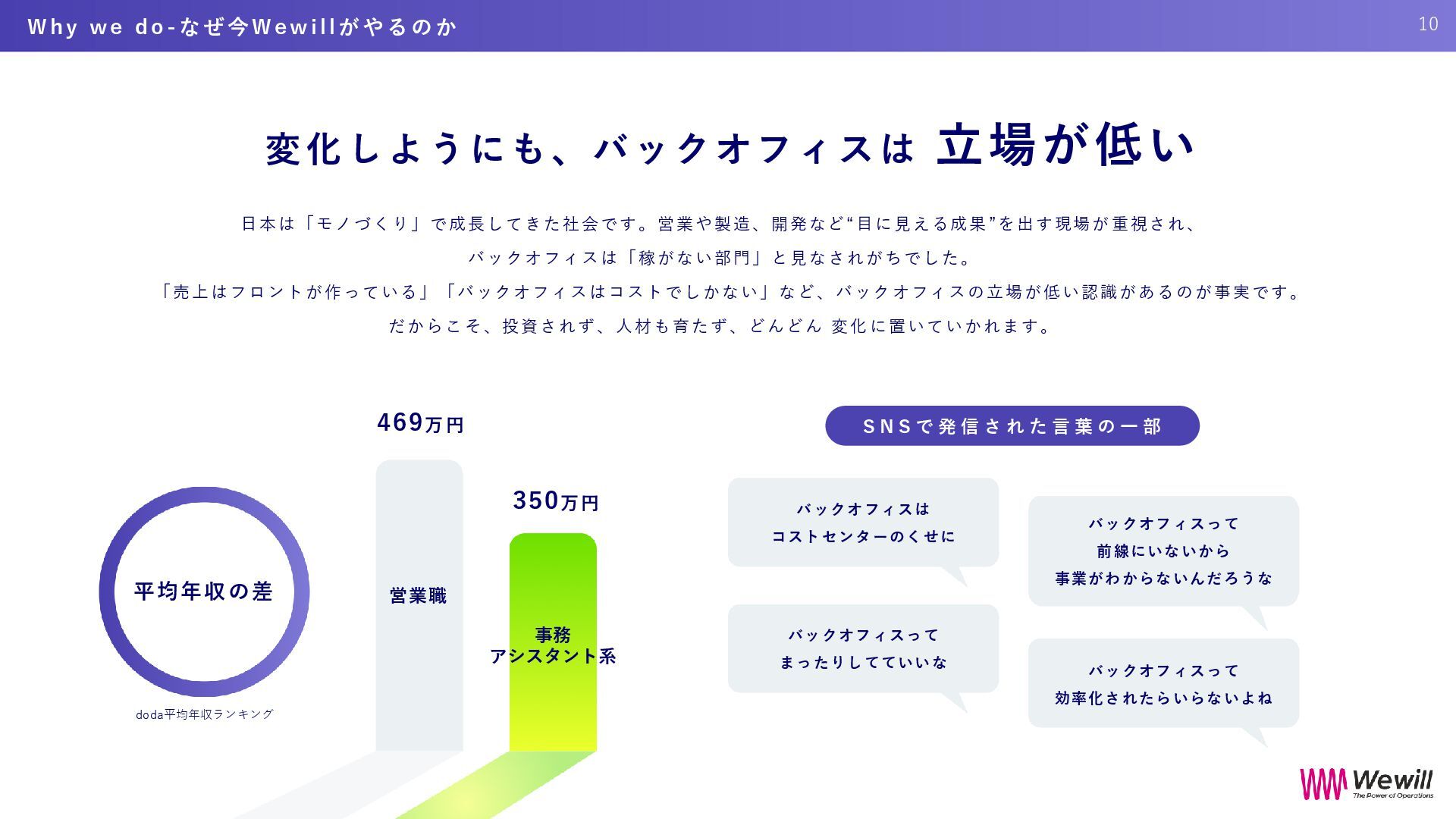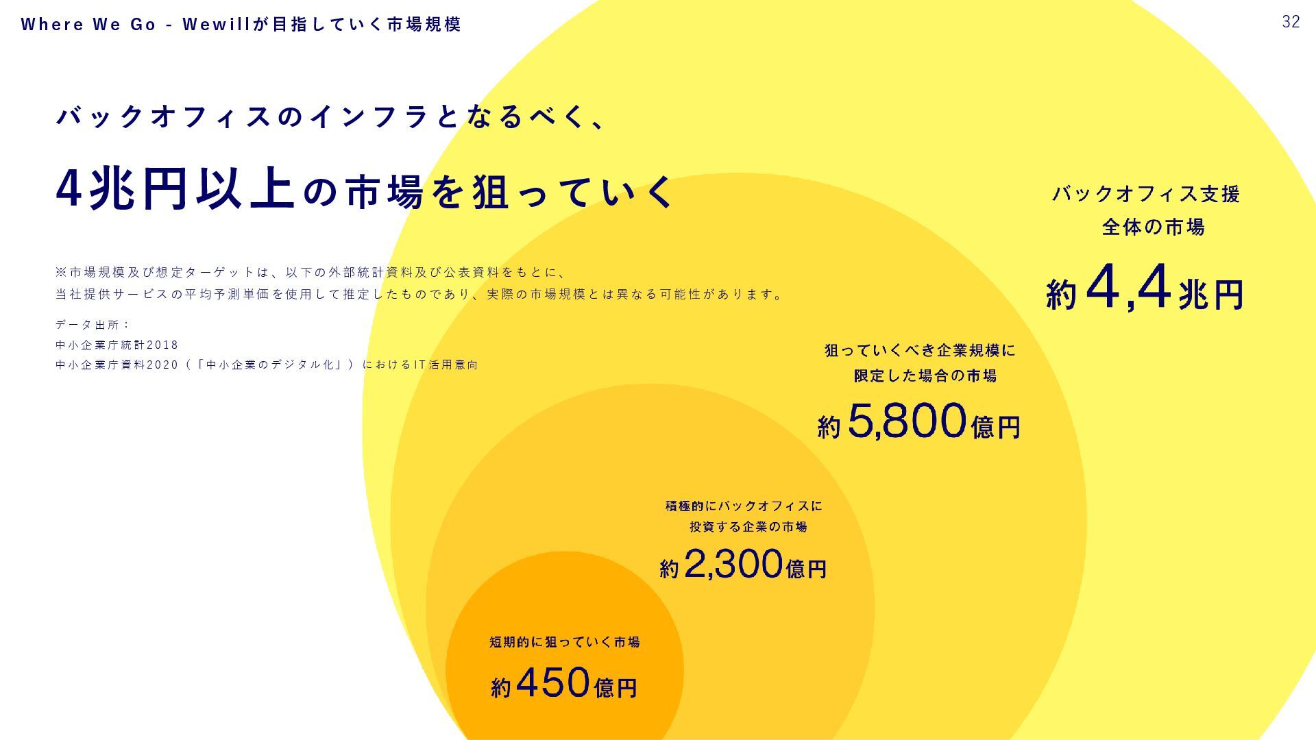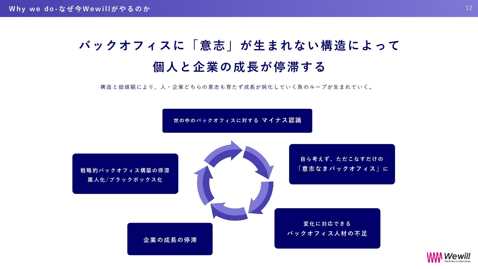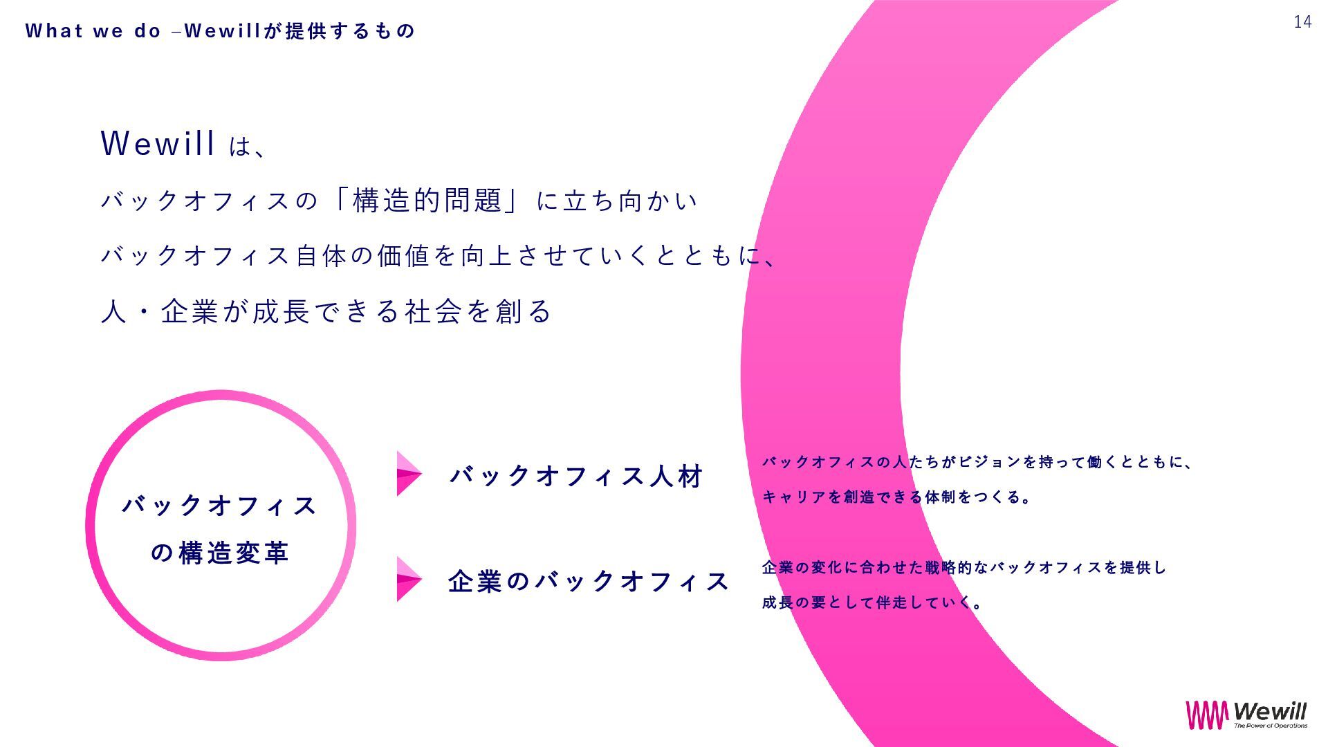 ら こ そ 、 外 部 と 繋 が り 戦略的バックオフィスが で き る 。 そ し て 、 そ れ が 成長の土台となる と い う 、 世 の 中 の 常 識 を つ く る 。 目指す認識 意志ある バックオフィスは 企業の成長の基盤 従来の認識 バックオフィスって コストセンター 33 W h e r e W e G o - W e w i l l が 目 指 す も の