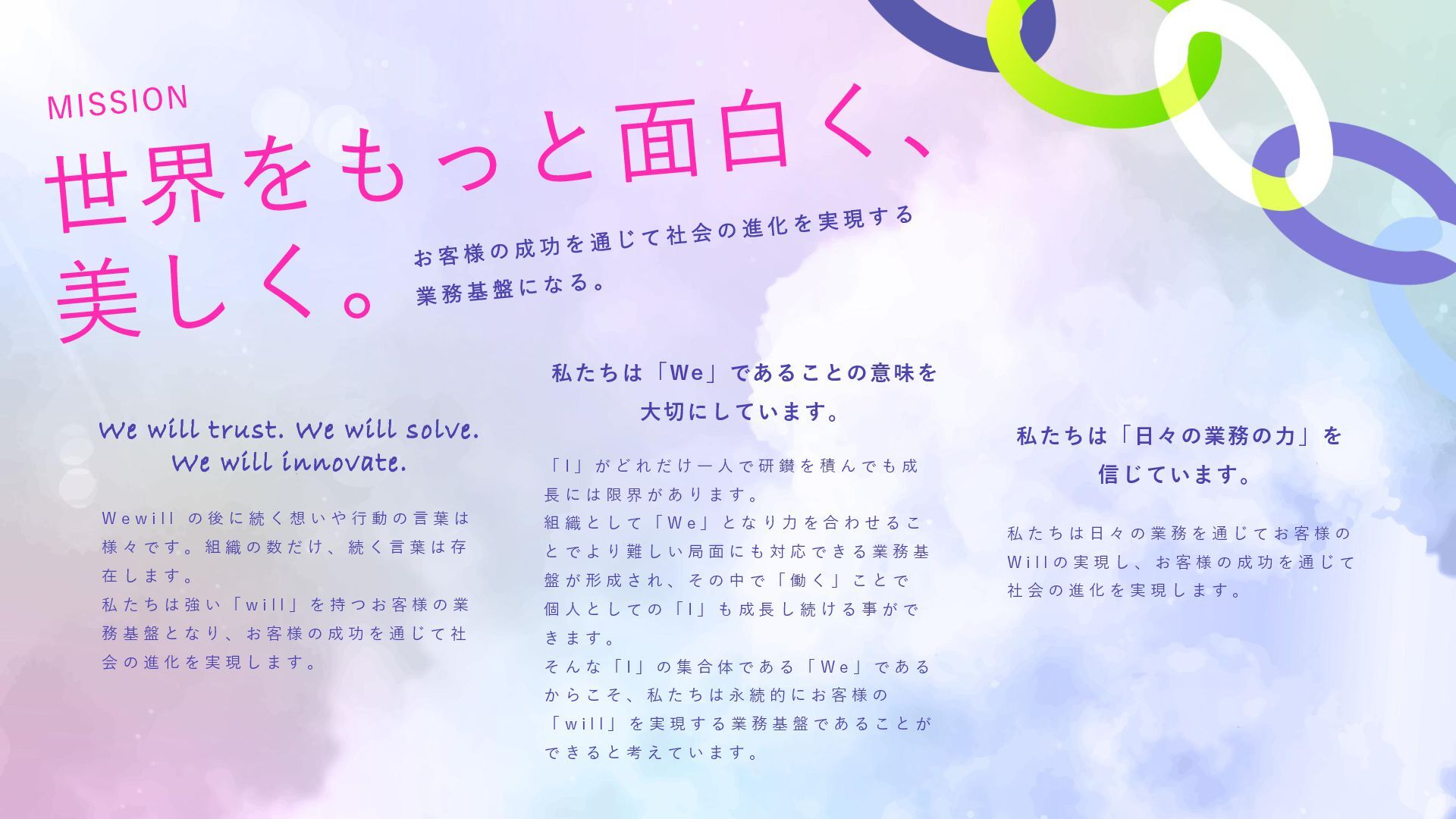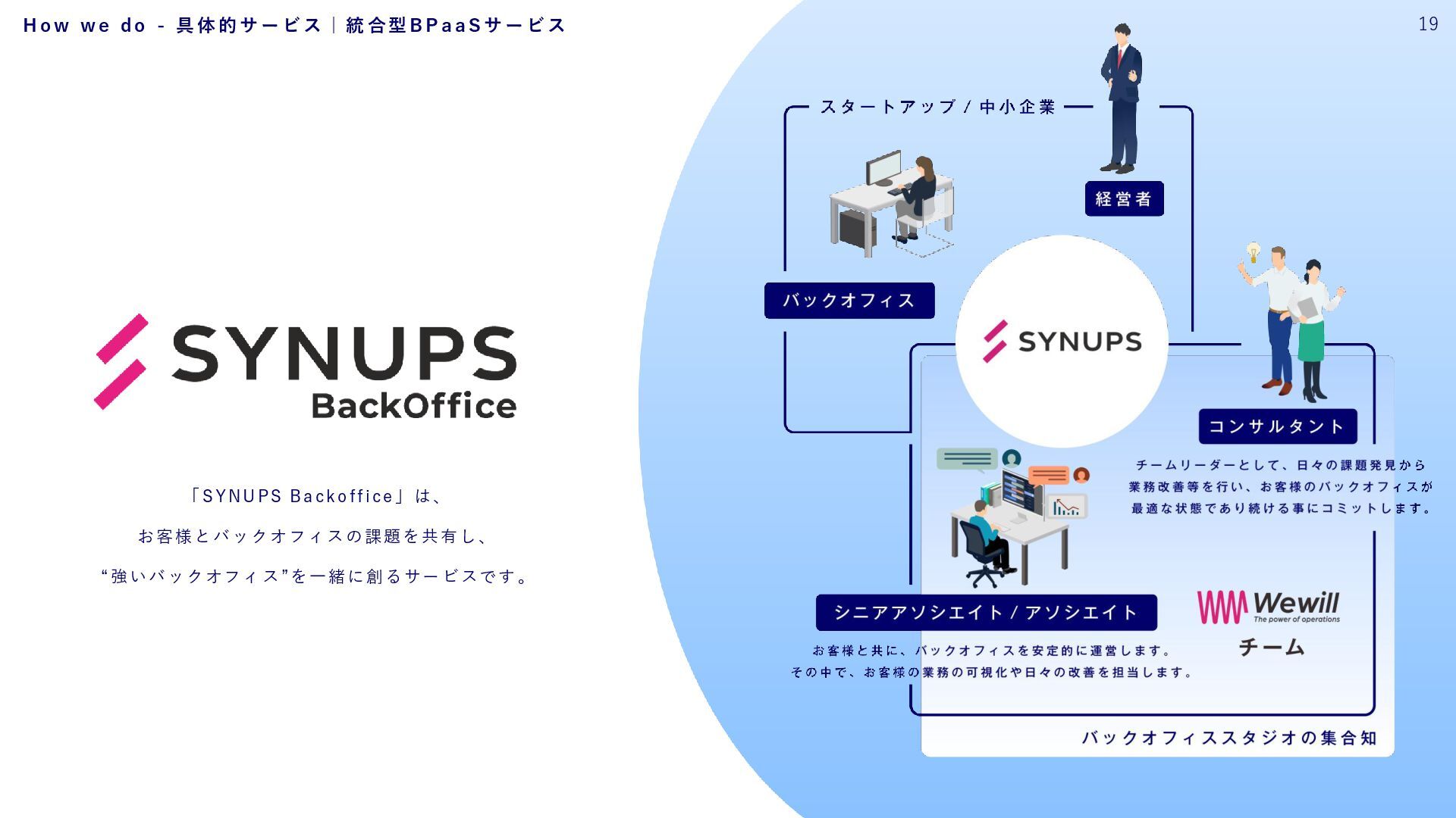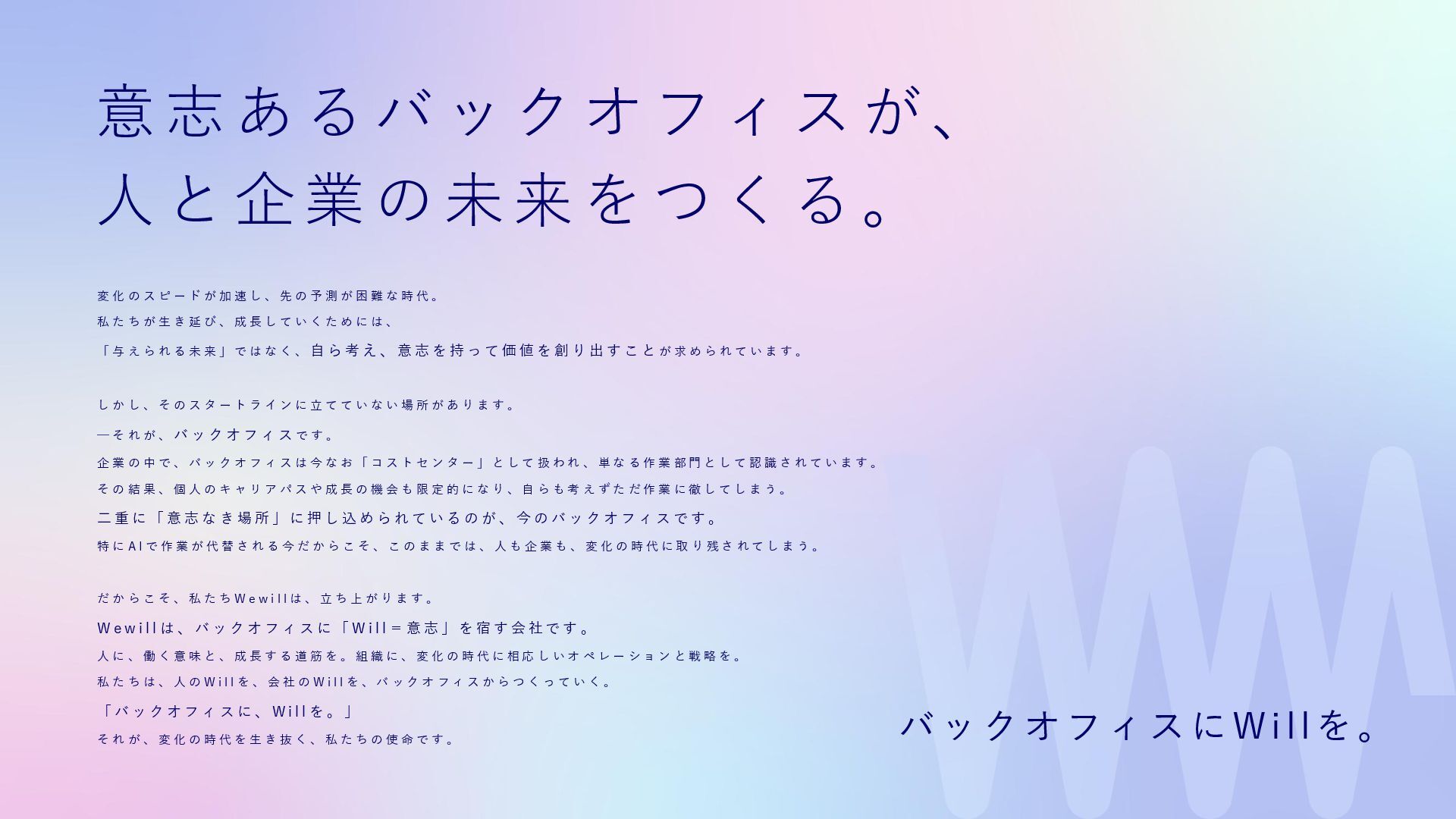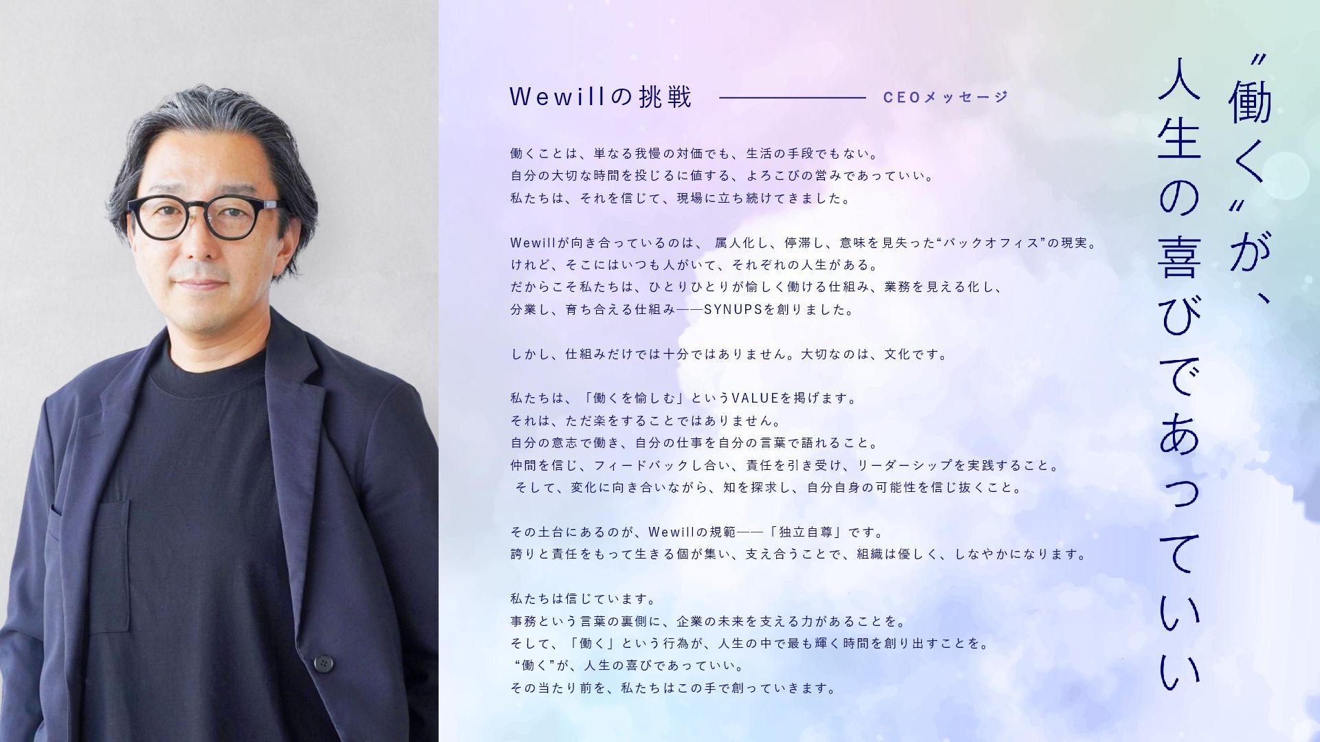 私たちは、それを信じて、現場に立ち続けてきました。 Wewillが向き合っているのは、 属人化し、停滞し、意味を見失った“バックオフィス”の現実。 けれど、そこにはいつも人がいて、それぞれの人生がある。 だからこそ私たちは、ひとりひとりが愉しく働ける仕組み、業務を見える化し、 分業し、育ち合える仕組み──SYNUPSを創りました。 しかし、仕組みだけでは十分ではありません。大切なのは、文化です。 私たちは、「働くを愉しむ」というVALUEを掲げます。 それは、ただ楽をすることではありません。 自分の意志で働き、自分の仕事を自分の言葉で語れること。 仲間を信じ、フィードバックし合い、責任を引き受け、リーダーシップを実践すること。 そして、変化に向き合いながら、知を探求し、自分自身の可能性を信じ抜くこと。 その土台にあるのが、Wewillの規範──「独立自尊」です。 誇りと責任をもって生きる個が集い、支え合うことで、組織は優しく、しなやかになります。 私たちは信じています。 事務という言葉の裏側に、企業の未来を支える力があることを。 そして、「働く」という行為が、人生の中で最も輝く時間を創り出すことを。 “働く”が、人生の喜びであっていい。 その当たり前を、私たちはこの手で創っていきます。 W e w i l l の 挑 戦