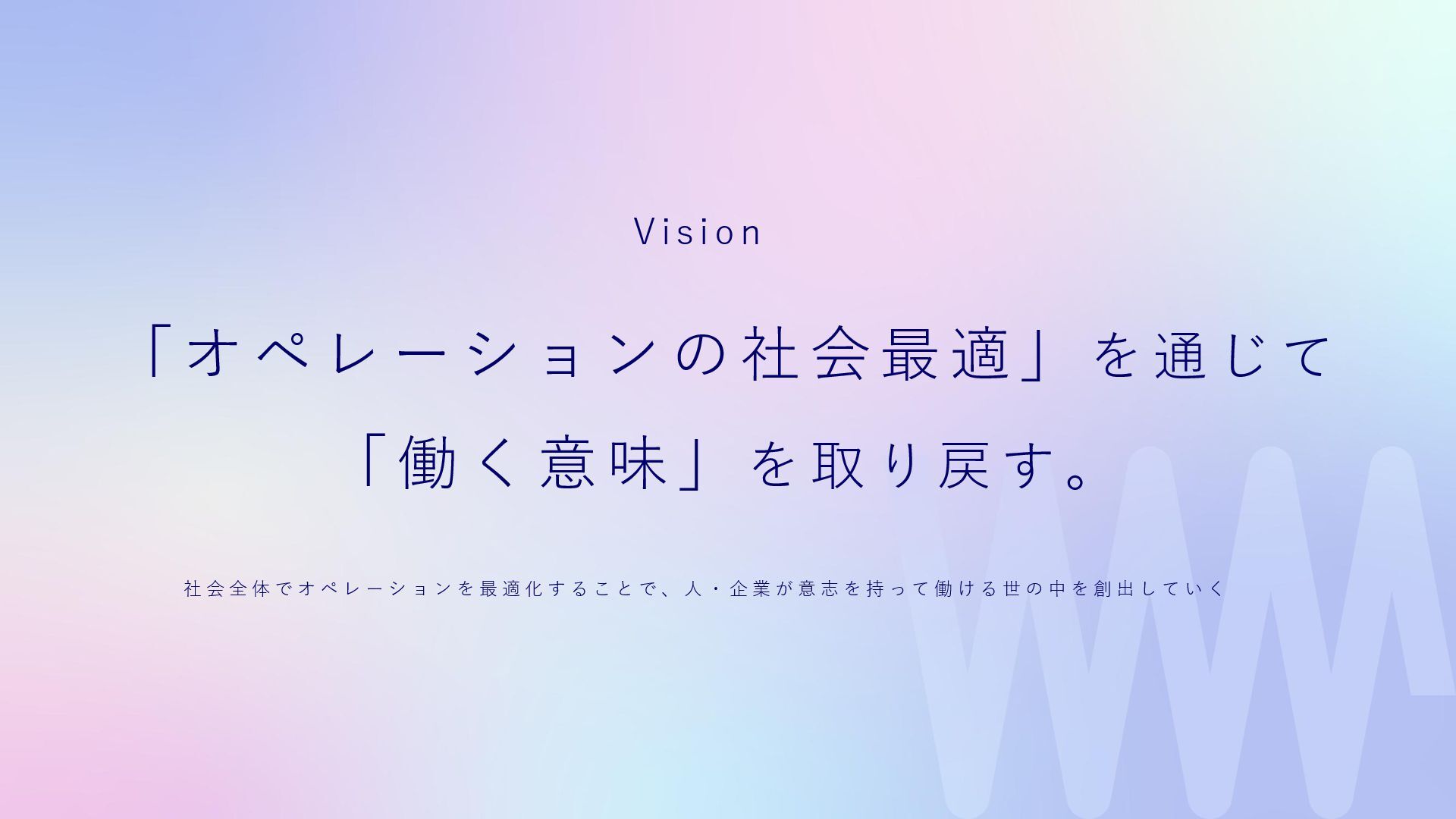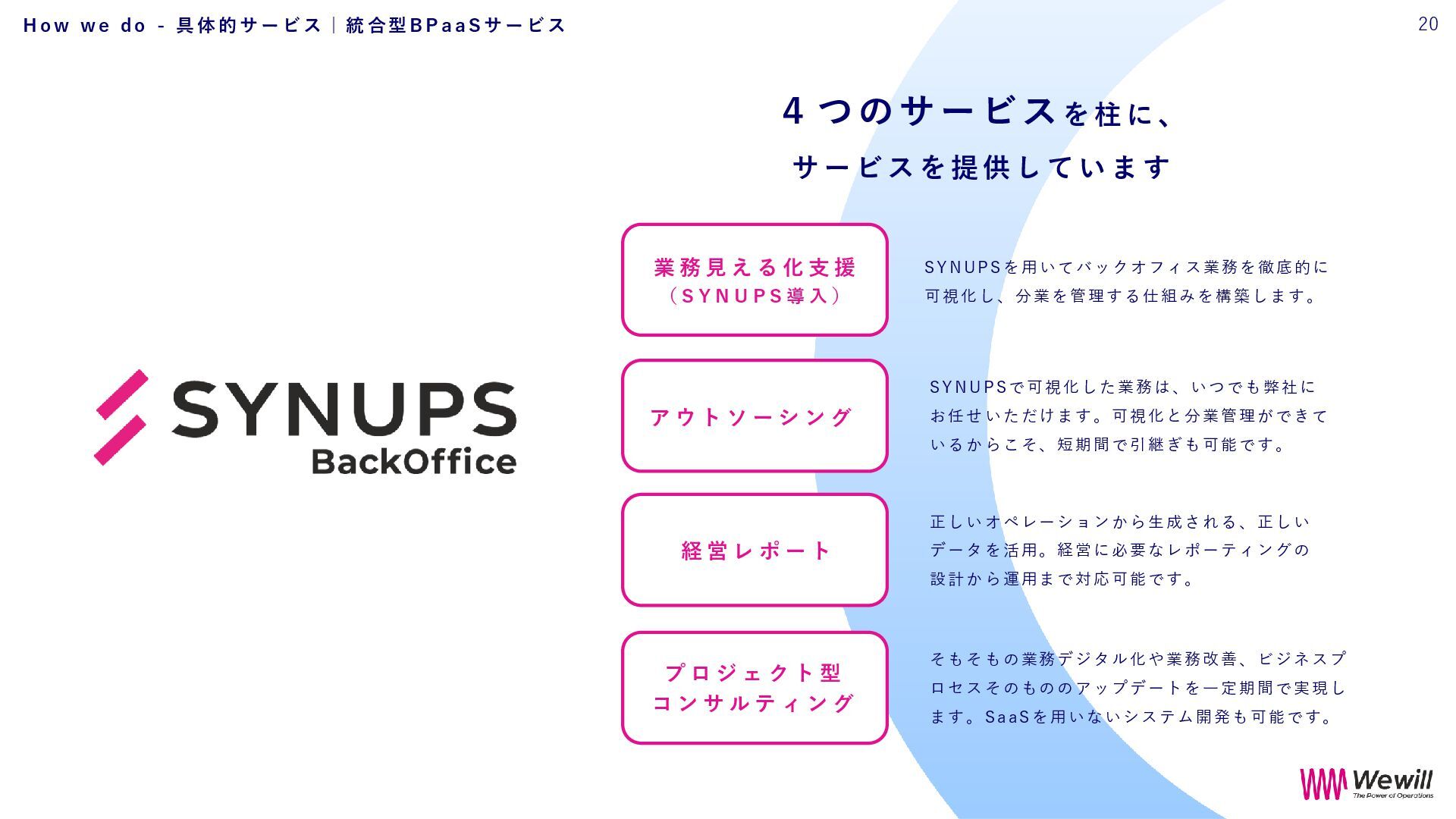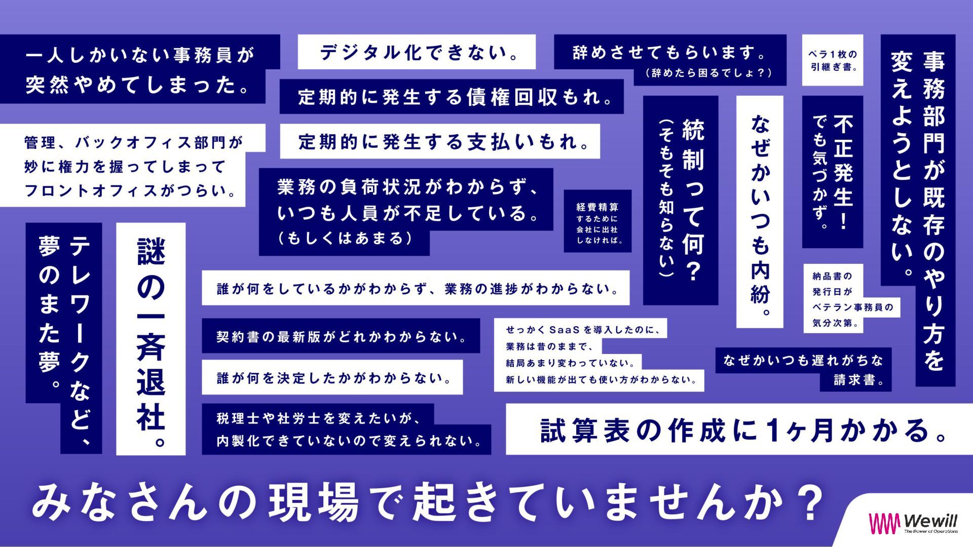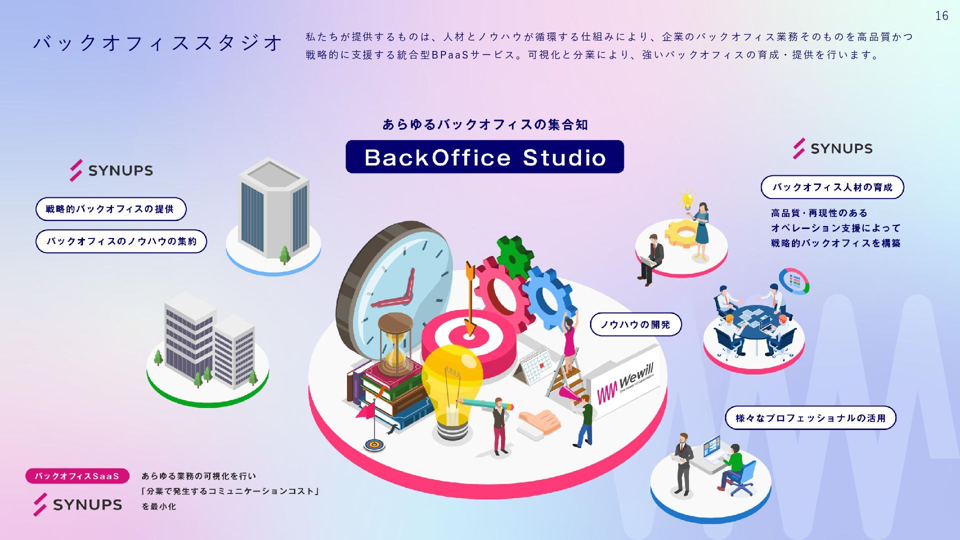 私たちは、それを信じて、現場に立ち続けてきました。 Wewillが向き合っているのは、 属人化し、停滞し、意味を見失った“バックオフィス”の現実。 けれど、そこにはいつも人がいて、それぞれの人生がある。 だからこそ私たちは、ひとりひとりが愉しく働ける仕組み、業務を見える化し、 分業し、育ち合える仕組み──SYNUPSを創りました。 しかし、仕組みだけでは十分ではありません。大切なのは、文化です。 私たちは、「働くを愉しむ」というVALUEを掲げます。 それは、ただ楽をすることではありません。 自分の意志で働き、自分の仕事を自分の言葉で語れること。 仲間を信じ、フィードバックし合い、責任を引き受け、リーダーシップを実践すること。 そして、変化に向き合いながら、知を探求し、自分自身の可能性を信じ抜くこと。 その土台にあるのが、Wewillの規範──「独立自尊」です。 誇りと責任をもって生きる個が集い、支え合うことで、組織は優しく、しなやかになります。 私たちは信じています。 事務という言葉の裏側に、企業の未来を支える力があることを。 そして、「働く」という行為が、人生の中で最も輝く時間を創り出すことを。 “働く”が、人生の喜びであっていい。 その当たり前を、私たちはこの手で創っていきます。 W e w i l l の 挑 戦