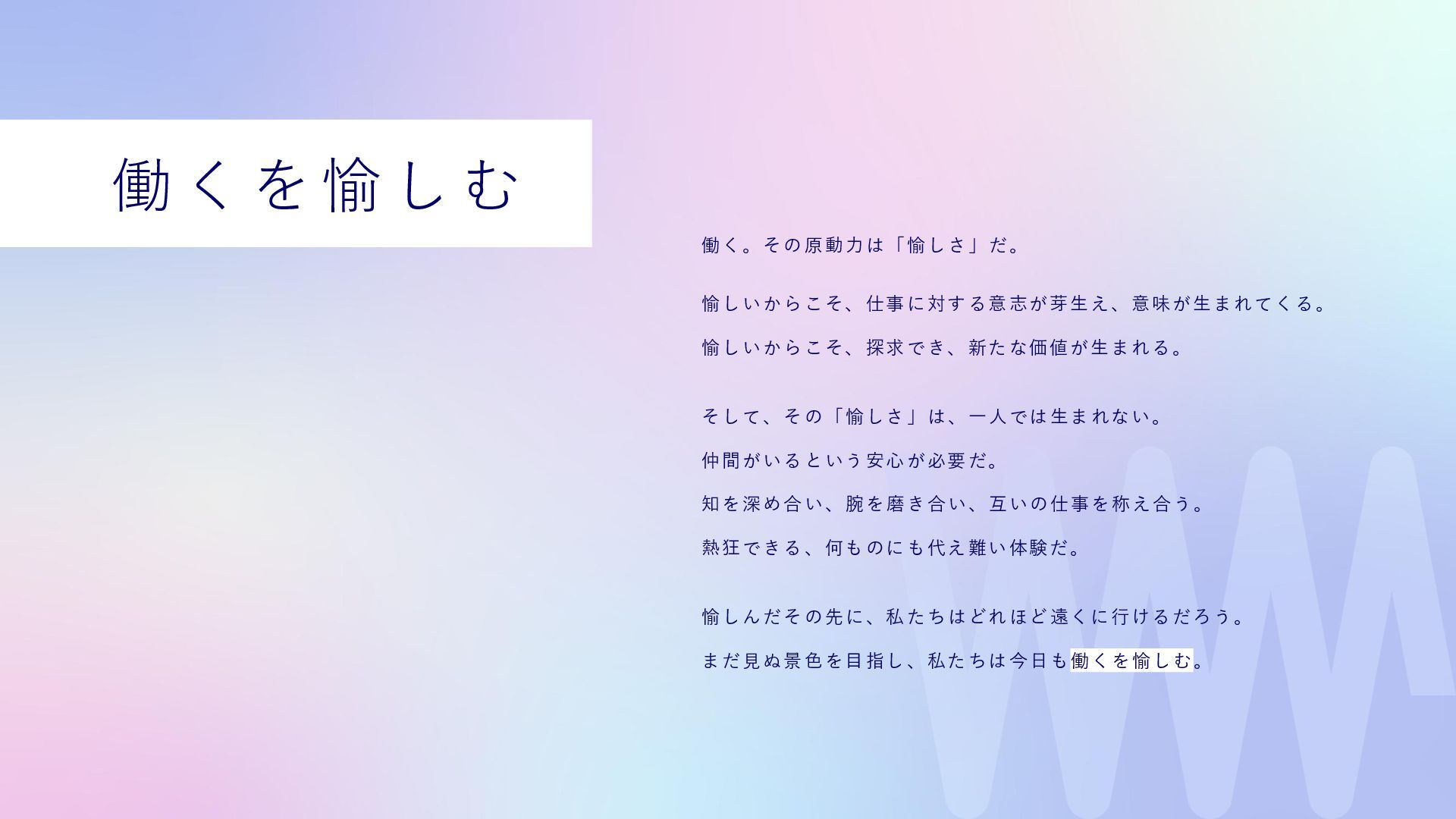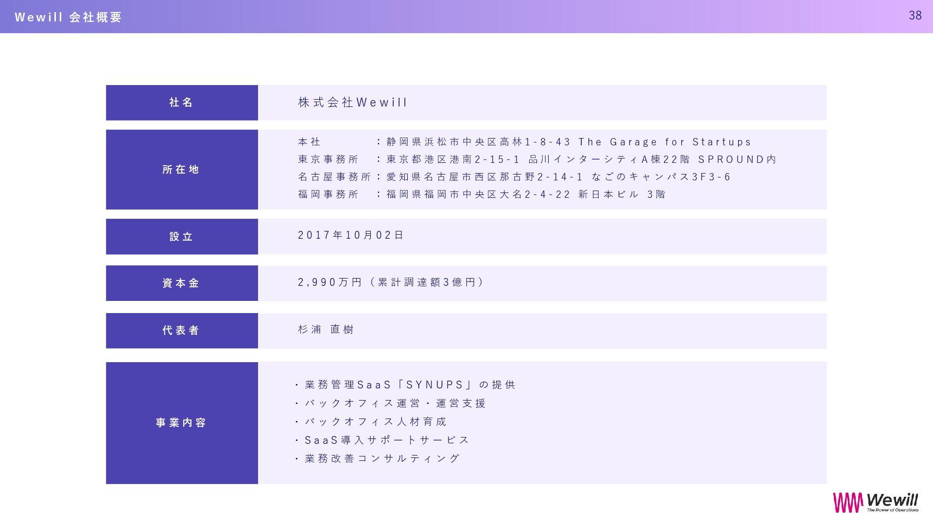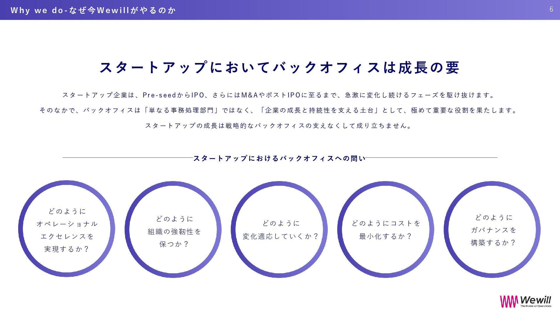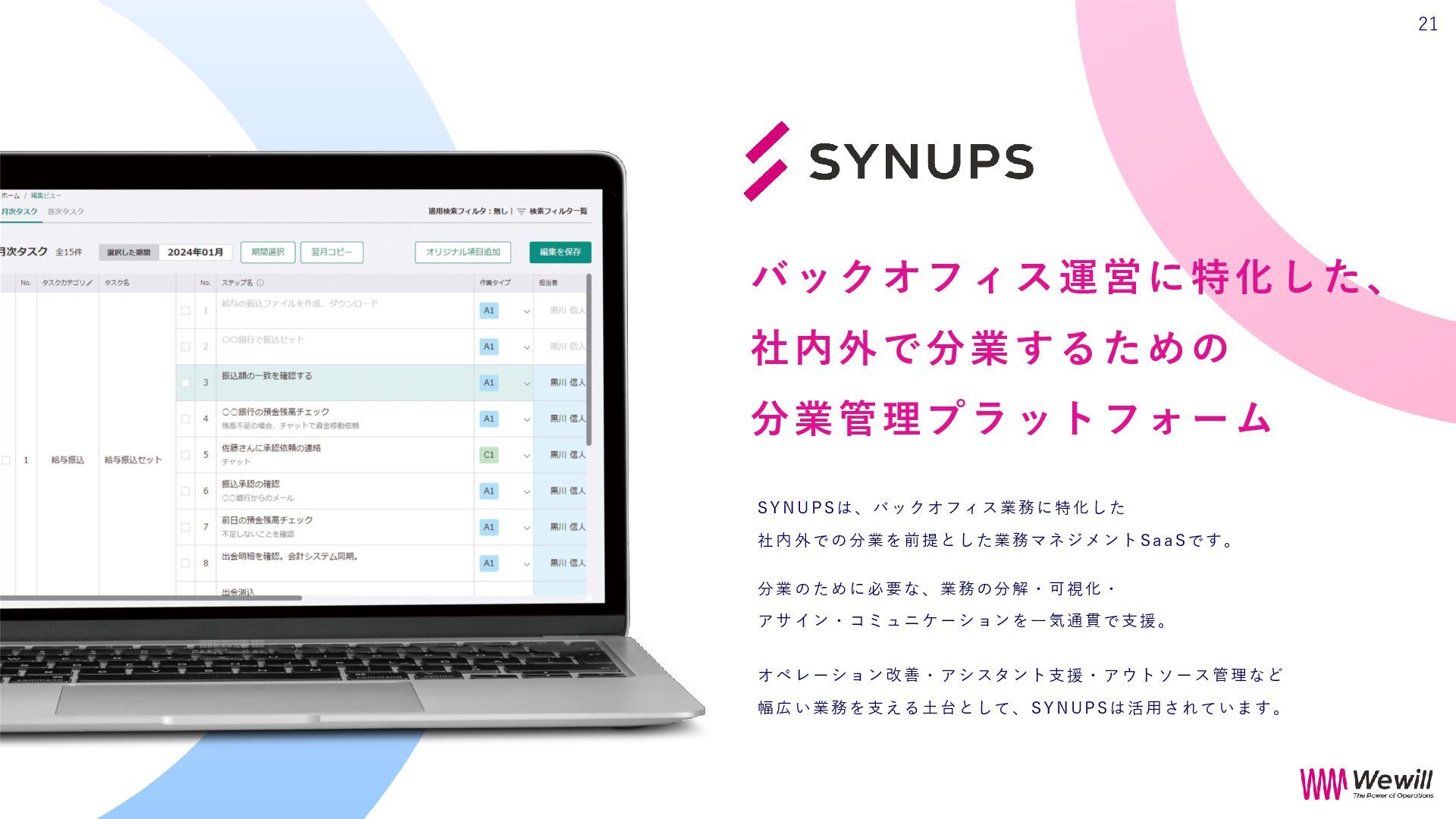 私たちは、それを信じて、現場に立ち続けてきました。 Wewillが向き合っているのは、 属人化し、停滞し、意味を見失った“バックオフィス”の現実。 けれど、そこにはいつも人がいて、それぞれの人生がある。 だからこそ私たちは、ひとりひとりが愉しく働ける仕組み、業務を見える化し、 分業し、育ち合える仕組み──SYNUPSを創りました。 しかし、仕組みだけでは十分ではありません。大切なのは、文化です。 私たちは、「働くを愉しむ」というVALUEを掲げます。 それは、ただ楽をすることではありません。 自分の意志で働き、自分の仕事を自分の言葉で語れること。 仲間を信じ、フィードバックし合い、責任を引き受け、リーダーシップを実践すること。 そして、変化に向き合いながら、知を探求し、自分自身の可能性を信じ抜くこと。 その土台にあるのが、Wewillの規範──「独立自尊」です。 誇りと責任をもって生きる個が集い、支え合うことで、組織は優しく、しなやかになります。 私たちは信じています。 事務という言葉の裏側に、企業の未来を支える力があることを。 そして、「働く」という行為が、人生の中で最も輝く時間を創り出すことを。 “働く”が、人生の喜びであっていい。 その当たり前を、私たちはこの手で創っていきます。 W e w i l l の 挑 戦