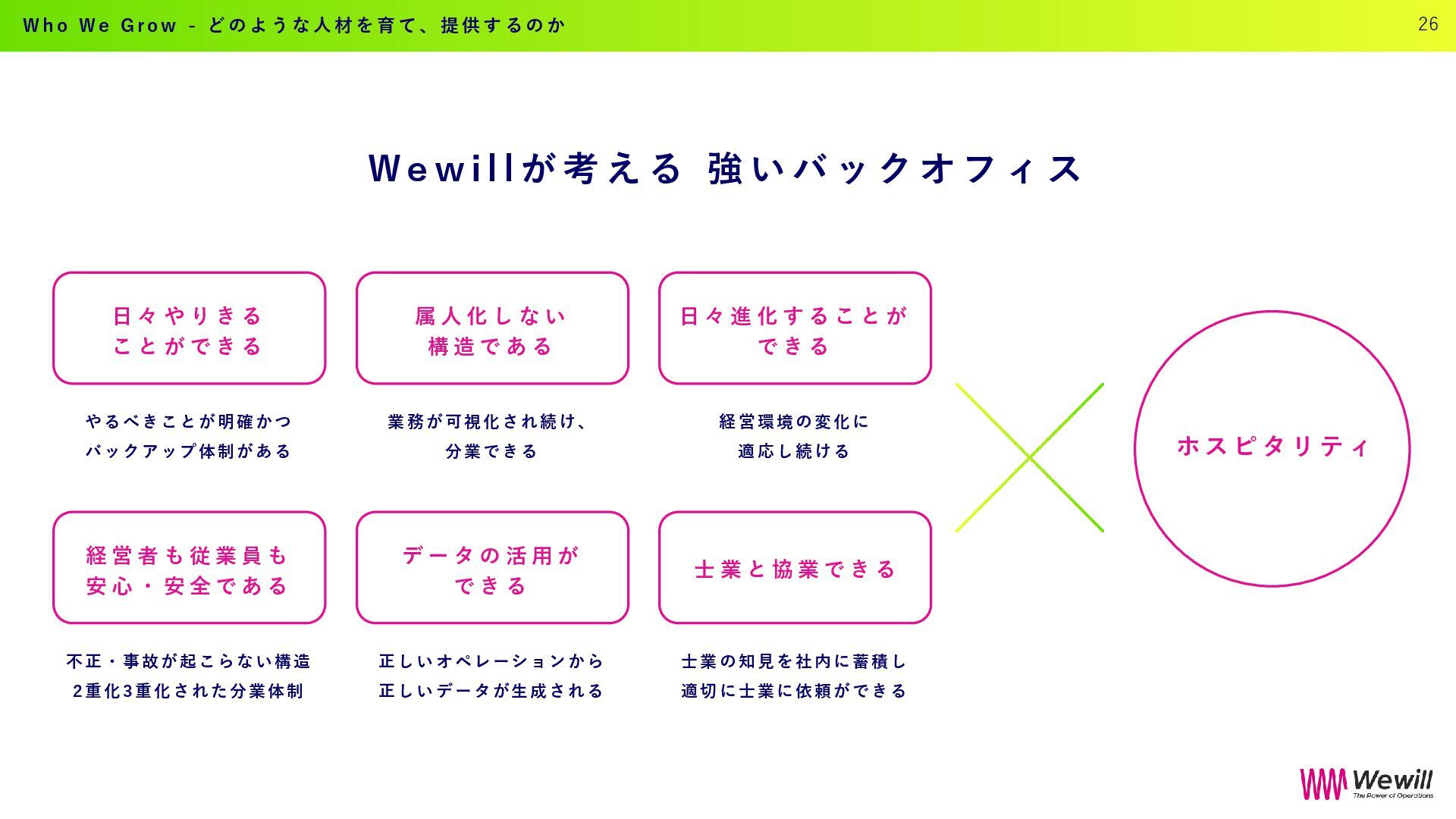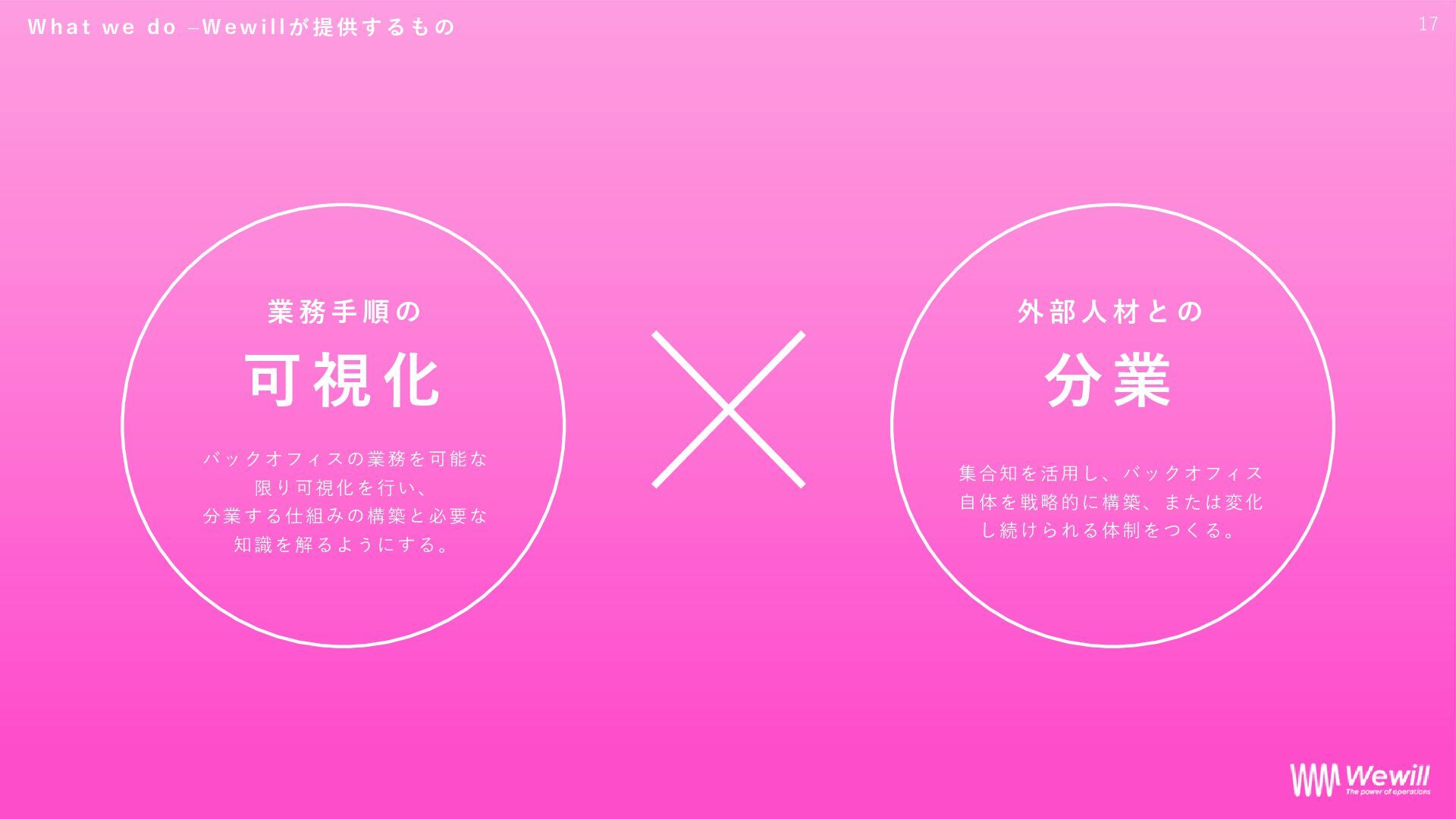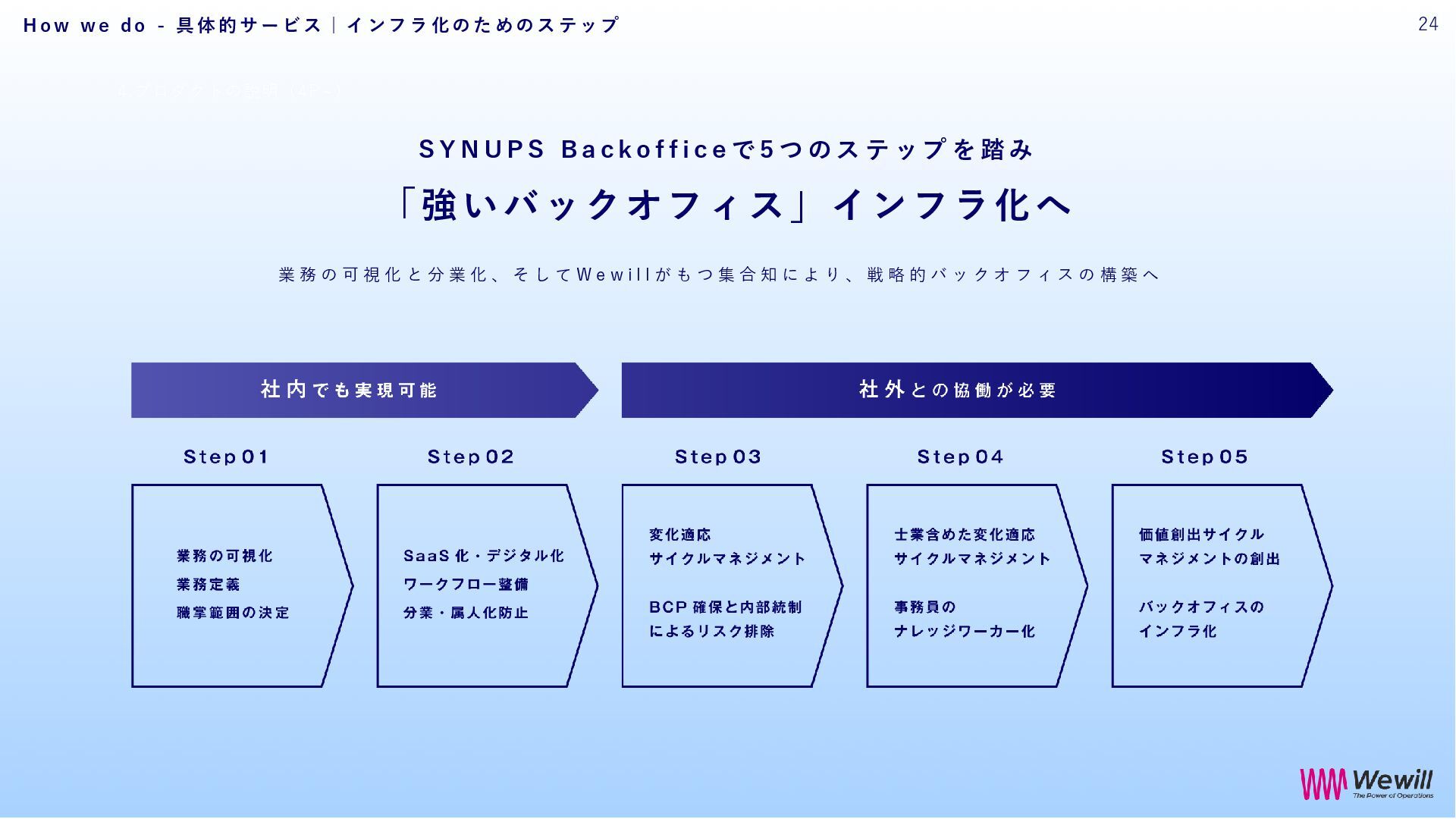 k o f f i c e で 5 つ の ス テ ッ プ を 踏 み 「強いバックオフィス」インフラ化へ 業 務 の 可 視 化 と 分 業 化 、 そ し て W e w i l l が も つ 集 合 知 に よ り 、 戦 略 的 バ ッ ク オ フ ィ ス の 構 築 へ H o w w e d o - 具 体 的 サ ー ビ ス | イ ン フ ラ 化 の た め の ス テ ッ プ 24