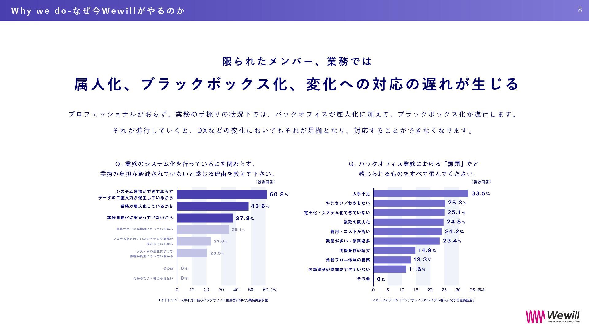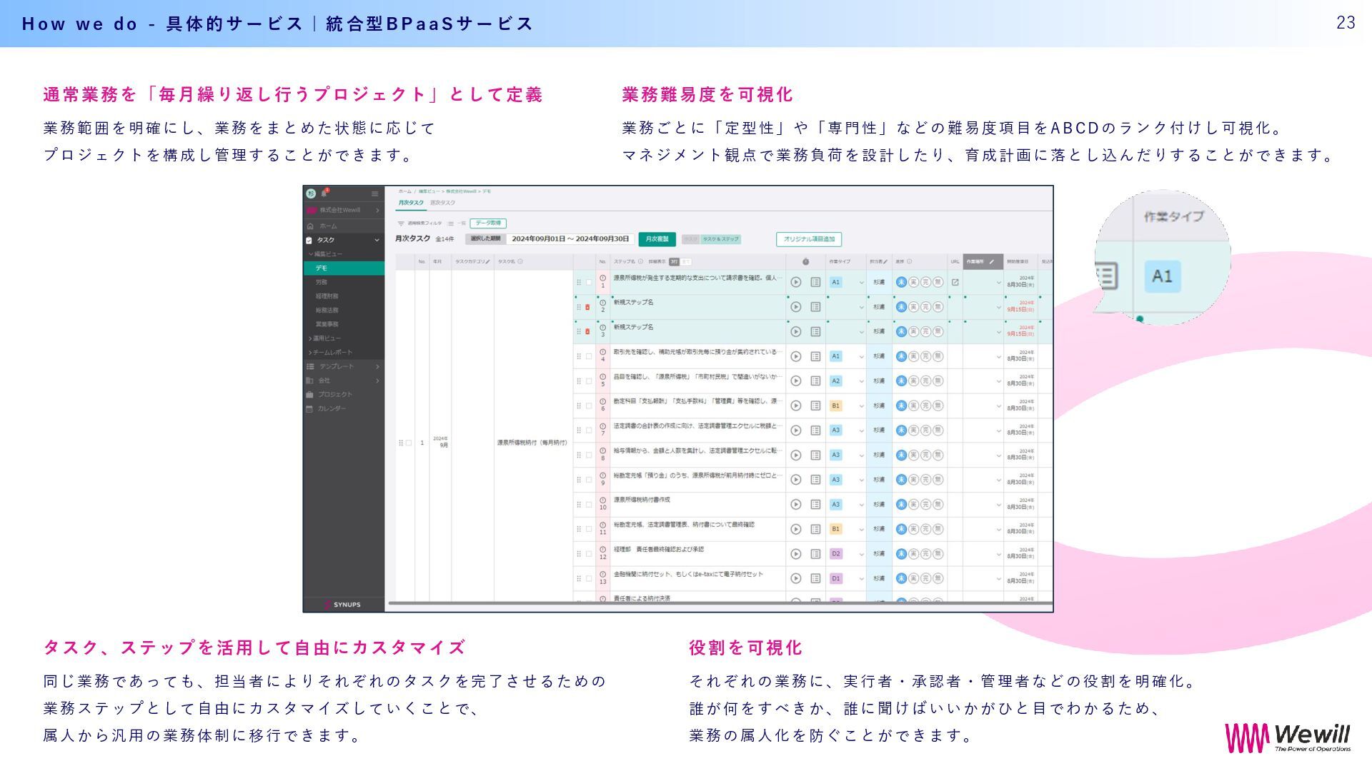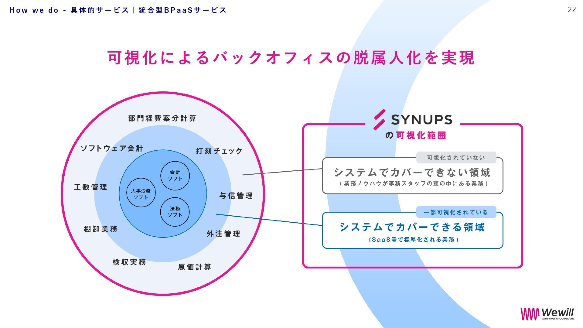 k o f f i c e で 5 つ の ス テ ッ プ を 踏 み 「強いバックオフィス」インフラ化へ 業 務 の 可 視 化 と 分 業 化 、 そ し て W e w i l l が も つ 集 合 知 に よ り 、 戦 略 的 バ ッ ク オ フ ィ ス の 構 築 へ H o w w e d o - 具 体 的 サ ー ビ ス | イ ン フ ラ 化 の た め の ス テ ッ プ 24
