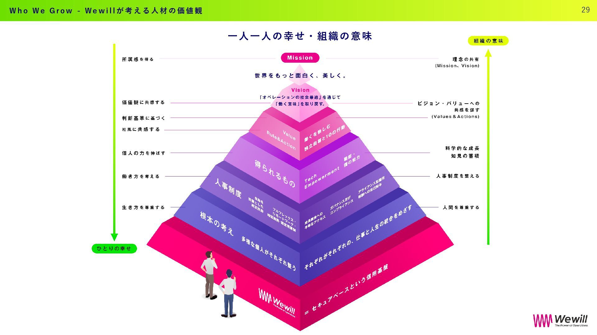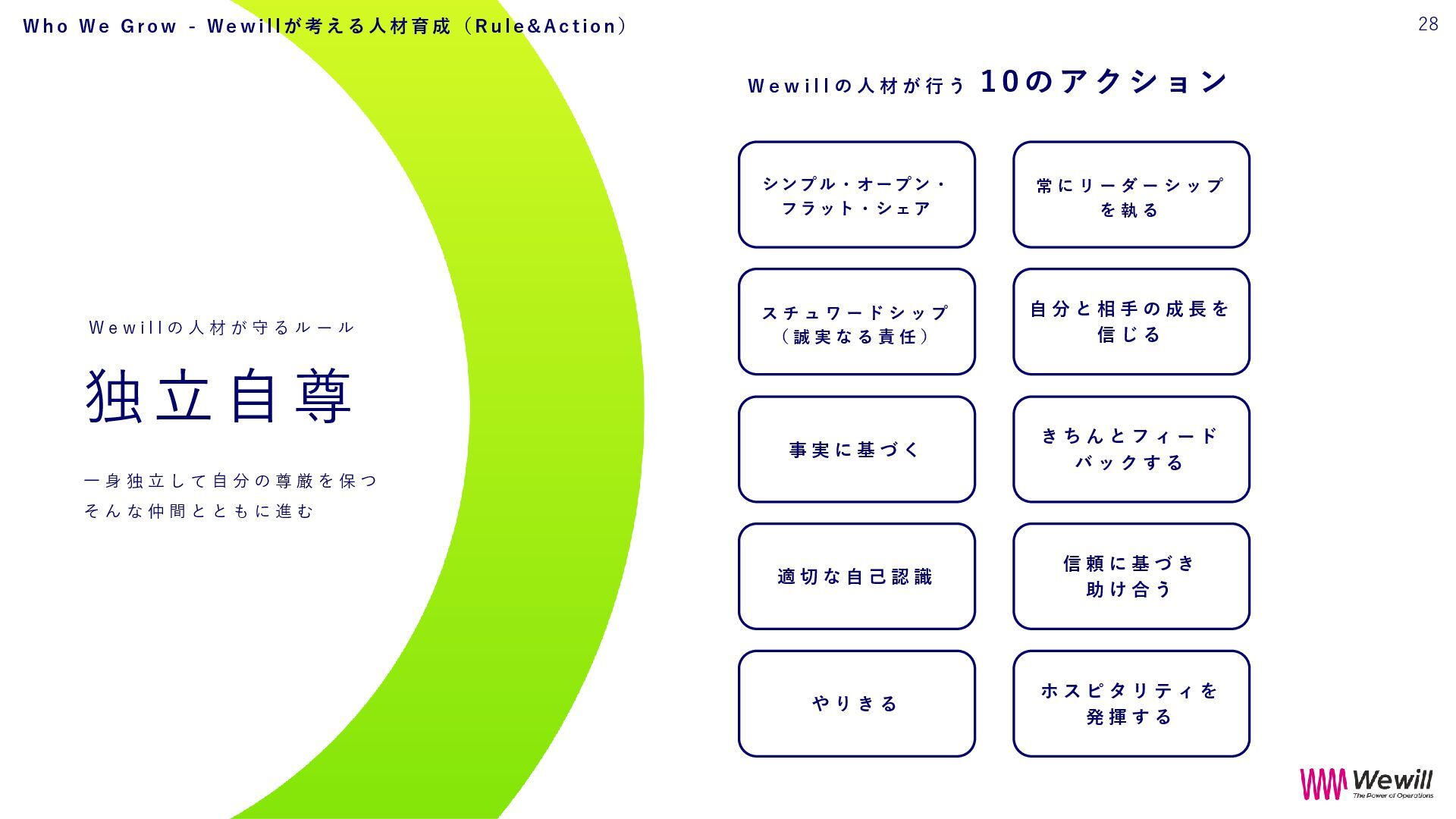 執 る 自 分 と 相 手 の 成 長 を 信 じ る き ち ん と フ ィ ー ド バ ッ ク す る 信 頼 に 基 づ き 助 け 合 う ホ ス ピ タ リ テ ィ を 発 揮 す る シンプル・オープン・ フラット・シェア ス チ ュ ワ ー ド シ ッ プ ( 誠 実 な る 責 任 ) 事 実 に 基 づ く 適 切 な 自 己 認 識 や り き る 独 立 自 尊 一 身 独 立 し て 自 分 の 尊 厳 を 保 つ そ ん な 仲 間 と と も に 進 む W e w i l l の 人 材 が 行 う 1 0 のアクション W e w i l l の 人 材 が 守 る ル ー ル 28 W h o W e G r o w - W e w i l l が 考 え る 人 材 育 成 ( R u l e & A c t i o n )