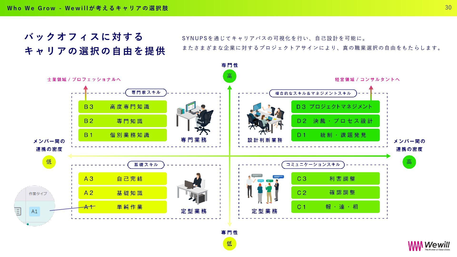る キ ャ リ ア の 選 択 の 自 由 を提 供 SYNUPSを通じてキャリアパスの可視化を行い、自己設計を可能に。 またさまざまな企業に対するプロジェクトアサインにより、真の職業選択の自由をもたらします。 W h o W e G r o w - W e w i l l が 考 え る キ ャ リ ア の 選 択 肢 30