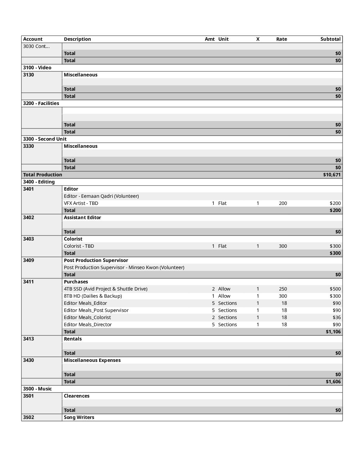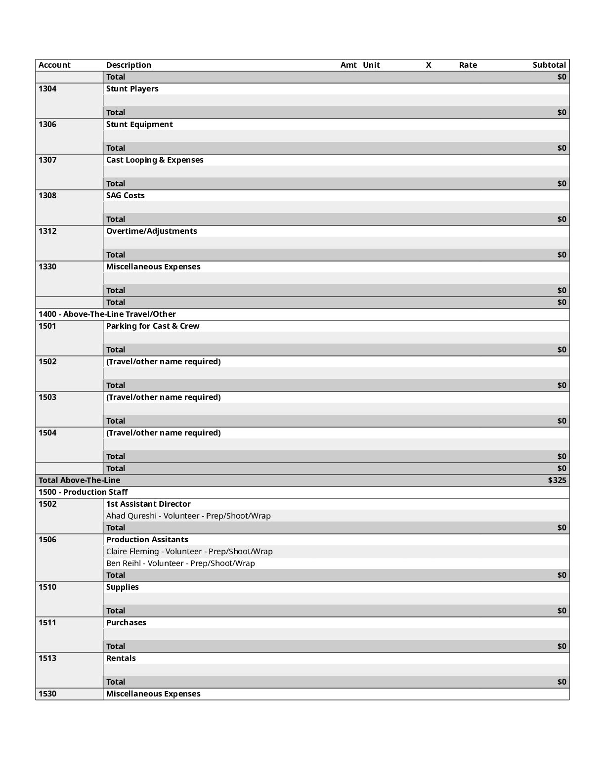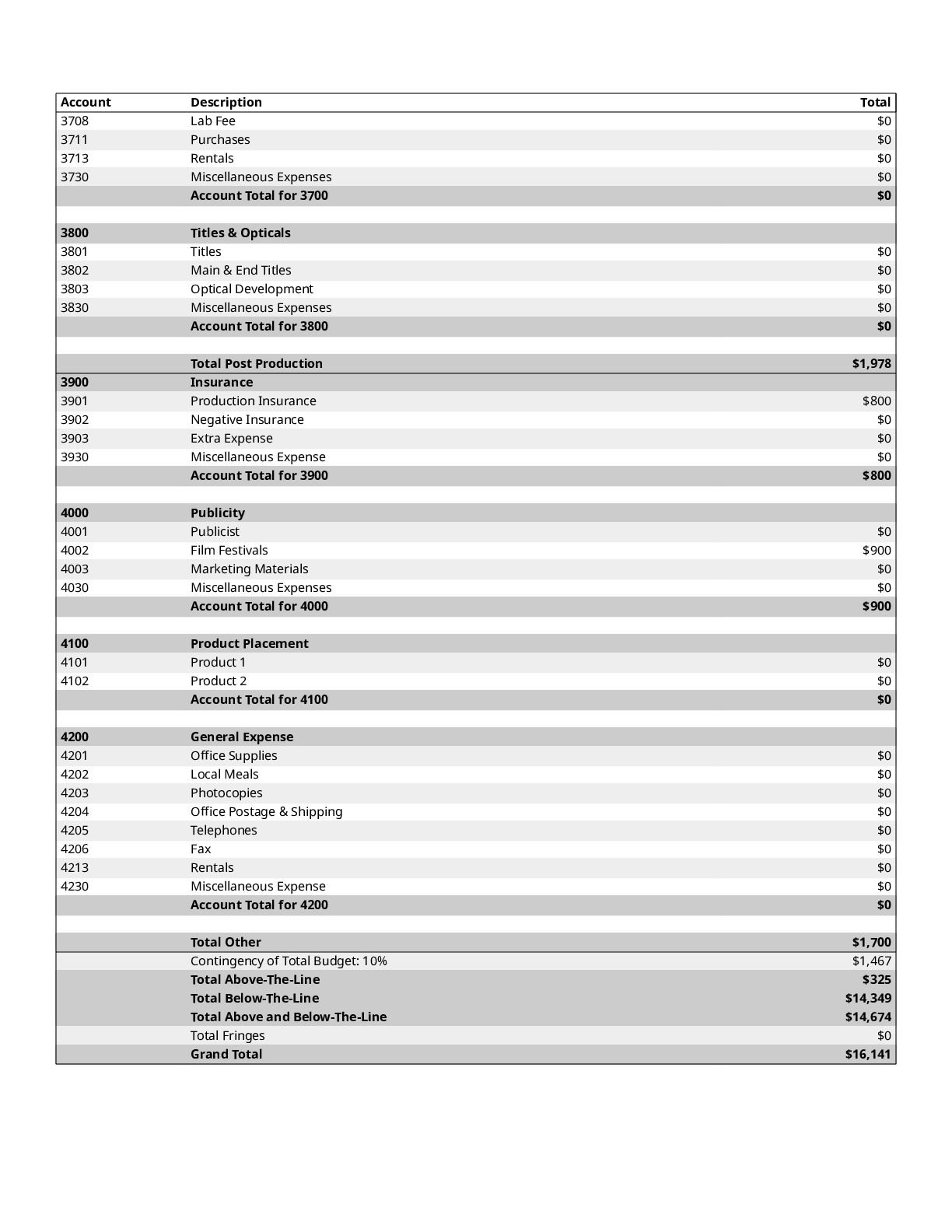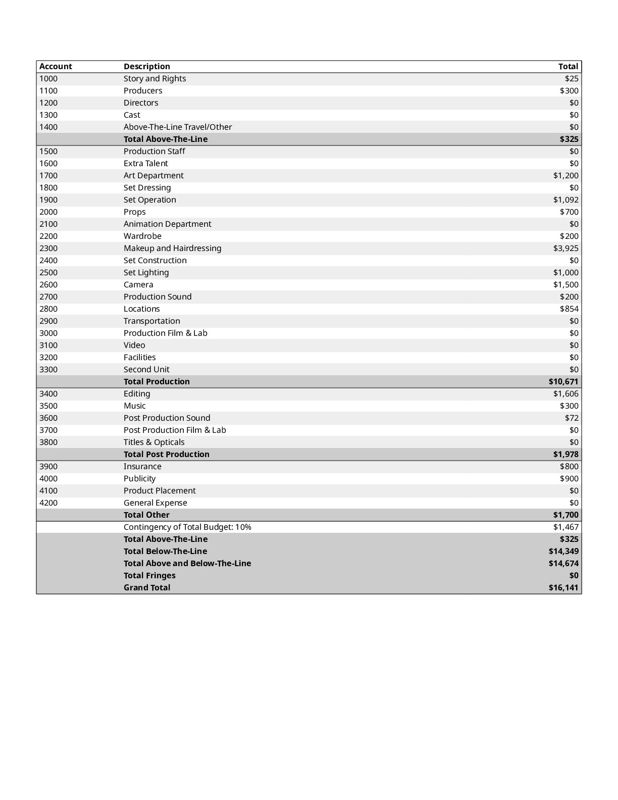 $300 1200 Directors $0 1300 Cast $0 1400 Above-The-Line Travel/Other $0 Total Above-The-Line $325 1500 Production Staff $0 1600 Extra Talent $0 1700 Art Department $1,200 1800 Set Dressing $0 1900 Set Operation $1,092 2000 Props $700 2100 Animation Department $0 2200 Wardrobe $200 2300 Makeup and Hairdressing $3,925 2400 Set Construction $0 2500 Set Lighting $1,000 2600 Camera $1,500 2700 Production Sound $200 2800 Locations $854 2900 Transportation $0 3000 Production Film & Lab $0 3100 Video $0 3200 Facilities $0 3300 Second Unit $0 Total Production $10,671 3400 Editing $1,606 3500 Music $300 3600 Post Production Sound $72 3700 Post Production Film & Lab $0 3800 Titles & Opticals $0 Total Post Production $1,978 3900 Insurance $800 4000 Publicity $900 4100 Product Placement $0 4200 General Expense $0 Total Other $1,700 Contingency of Total Budget: 10% $1,467 Total Above-The-Line $325 Total Below-The-Line $14,349 Total Above and Below-The-Line $14,674 Total Fringes $0 Grand Total $16,141