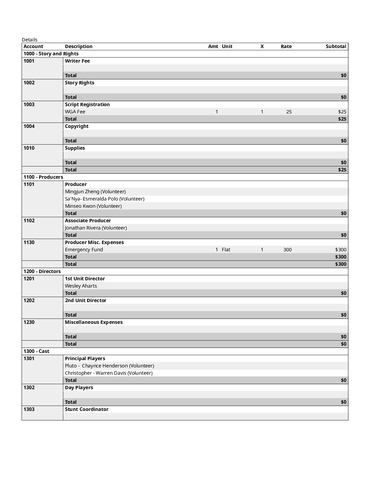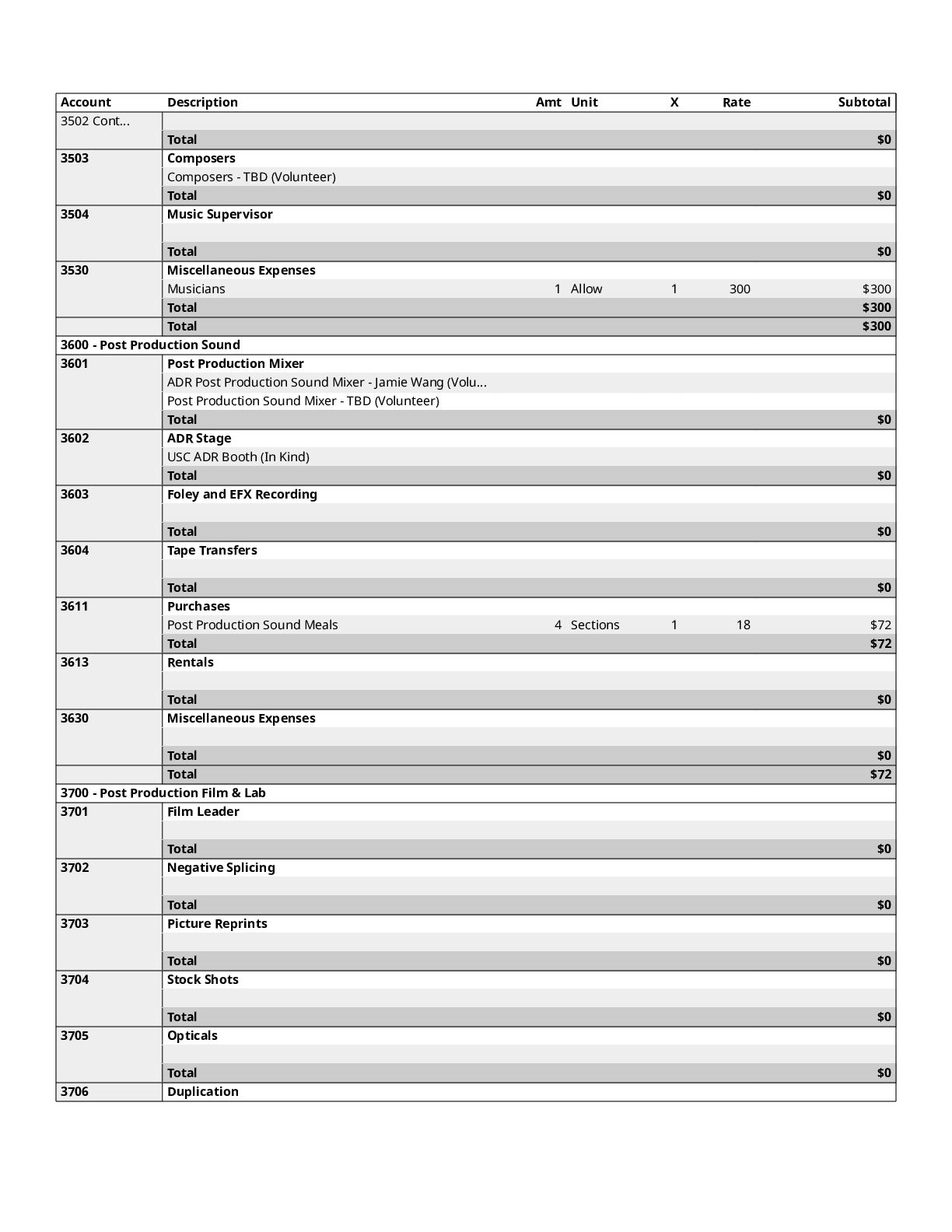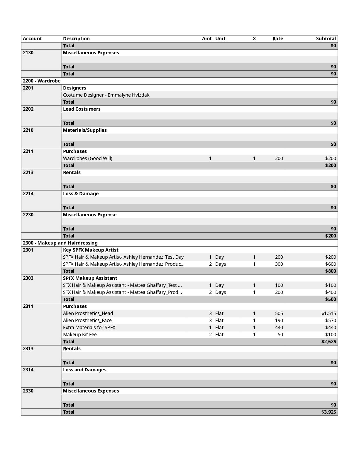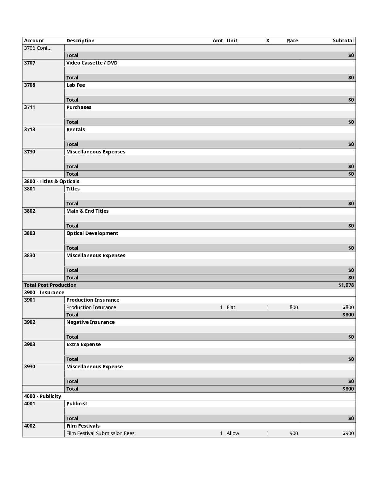 $300 1200 Directors $0 1300 Cast $0 1400 Above-The-Line Travel/Other $0 Total Above-The-Line $325 1500 Production Staff $0 1600 Extra Talent $0 1700 Art Department $1,200 1800 Set Dressing $0 1900 Set Operation $1,092 2000 Props $700 2100 Animation Department $0 2200 Wardrobe $200 2300 Makeup and Hairdressing $3,925 2400 Set Construction $0 2500 Set Lighting $1,000 2600 Camera $1,500 2700 Production Sound $200 2800 Locations $854 2900 Transportation $0 3000 Production Film & Lab $0 3100 Video $0 3200 Facilities $0 3300 Second Unit $0 Total Production $10,671 3400 Editing $1,606 3500 Music $300 3600 Post Production Sound $72 3700 Post Production Film & Lab $0 3800 Titles & Opticals $0 Total Post Production $1,978 3900 Insurance $800 4000 Publicity $900 4100 Product Placement $0 4200 General Expense $0 Total Other $1,700 Contingency of Total Budget: 10% $1,467 Total Above-The-Line $325 Total Below-The-Line $14,349 Total Above and Below-The-Line $14,674 Total Fringes $0 Grand Total $16,141
