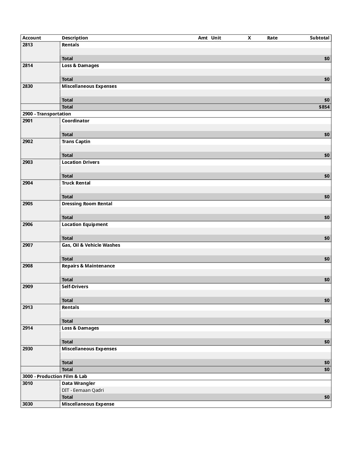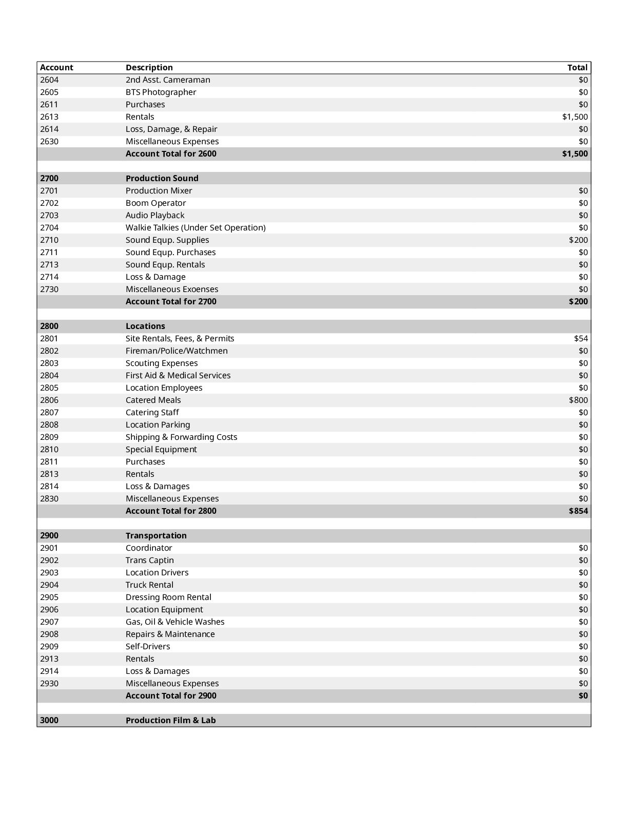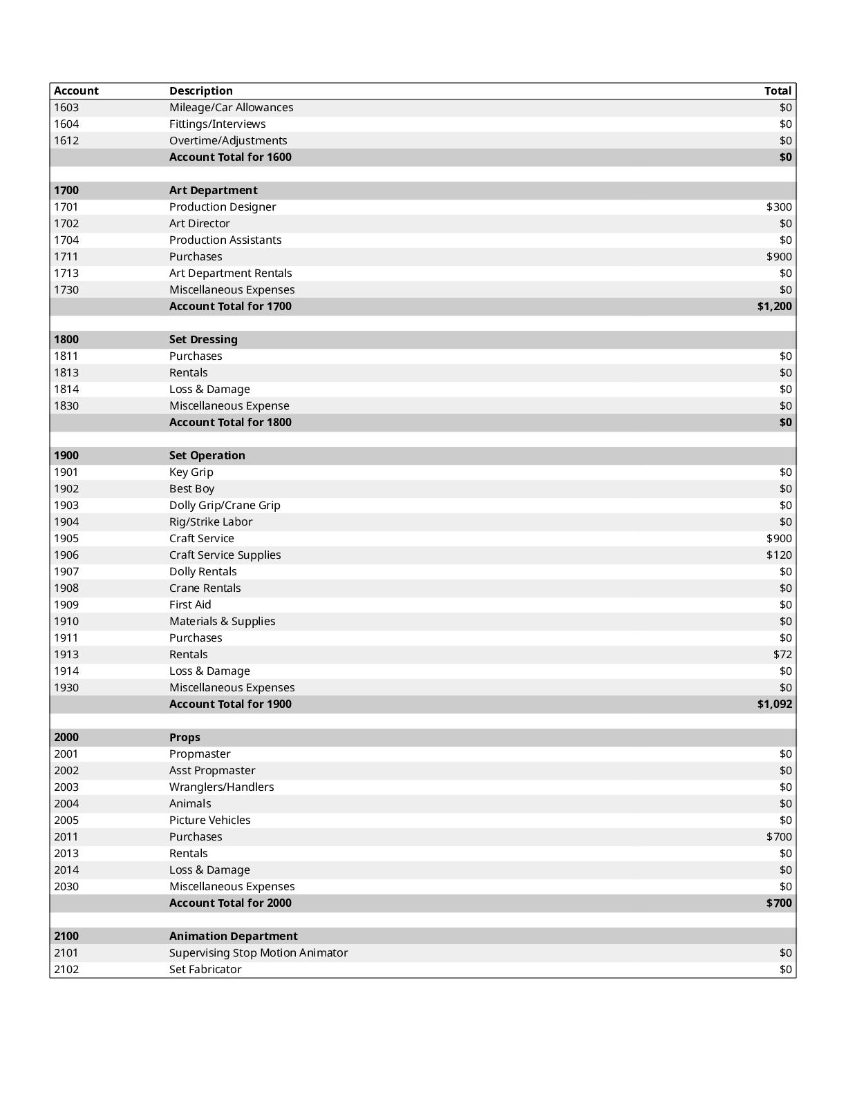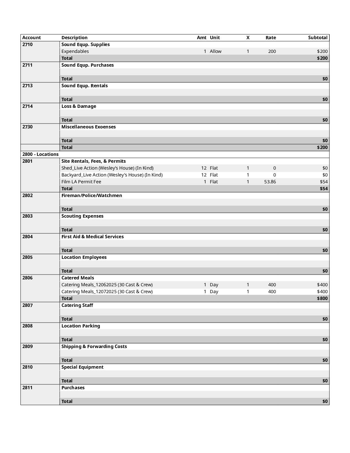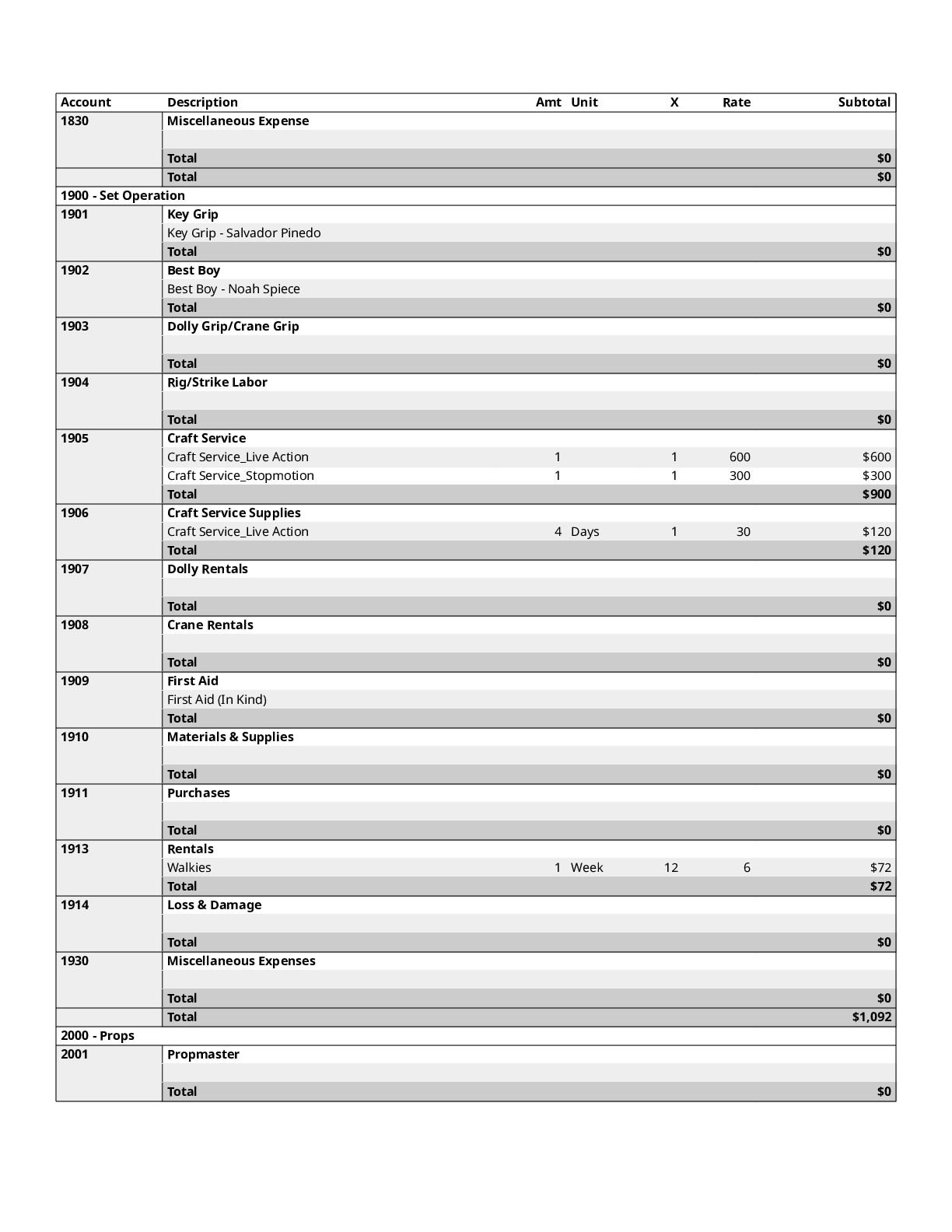 $300 1200 Directors $0 1300 Cast $0 1400 Above-The-Line Travel/Other $0 Total Above-The-Line $325 1500 Production Staff $0 1600 Extra Talent $0 1700 Art Department $1,200 1800 Set Dressing $0 1900 Set Operation $1,092 2000 Props $700 2100 Animation Department $0 2200 Wardrobe $200 2300 Makeup and Hairdressing $3,925 2400 Set Construction $0 2500 Set Lighting $1,000 2600 Camera $1,500 2700 Production Sound $200 2800 Locations $854 2900 Transportation $0 3000 Production Film & Lab $0 3100 Video $0 3200 Facilities $0 3300 Second Unit $0 Total Production $10,671 3400 Editing $1,606 3500 Music $300 3600 Post Production Sound $72 3700 Post Production Film & Lab $0 3800 Titles & Opticals $0 Total Post Production $1,978 3900 Insurance $800 4000 Publicity $900 4100 Product Placement $0 4200 General Expense $0 Total Other $1,700 Contingency of Total Budget: 10% $1,467 Total Above-The-Line $325 Total Below-The-Line $14,349 Total Above and Below-The-Line $14,674 Total Fringes $0 Grand Total $16,141