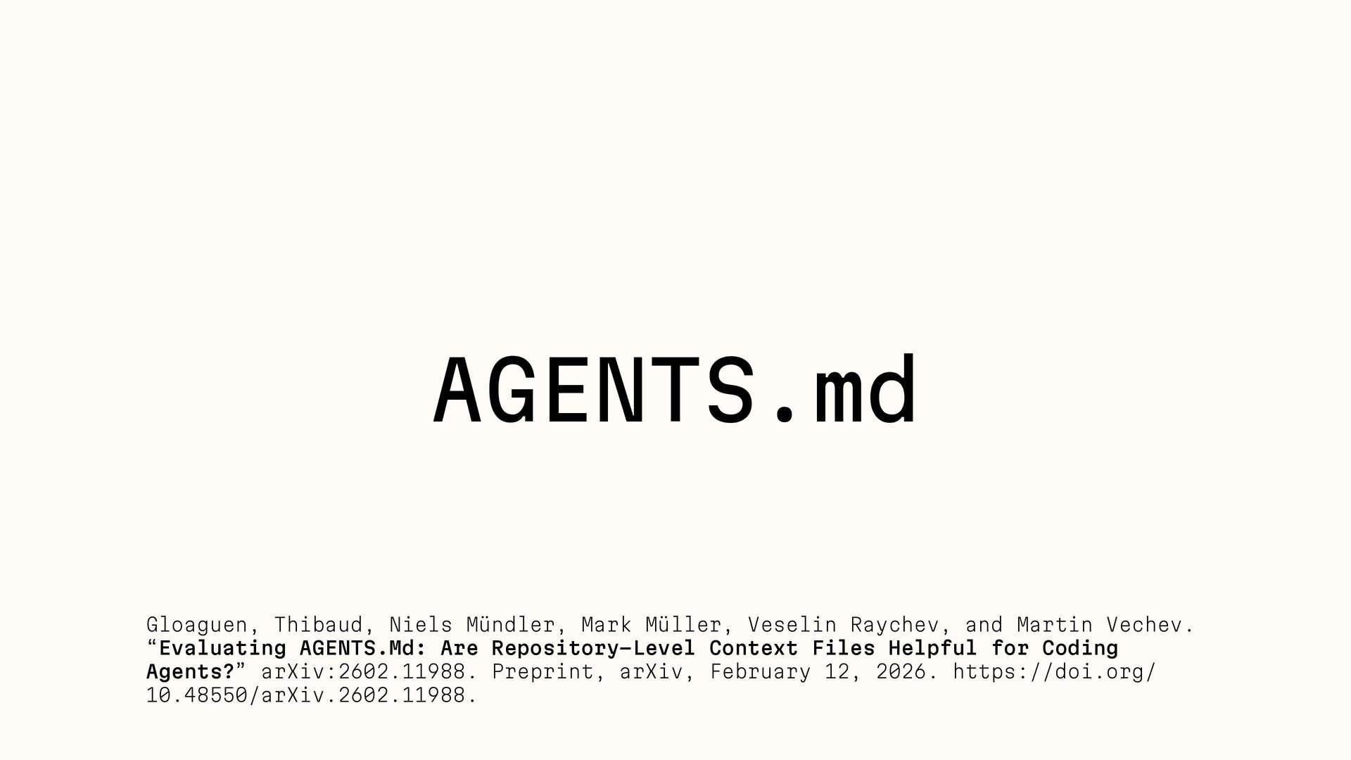 Martin Vechev. “Evaluating AGENTS.Md: Are Repository-Level Context Files Helpful for Coding Agents?” arXiv:2602.11988. Preprint, arXiv, February 12, 2026. https://doi.org/ 10.48550/arXiv.2602.11988.