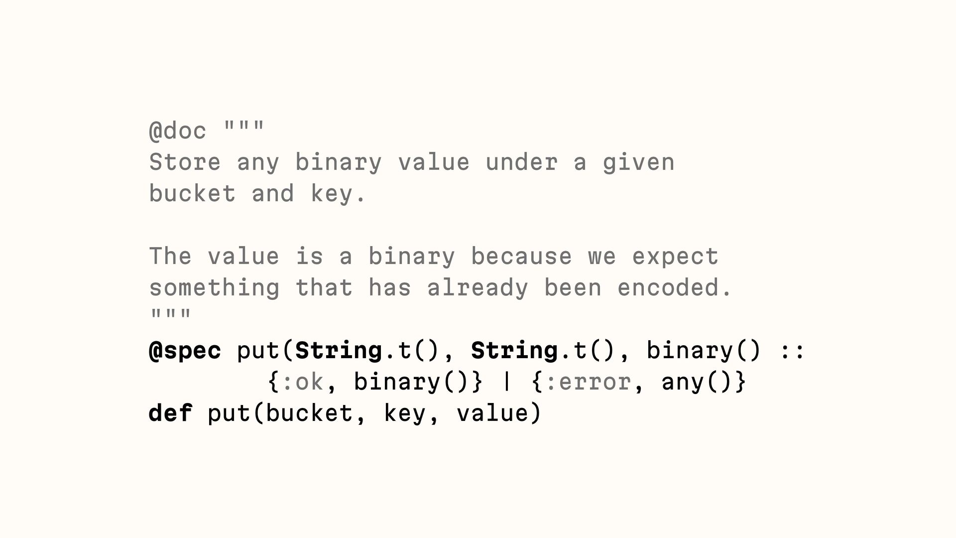 and key. The value is a binary because we expect something that has already been encoded. """ @spec put(String.t(), String.t(), binary() :: {:ok, binary()} | {:error, any()} def put(bucket, key, value)