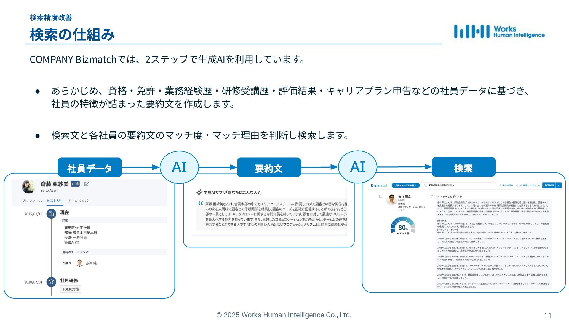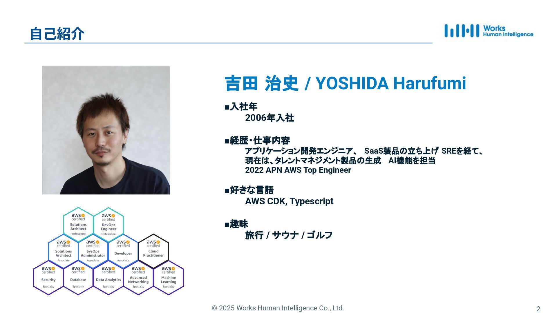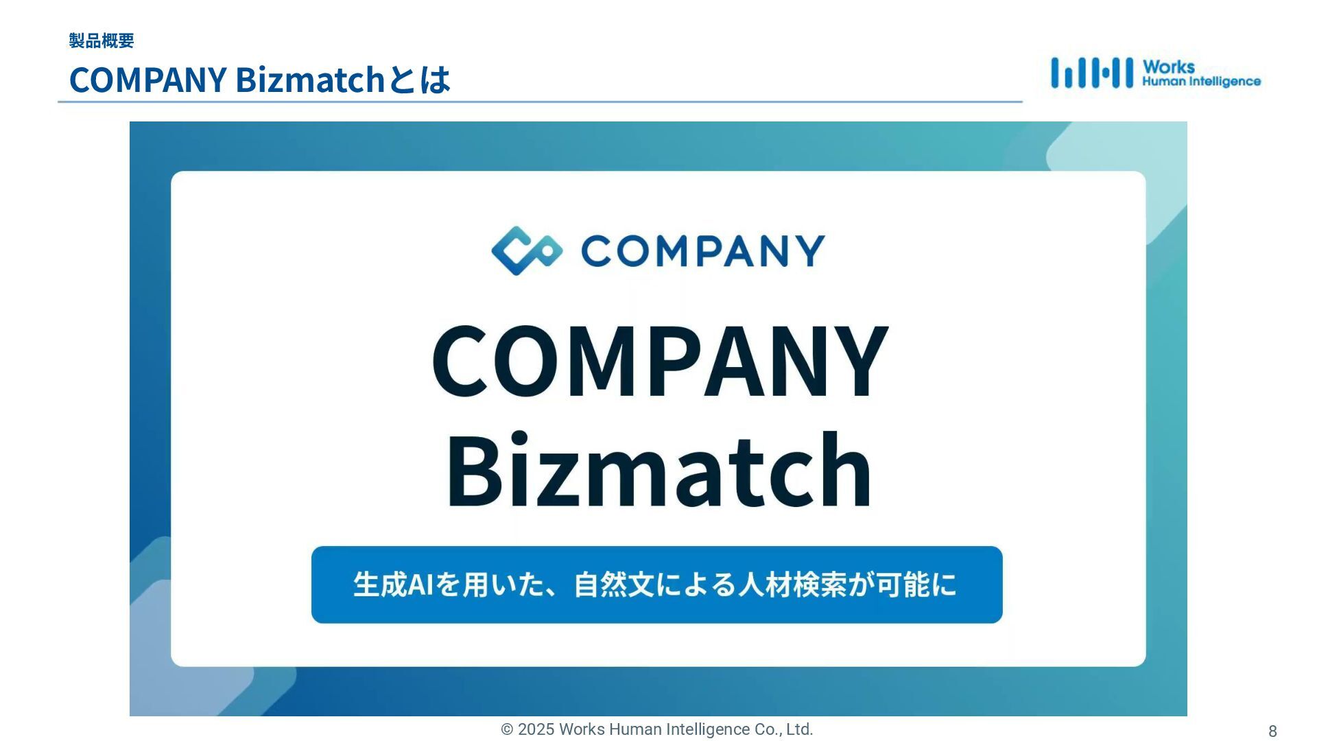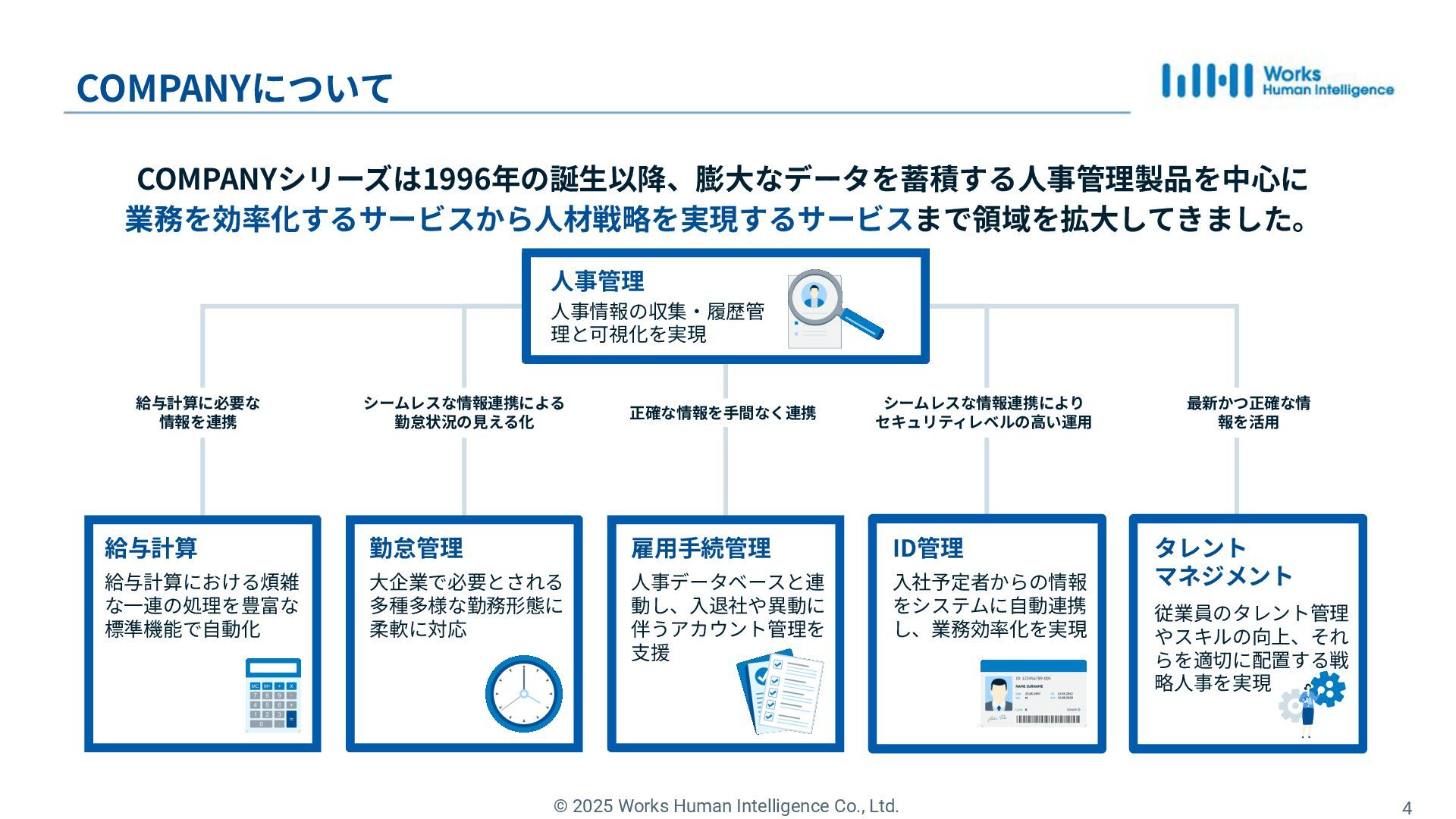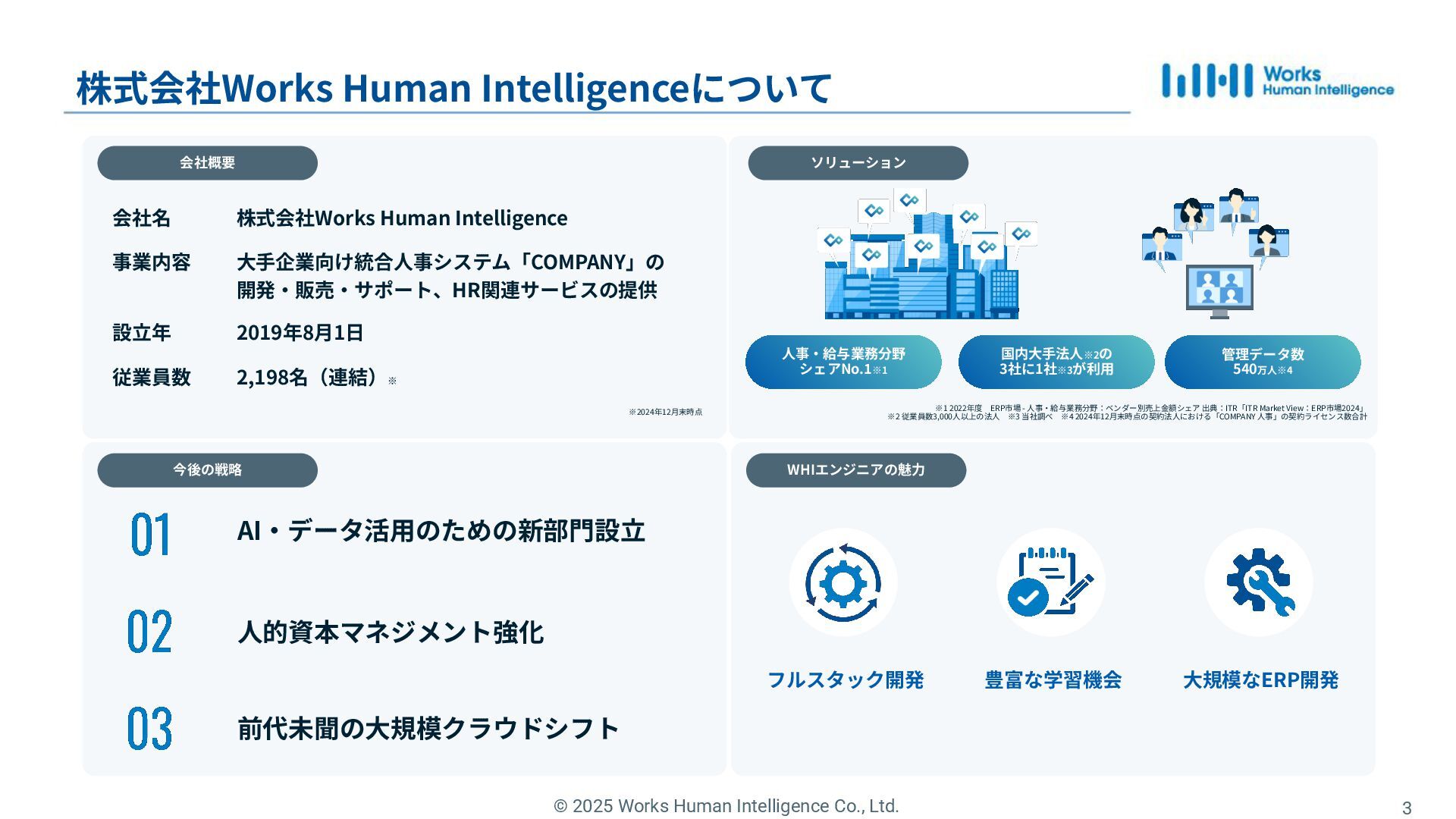 Intelligenceについて ※1 2022年度 ERP市場 - ⼈事‧給与業務分野:ベンダー別売上⾦額シェア 出典:ITR「ITR Market View:ERP市場2024」 ※2 従業員数3,000⼈以上の法⼈ ※3 当社調べ ※4 2024年12⽉末時点の契約法⼈における「COMPANY ⼈事」の契約ライセンス数合計 ⼈事‧給与業務分野 シェアNo.1※1 国内⼤⼿法⼈※2の 3社に1社※3が利⽤ 管理データ数 540万⼈※4 ソリューション 今後の戦略 会社概要 会社名 事業内容 設⽴年 従業員数 株式会社Works Human Intelligence ⼤⼿企業向け統合⼈事システム「COMPANY」の 開発‧販売‧サポート、HR関連サービスの提供 2019年8⽉1⽇ 2,198名(連結)※ ※2024年12⽉末時点 AI‧データ活⽤のための新部⾨設⽴ ⼈的資本マネジメント強化 前代未聞の⼤規模クラウドシフト WHIエンジニアの魅⼒ フルスタック開発 豊富な学習機会 ⼤規模なERP開発