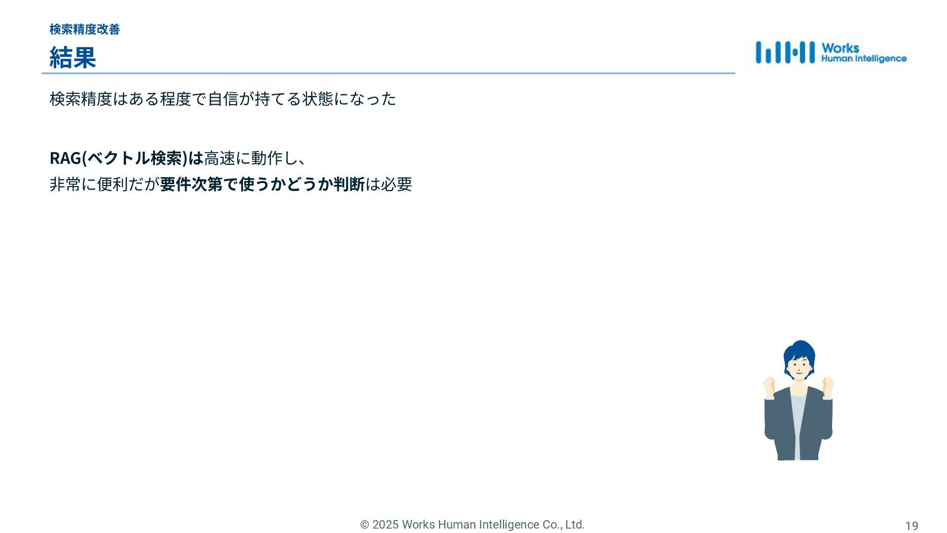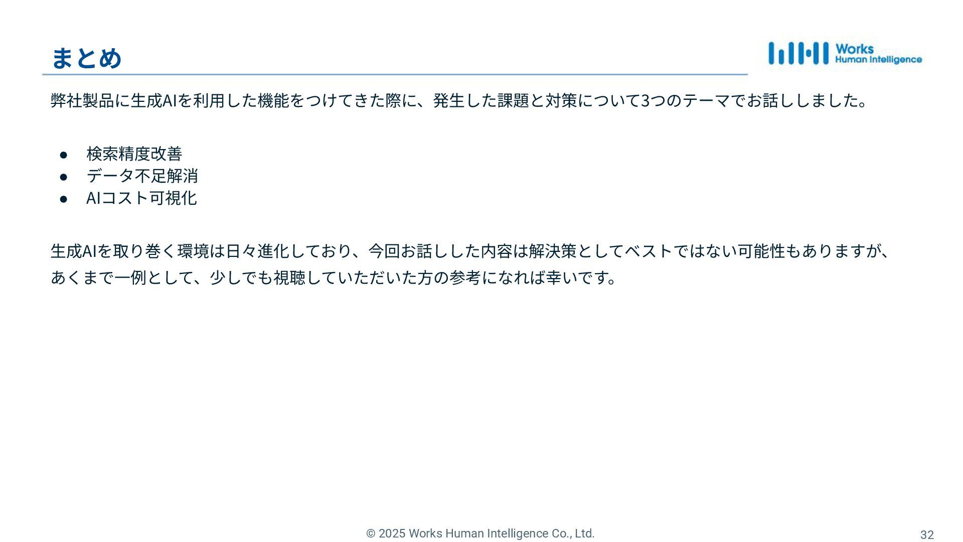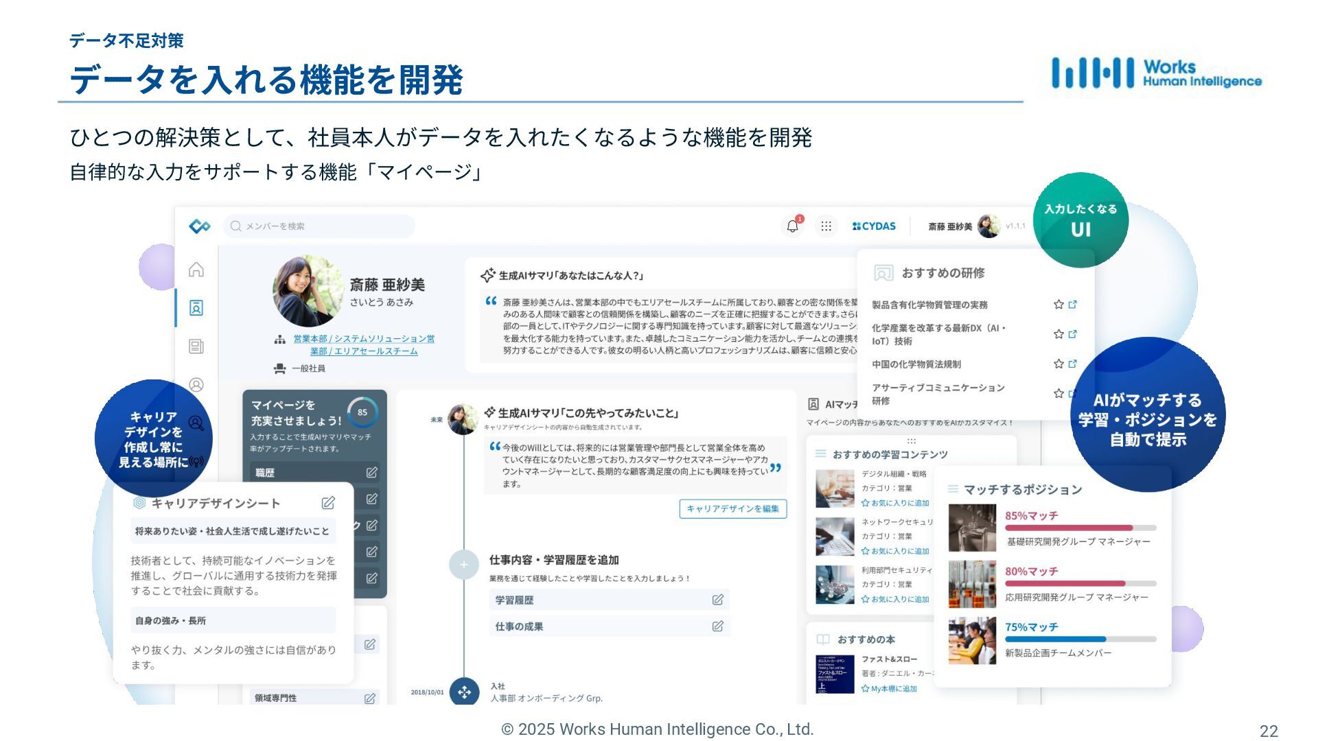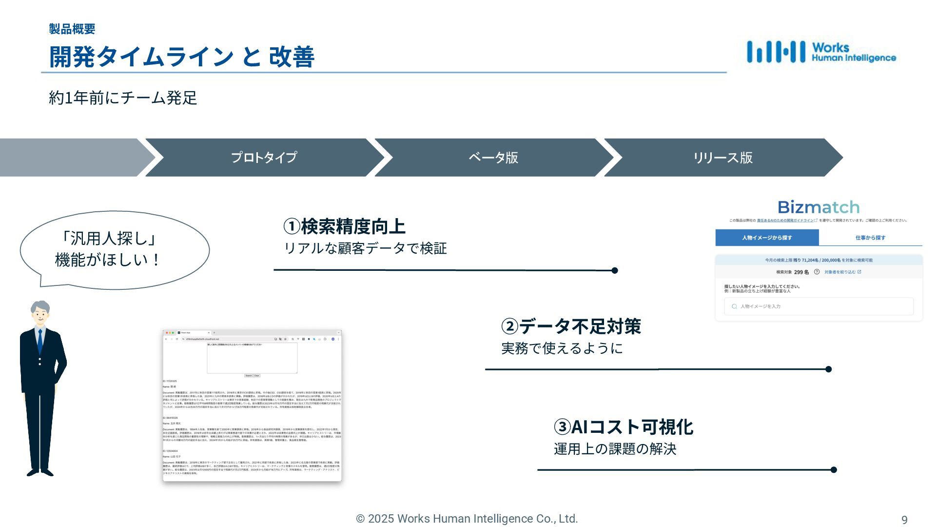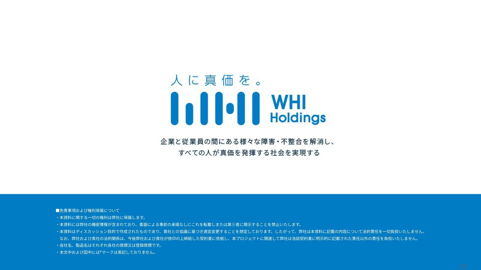 Intelligenceについて ※1 2022年度 ERP市場 - ⼈事‧給与業務分野:ベンダー別売上⾦額シェア 出典:ITR「ITR Market View:ERP市場2024」 ※2 従業員数3,000⼈以上の法⼈ ※3 当社調べ ※4 2024年12⽉末時点の契約法⼈における「COMPANY ⼈事」の契約ライセンス数合計 ⼈事‧給与業務分野 シェアNo.1※1 国内⼤⼿法⼈※2の 3社に1社※3が利⽤ 管理データ数 540万⼈※4 ソリューション 今後の戦略 会社概要 会社名 事業内容 設⽴年 従業員数 株式会社Works Human Intelligence ⼤⼿企業向け統合⼈事システム「COMPANY」の 開発‧販売‧サポート、HR関連サービスの提供 2019年8⽉1⽇ 2,198名(連結)※ ※2024年12⽉末時点 AI‧データ活⽤のための新部⾨設⽴ ⼈的資本マネジメント強化 前代未聞の⼤規模クラウドシフト WHIエンジニアの魅⼒ フルスタック開発 豊富な学習機会 ⼤規模なERP開発