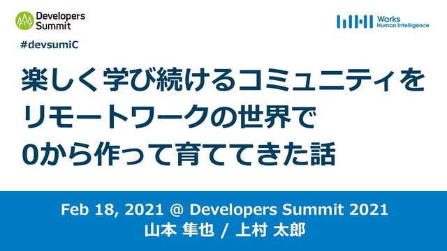 ◆DevelopersSummit2021◆2021/2/18 WHI_18-C-8 楽しく学び続けるコミュニティをリモートワークの世界で0から作って育ててきた話 Presenter:Works Human Intelligence 山本 隼也/上村 太郎