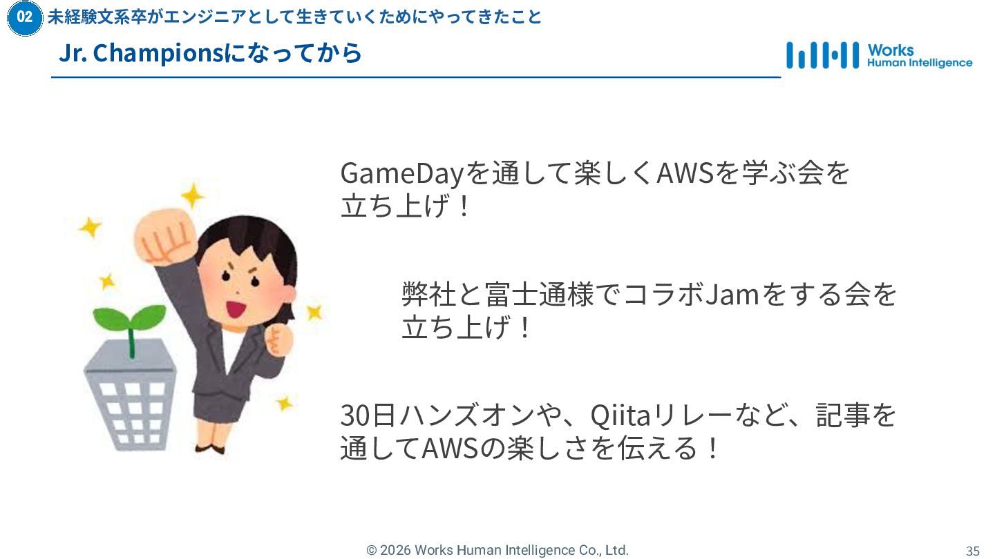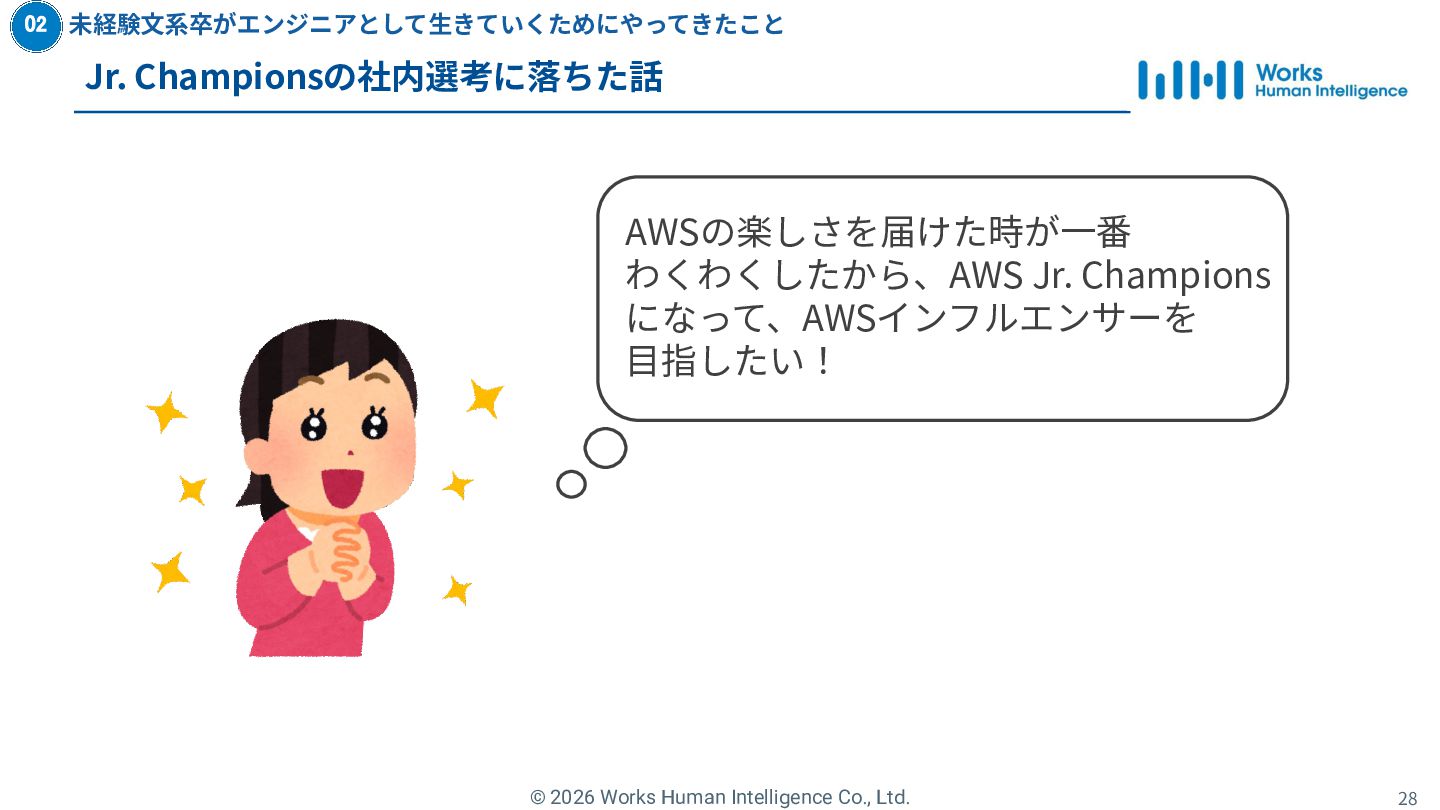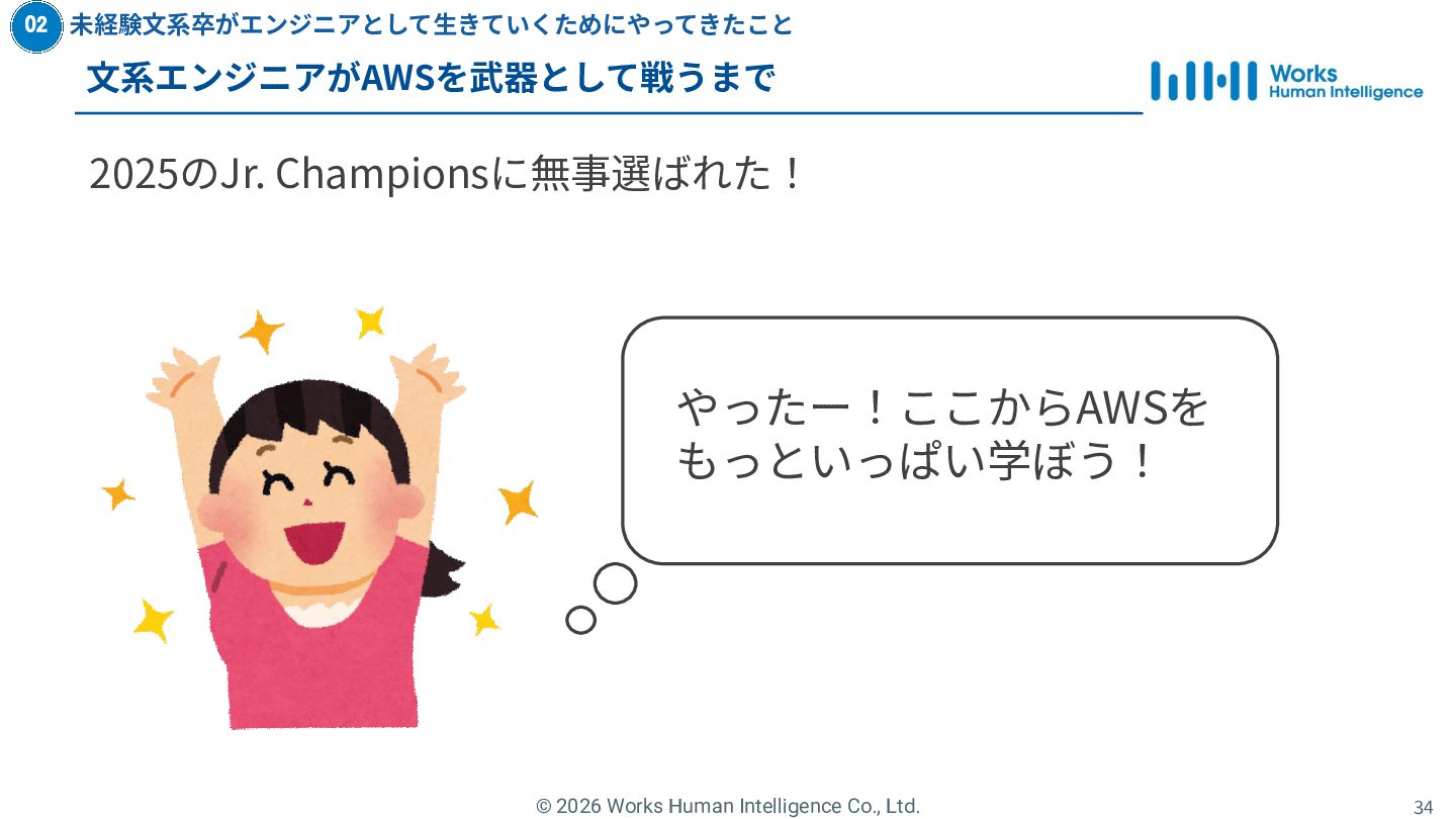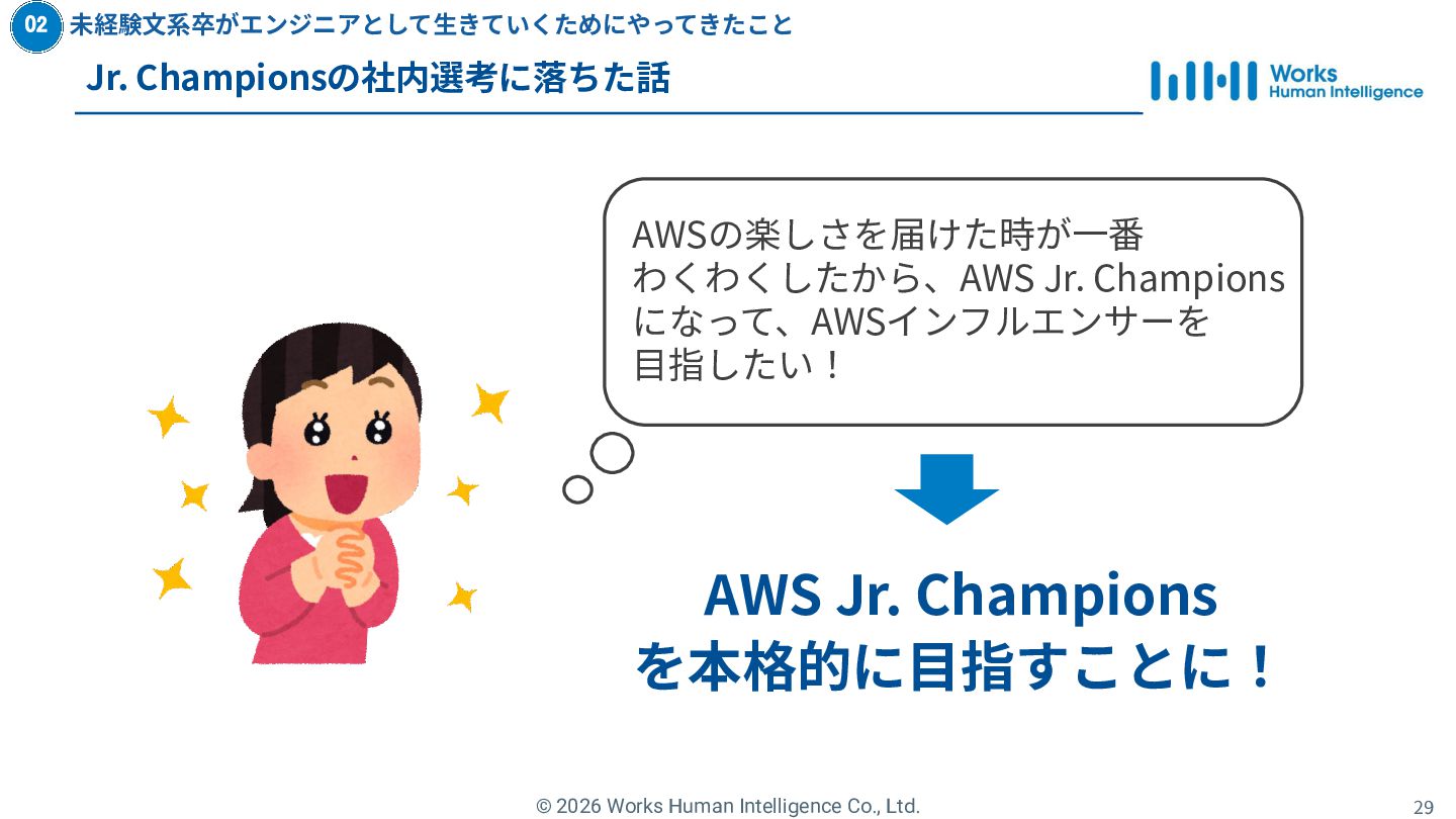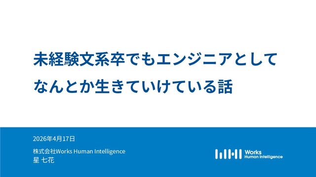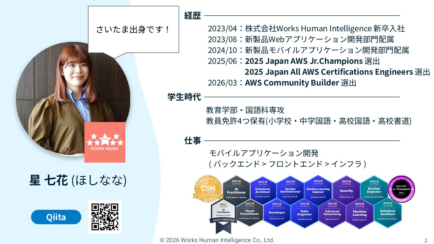 (ほしなな) 経歴 仕事 2023/04:株式会社Works Human Intelligence 新卒⼊社 2023/08:新製品Webアプリケーション開発部⾨配属 2024/10:新製品モバイルアプリケーション開発部⾨配属 2025/06:2025 Japan AWS Jr.Champions 選出 2025 Japan All AWS Certifications Engineers 選出 2026/03:AWS Community Builder 選出 Qiita 教育学部‧国語科専攻 教員免許4つ保有(⼩学校‧中学国語‧⾼校国語‧⾼校書道) 2 学⽣時代 モバイルアプリケーション開発 ( バックエンド > フロントエンド > インフラ ) さいたま出⾝です!