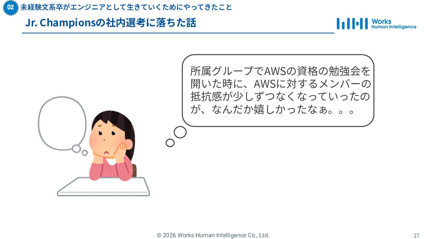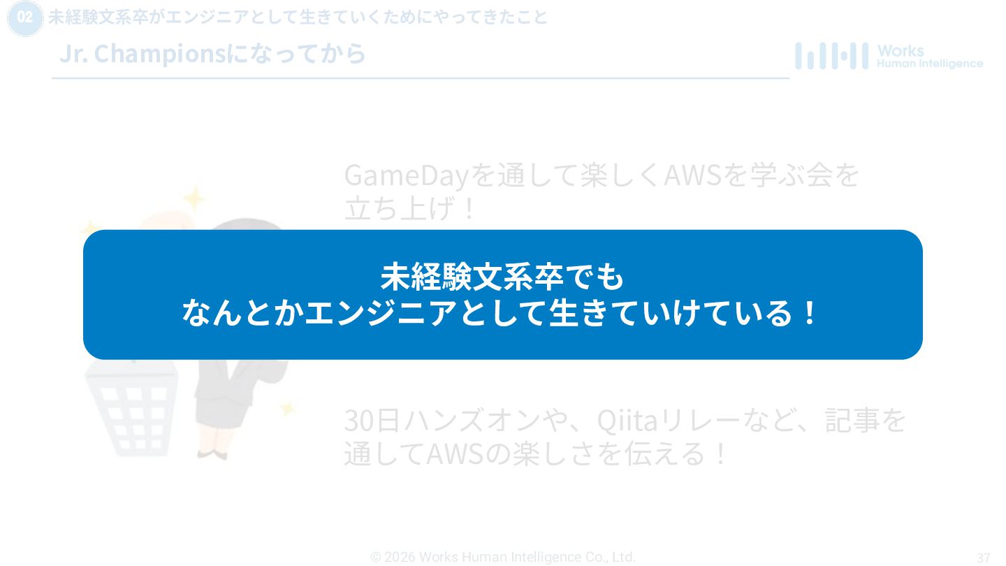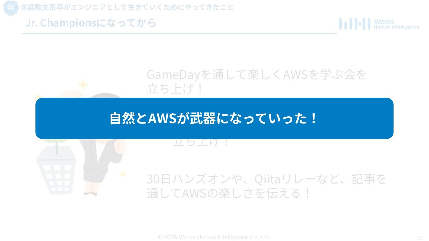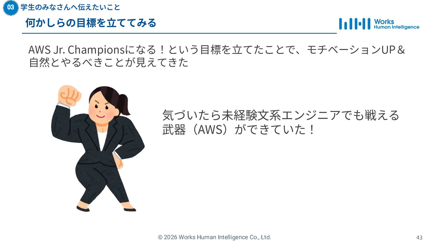 (ほしなな) 経歴 仕事 2023/04:株式会社Works Human Intelligence 新卒⼊社 2023/08:新製品Webアプリケーション開発部⾨配属 2024/10:新製品モバイルアプリケーション開発部⾨配属 2025/06:2025 Japan AWS Jr.Champions 選出 2025 Japan All AWS Certifications Engineers 選出 2026/03:AWS Community Builder 選出 Qiita 教育学部‧国語科専攻 教員免許4つ保有(⼩学校‧中学国語‧⾼校国語‧⾼校書道) 2 学⽣時代 モバイルアプリケーション開発 ( バックエンド > フロントエンド > インフラ ) さいたま出⾝です!