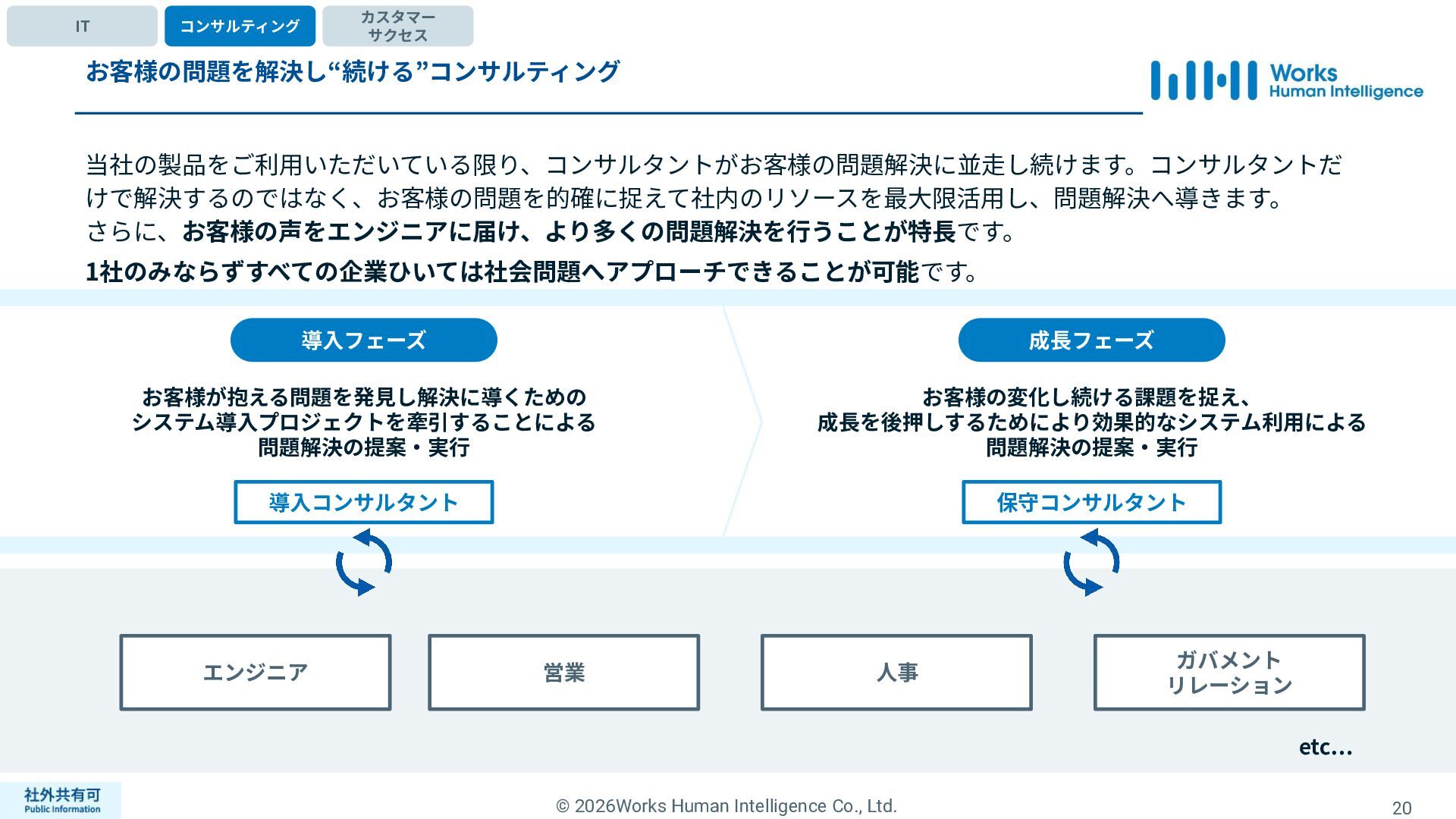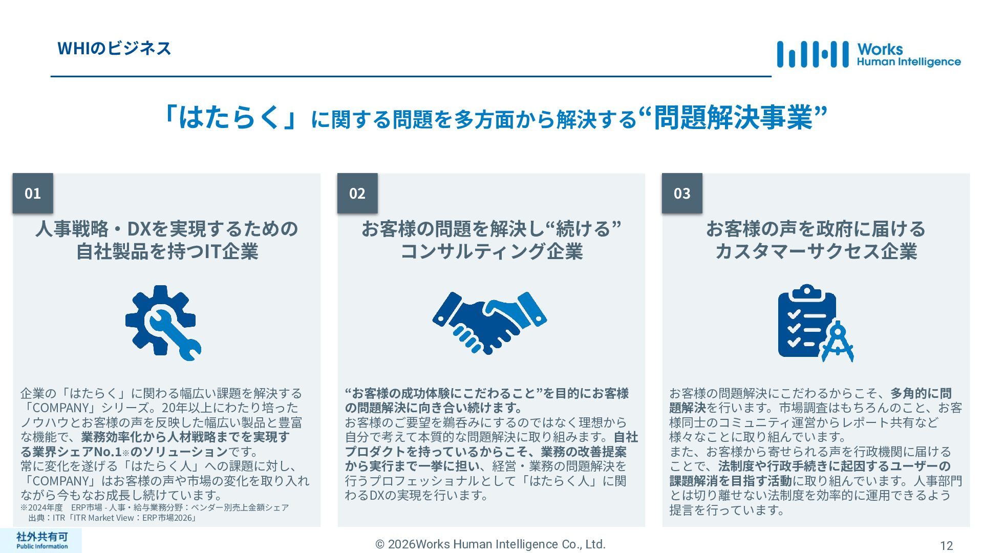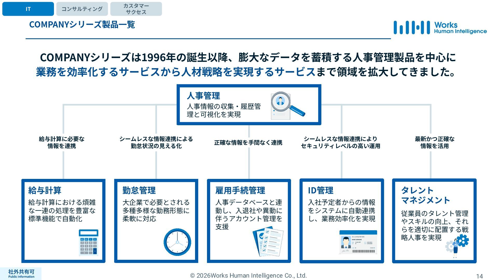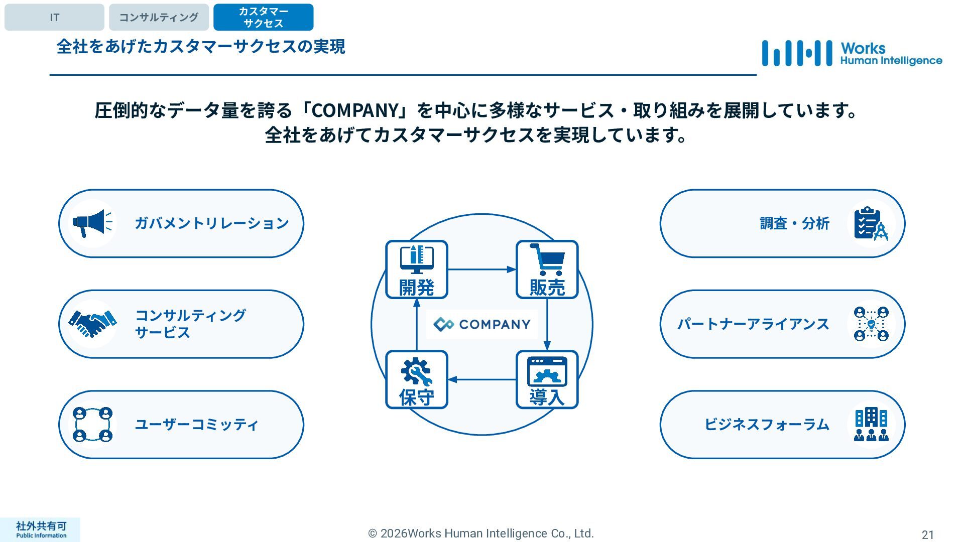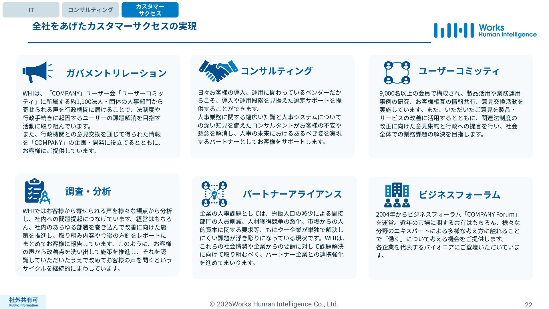 ティ」に所属する約1,100法⼈‧団体の⼈事部⾨から 寄せられる声を⾏政機関に届けることで、法制度や ⾏政⼿続きに起因するユーザーの課題解消を⽬指す 活動に取り組んでいます。 また、⾏政機関との意⾒交換を通じて得られた情報 を「COMPANY」の企画‧開発に役⽴てるとともに、 お客様にご提供しています。 ⽇々お客様の導⼊、運⽤に関わっているベンダーだか らこそ、導⼊や運⽤段階を⾒据えた選定サポートを提 供することができます。 ⼈事業務に関する幅広い知識と⼈事システムについて の深い知⾒を備えたコンサルタントがお客様の不安や 懸念を解消し、⼈事の未来におけるあるべき姿を実現 するパートナーとしてお客様をサポートします。 9,000名以上の会員で構成され、製品活⽤や業務運⽤ 事例の研究、お客様相互の情報共有、意⾒交換活動を 実施しています。また、いただいたご意⾒を製品‧ サービスの改善に活⽤するとともに、関連法制度の 改正に向けた意⾒集約と⾏政への提⾔を⾏い、社会 全体での業務課題の解決を⽬指します。 WHIではお客様から寄せられる声を様々な観点から分析 し、社内への問題提起につなげています。経営はもちろ ん、社内のあらゆる部署を巻き込んで改善に向けた施 策を推進し、取り組み内容や今後の⽅針をレポートに まとめてお客様に報告しています。このように、お客様 の声から改善点を洗い出して施策を推進し、それを認 識していただいたうえで改めてお客様の声を聞くという サイクルを継続的にまわしています。 コンサルティング ユーザーコミッティ 調査‧分析 企業の⼈事課題としては、労働⼈⼝の減少による間接 部⾨の⼈員削減、⼈材獲得競争の激化、市場からの⼈ 的資本に関する要求等、もはや⼀企業が単独で解決し にくい課題が浮き彫りになっている現状です。WHIは、 これらの社会情勢や企業からの要請に対して課題解決 に向けて取り組むべく、パートナー企業との連携強化 を進めてまいります。 パートナーアライアンス 2004年からビジネスフォーラム「COMPANY Forum」 を運営。近年の市場に関する共有はもちろん、様々な 分野のエキスパートによる多様な考え⽅に触れること で「働く」について考える機会をご提供します。 各企業を代表するパイオニアにご登壇いただいていま す。 ビジネスフォーラム IT コンサルティング カスタマー サクセス