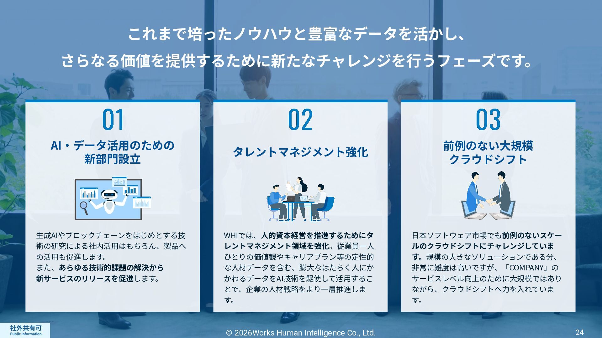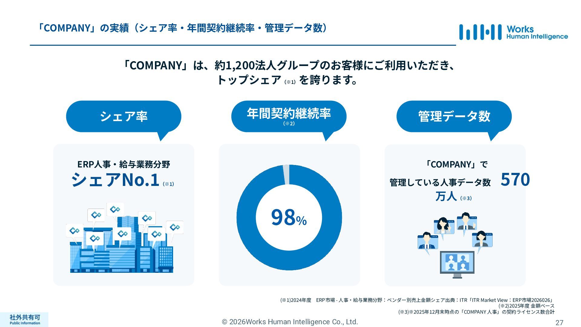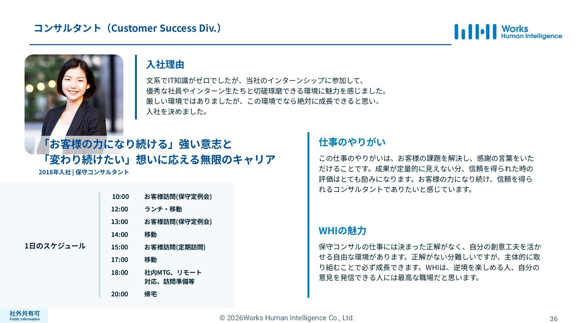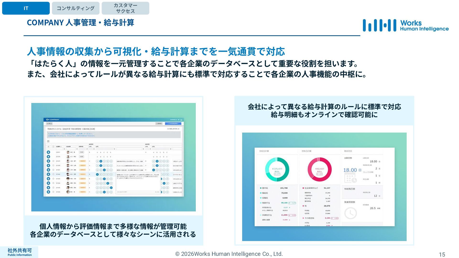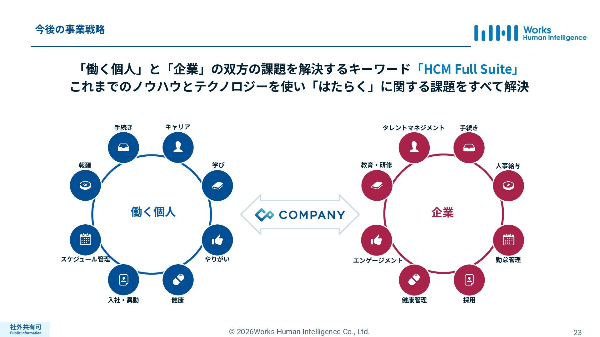 ティ」に所属する約1,100法⼈‧団体の⼈事部⾨から 寄せられる声を⾏政機関に届けることで、法制度や ⾏政⼿続きに起因するユーザーの課題解消を⽬指す 活動に取り組んでいます。 また、⾏政機関との意⾒交換を通じて得られた情報 を「COMPANY」の企画‧開発に役⽴てるとともに、 お客様にご提供しています。 ⽇々お客様の導⼊、運⽤に関わっているベンダーだか らこそ、導⼊や運⽤段階を⾒据えた選定サポートを提 供することができます。 ⼈事業務に関する幅広い知識と⼈事システムについて の深い知⾒を備えたコンサルタントがお客様の不安や 懸念を解消し、⼈事の未来におけるあるべき姿を実現 するパートナーとしてお客様をサポートします。 9,000名以上の会員で構成され、製品活⽤や業務運⽤ 事例の研究、お客様相互の情報共有、意⾒交換活動を 実施しています。また、いただいたご意⾒を製品‧ サービスの改善に活⽤するとともに、関連法制度の 改正に向けた意⾒集約と⾏政への提⾔を⾏い、社会 全体での業務課題の解決を⽬指します。 WHIではお客様から寄せられる声を様々な観点から分析 し、社内への問題提起につなげています。経営はもちろ ん、社内のあらゆる部署を巻き込んで改善に向けた施 策を推進し、取り組み内容や今後の⽅針をレポートに まとめてお客様に報告しています。このように、お客様 の声から改善点を洗い出して施策を推進し、それを認 識していただいたうえで改めてお客様の声を聞くという サイクルを継続的にまわしています。 コンサルティング ユーザーコミッティ 調査‧分析 企業の⼈事課題としては、労働⼈⼝の減少による間接 部⾨の⼈員削減、⼈材獲得競争の激化、市場からの⼈ 的資本に関する要求等、もはや⼀企業が単独で解決し にくい課題が浮き彫りになっている現状です。WHIは、 これらの社会情勢や企業からの要請に対して課題解決 に向けて取り組むべく、パートナー企業との連携強化 を進めてまいります。 パートナーアライアンス 2004年からビジネスフォーラム「COMPANY Forum」 を運営。近年の市場に関する共有はもちろん、様々な 分野のエキスパートによる多様な考え⽅に触れること で「働く」について考える機会をご提供します。 各企業を代表するパイオニアにご登壇いただいていま す。 ビジネスフォーラム IT コンサルティング カスタマー サクセス