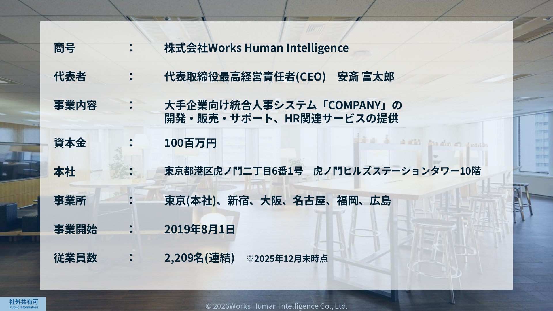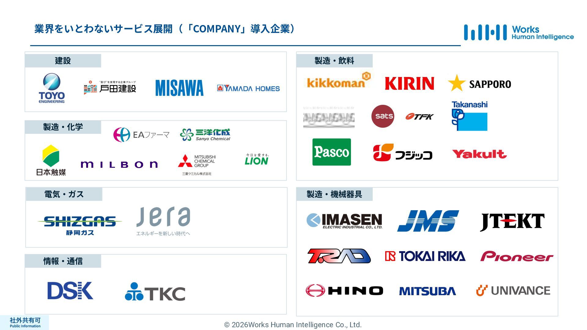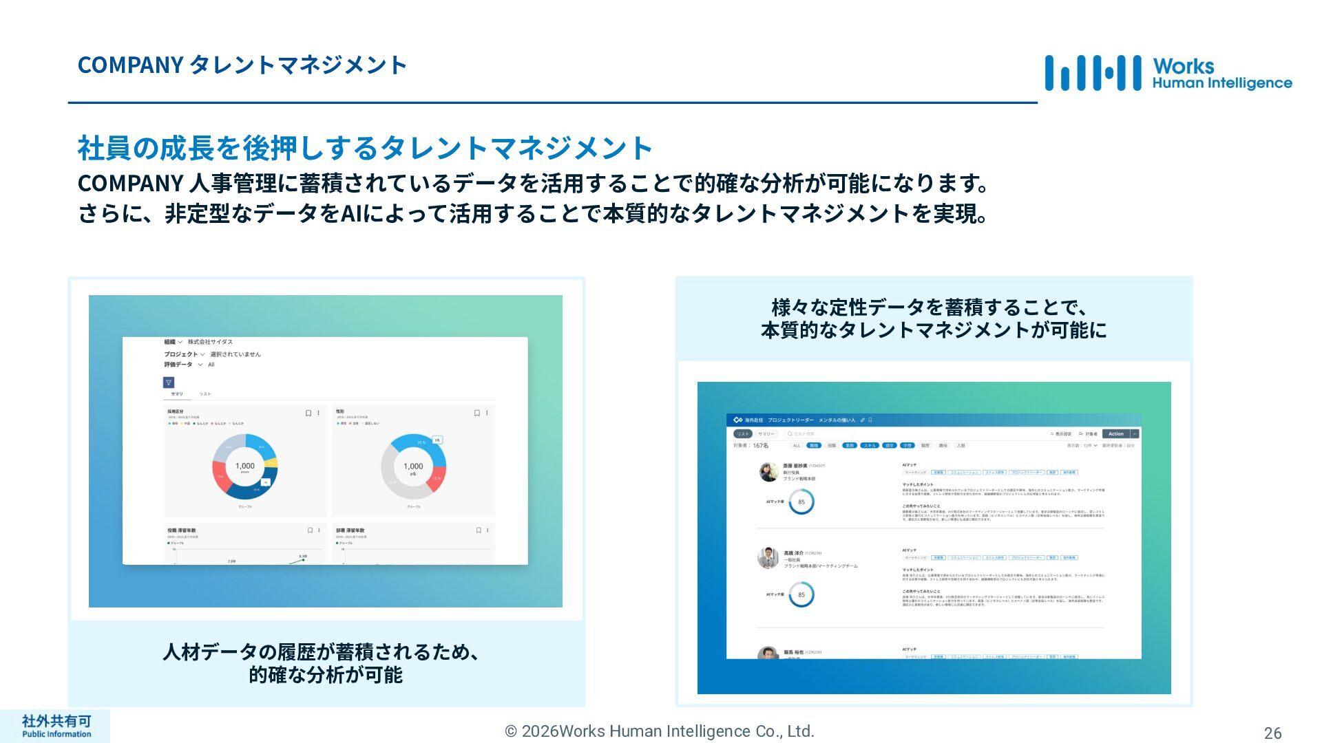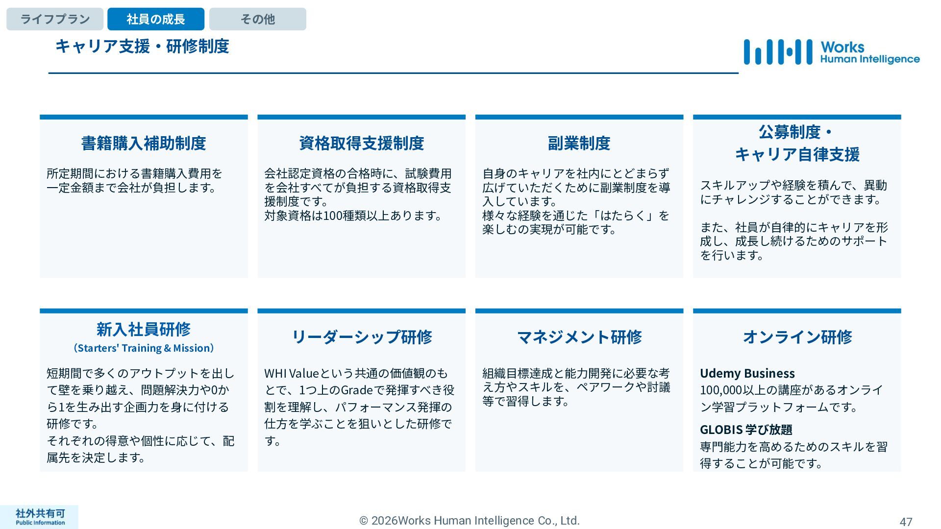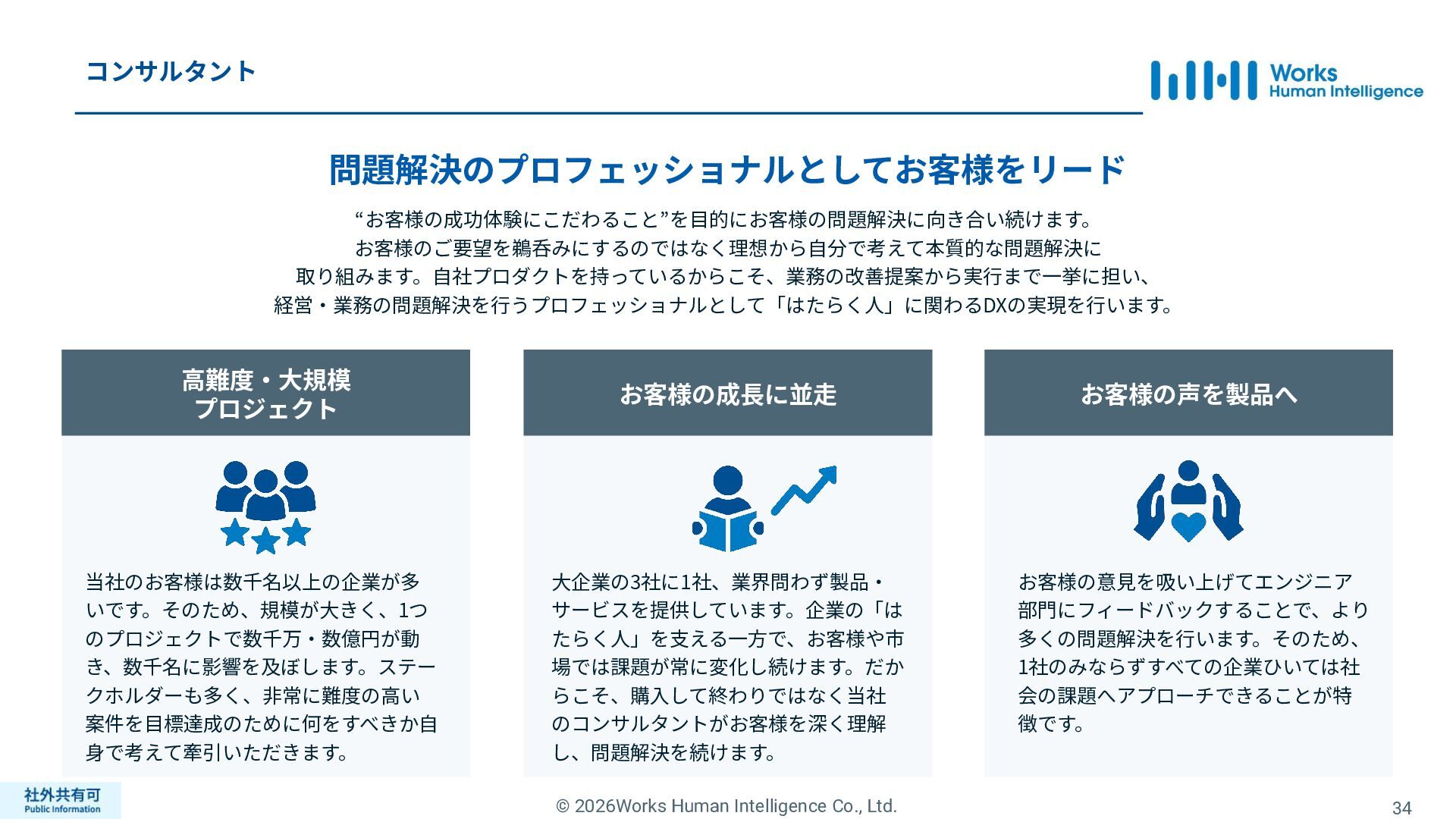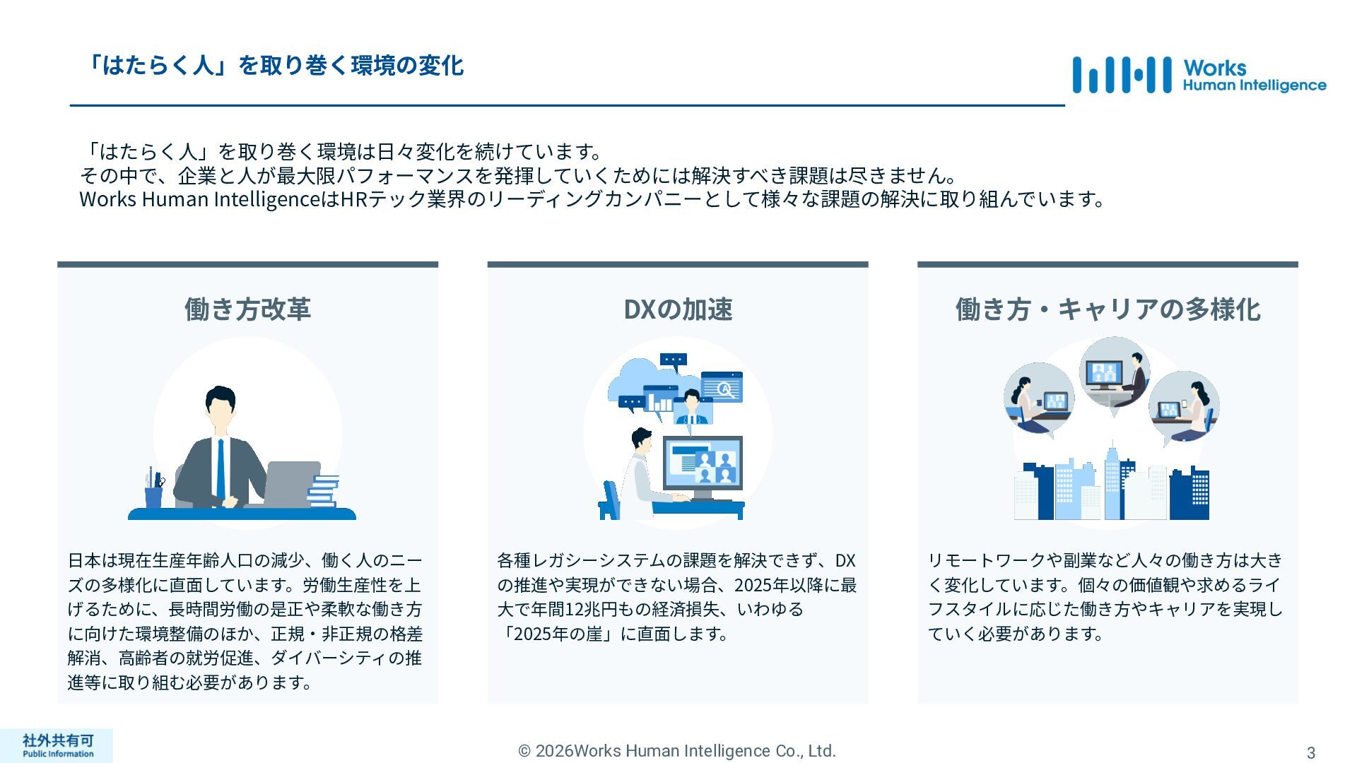 ティ」に所属する約1,100法⼈‧団体の⼈事部⾨から 寄せられる声を⾏政機関に届けることで、法制度や ⾏政⼿続きに起因するユーザーの課題解消を⽬指す 活動に取り組んでいます。 また、⾏政機関との意⾒交換を通じて得られた情報 を「COMPANY」の企画‧開発に役⽴てるとともに、 お客様にご提供しています。 ⽇々お客様の導⼊、運⽤に関わっているベンダーだか らこそ、導⼊や運⽤段階を⾒据えた選定サポートを提 供することができます。 ⼈事業務に関する幅広い知識と⼈事システムについて の深い知⾒を備えたコンサルタントがお客様の不安や 懸念を解消し、⼈事の未来におけるあるべき姿を実現 するパートナーとしてお客様をサポートします。 9,000名以上の会員で構成され、製品活⽤や業務運⽤ 事例の研究、お客様相互の情報共有、意⾒交換活動を 実施しています。また、いただいたご意⾒を製品‧ サービスの改善に活⽤するとともに、関連法制度の 改正に向けた意⾒集約と⾏政への提⾔を⾏い、社会 全体での業務課題の解決を⽬指します。 WHIではお客様から寄せられる声を様々な観点から分析 し、社内への問題提起につなげています。経営はもちろ ん、社内のあらゆる部署を巻き込んで改善に向けた施 策を推進し、取り組み内容や今後の⽅針をレポートに まとめてお客様に報告しています。このように、お客様 の声から改善点を洗い出して施策を推進し、それを認 識していただいたうえで改めてお客様の声を聞くという サイクルを継続的にまわしています。 コンサルティング ユーザーコミッティ 調査‧分析 企業の⼈事課題としては、労働⼈⼝の減少による間接 部⾨の⼈員削減、⼈材獲得競争の激化、市場からの⼈ 的資本に関する要求等、もはや⼀企業が単独で解決し にくい課題が浮き彫りになっている現状です。WHIは、 これらの社会情勢や企業からの要請に対して課題解決 に向けて取り組むべく、パートナー企業との連携強化 を進めてまいります。 パートナーアライアンス 2004年からビジネスフォーラム「COMPANY Forum」 を運営。近年の市場に関する共有はもちろん、様々な 分野のエキスパートによる多様な考え⽅に触れること で「働く」について考える機会をご提供します。 各企業を代表するパイオニアにご登壇いただいていま す。 ビジネスフォーラム IT コンサルティング カスタマー サクセス