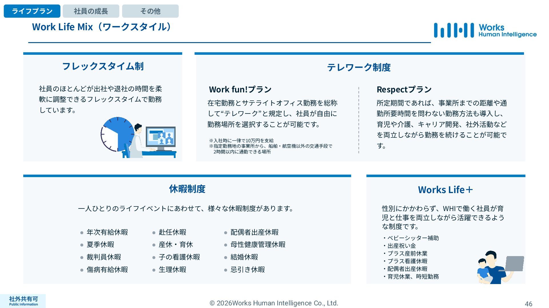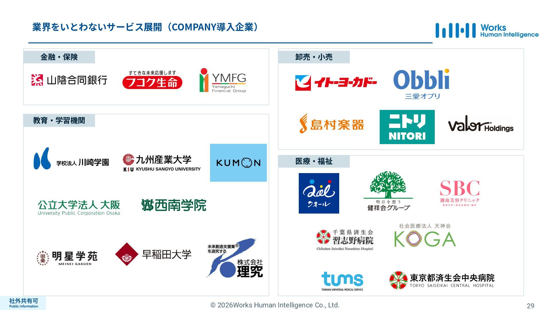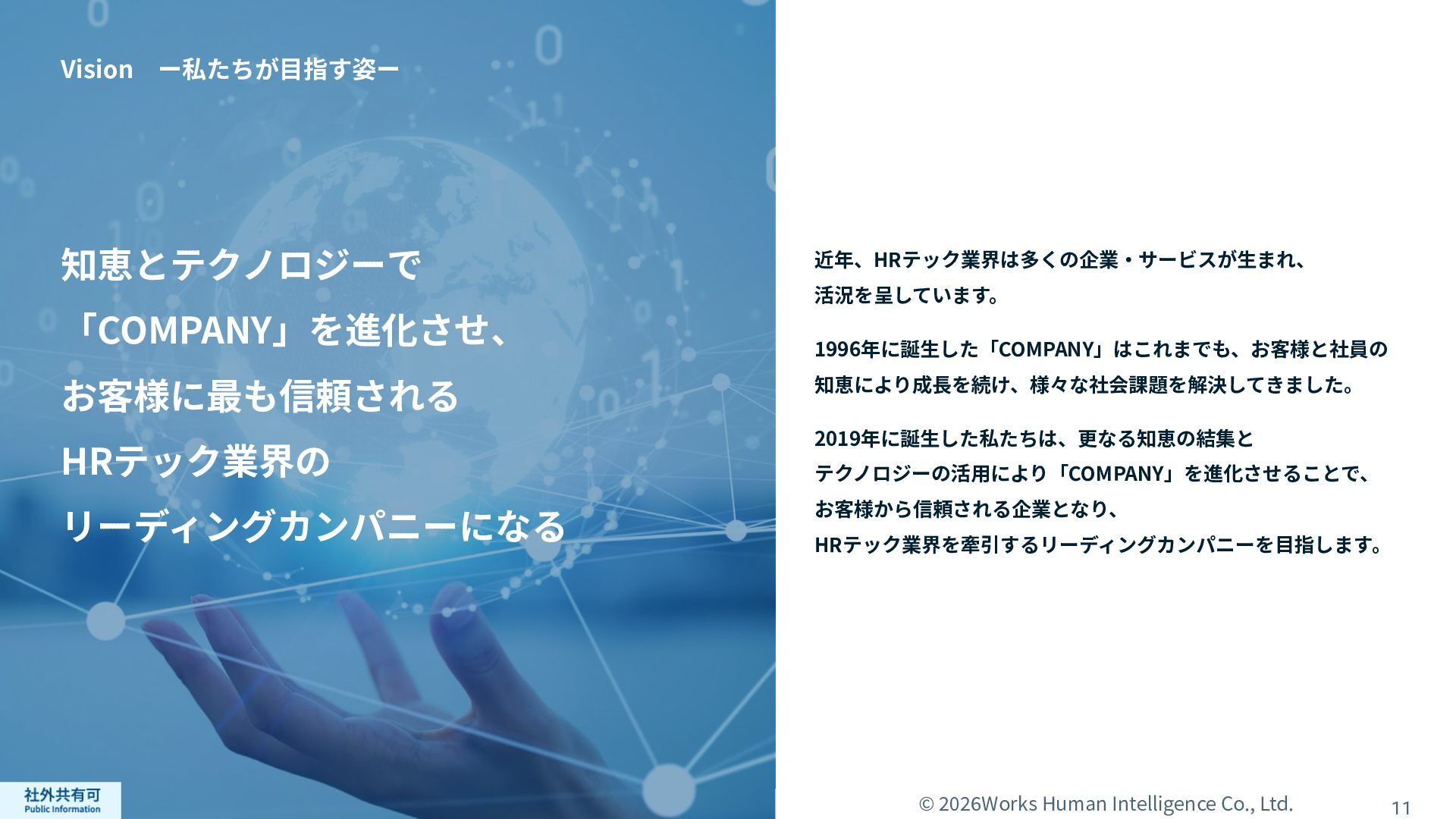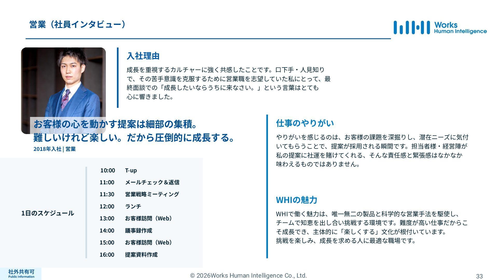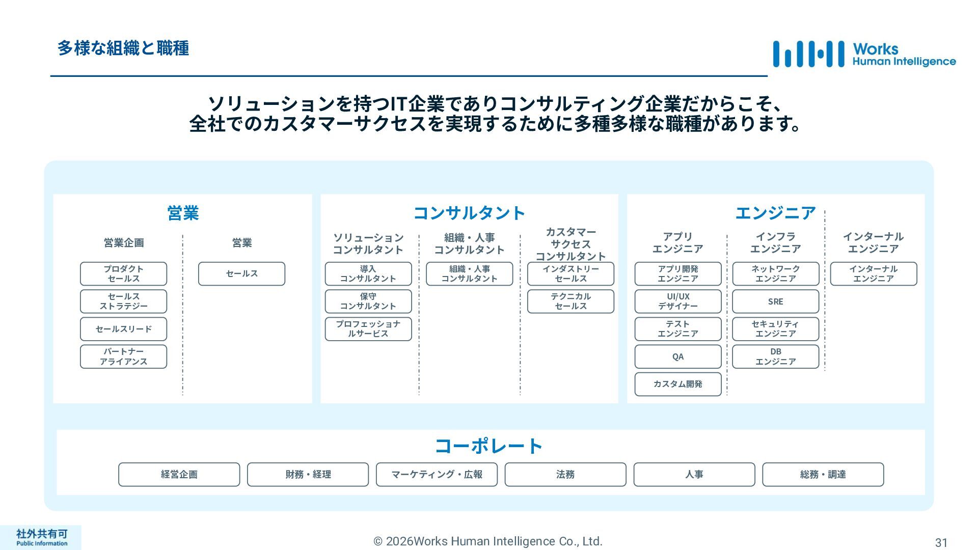 ティ」に所属する約1,100法⼈‧団体の⼈事部⾨から 寄せられる声を⾏政機関に届けることで、法制度や ⾏政⼿続きに起因するユーザーの課題解消を⽬指す 活動に取り組んでいます。 また、⾏政機関との意⾒交換を通じて得られた情報 を「COMPANY」の企画‧開発に役⽴てるとともに、 お客様にご提供しています。 ⽇々お客様の導⼊、運⽤に関わっているベンダーだか らこそ、導⼊や運⽤段階を⾒据えた選定サポートを提 供することができます。 ⼈事業務に関する幅広い知識と⼈事システムについて の深い知⾒を備えたコンサルタントがお客様の不安や 懸念を解消し、⼈事の未来におけるあるべき姿を実現 するパートナーとしてお客様をサポートします。 9,000名以上の会員で構成され、製品活⽤や業務運⽤ 事例の研究、お客様相互の情報共有、意⾒交換活動を 実施しています。また、いただいたご意⾒を製品‧ サービスの改善に活⽤するとともに、関連法制度の 改正に向けた意⾒集約と⾏政への提⾔を⾏い、社会 全体での業務課題の解決を⽬指します。 WHIではお客様から寄せられる声を様々な観点から分析 し、社内への問題提起につなげています。経営はもちろ ん、社内のあらゆる部署を巻き込んで改善に向けた施 策を推進し、取り組み内容や今後の⽅針をレポートに まとめてお客様に報告しています。このように、お客様 の声から改善点を洗い出して施策を推進し、それを認 識していただいたうえで改めてお客様の声を聞くという サイクルを継続的にまわしています。 コンサルティング ユーザーコミッティ 調査‧分析 企業の⼈事課題としては、労働⼈⼝の減少による間接 部⾨の⼈員削減、⼈材獲得競争の激化、市場からの⼈ 的資本に関する要求等、もはや⼀企業が単独で解決し にくい課題が浮き彫りになっている現状です。WHIは、 これらの社会情勢や企業からの要請に対して課題解決 に向けて取り組むべく、パートナー企業との連携強化 を進めてまいります。 パートナーアライアンス 2004年からビジネスフォーラム「COMPANY Forum」 を運営。近年の市場に関する共有はもちろん、様々な 分野のエキスパートによる多様な考え⽅に触れること で「働く」について考える機会をご提供します。 各企業を代表するパイオニアにご登壇いただいていま す。 ビジネスフォーラム IT コンサルティング カスタマー サクセス