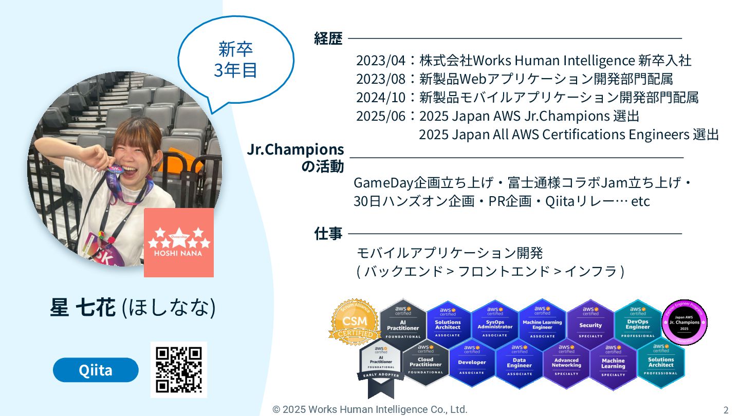 (ほしなな) 経歴 仕事 2023/04:株式会社Works Human Intelligence 新卒⼊社 2023/08:新製品Webアプリケーション開発部⾨配属 2024/10:新製品モバイルアプリケーション開発部⾨配属 2025/06:2025 Japan AWS Jr.Champions 選出 2025 Japan All AWS Certifications Engineers 選出 Qiita GameDay企画⽴ち上げ‧富⼠通様コラボJam⽴ち上げ‧ 30⽇ハンズオン企画‧PR企画‧Qiitaリレー… etc 3 Jr.Champions の活動 モバイルアプリケーション開発 ( バックエンド > フロントエンド > インフラ ) 新卒 2年⽬で 選出