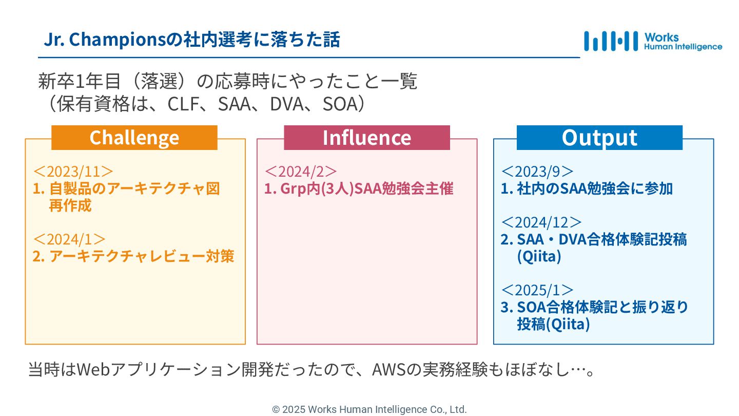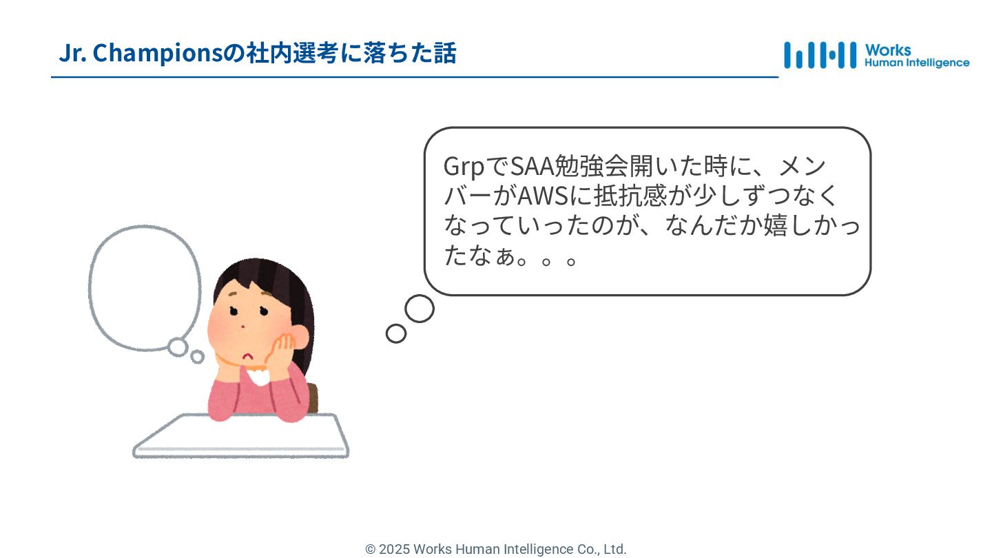 © 2025 Works Human Intelligence Co., Ltd. Jr. Championsの社内選考に落ちた話 GrpでSAA勉強会開いた時に、メン