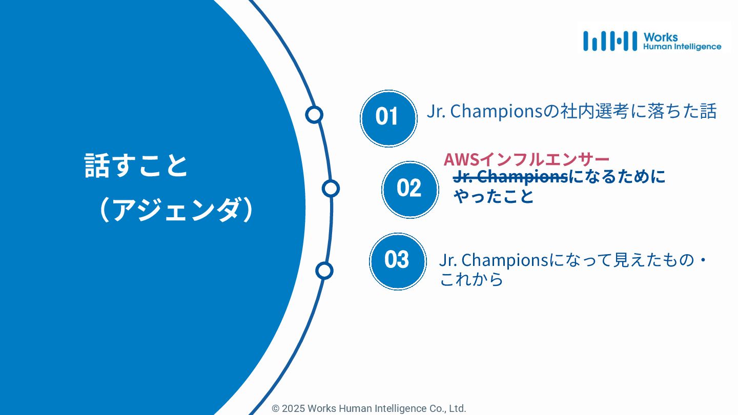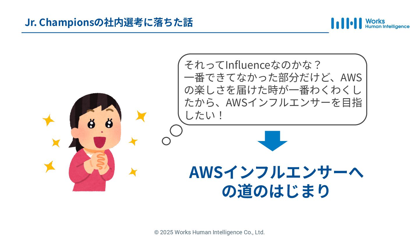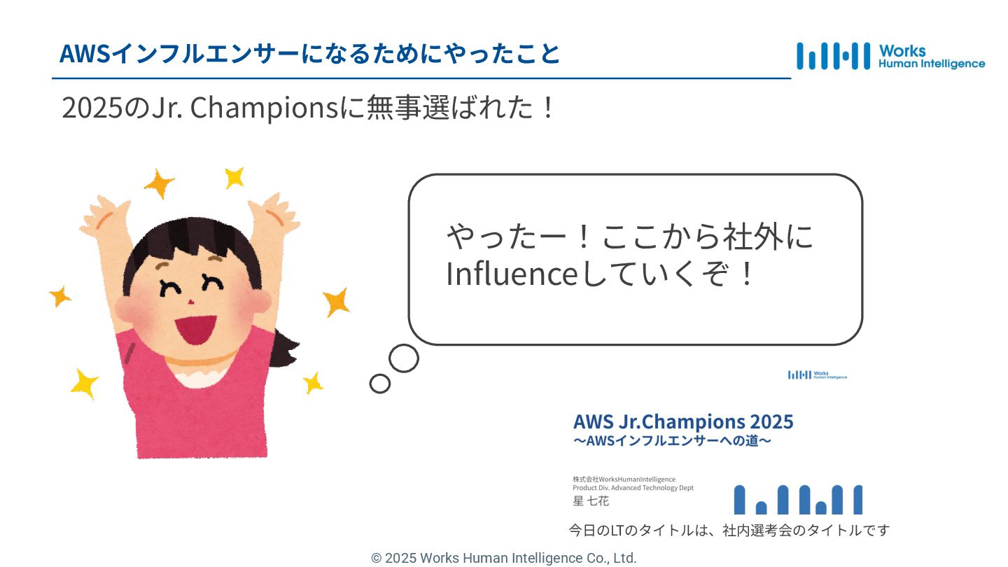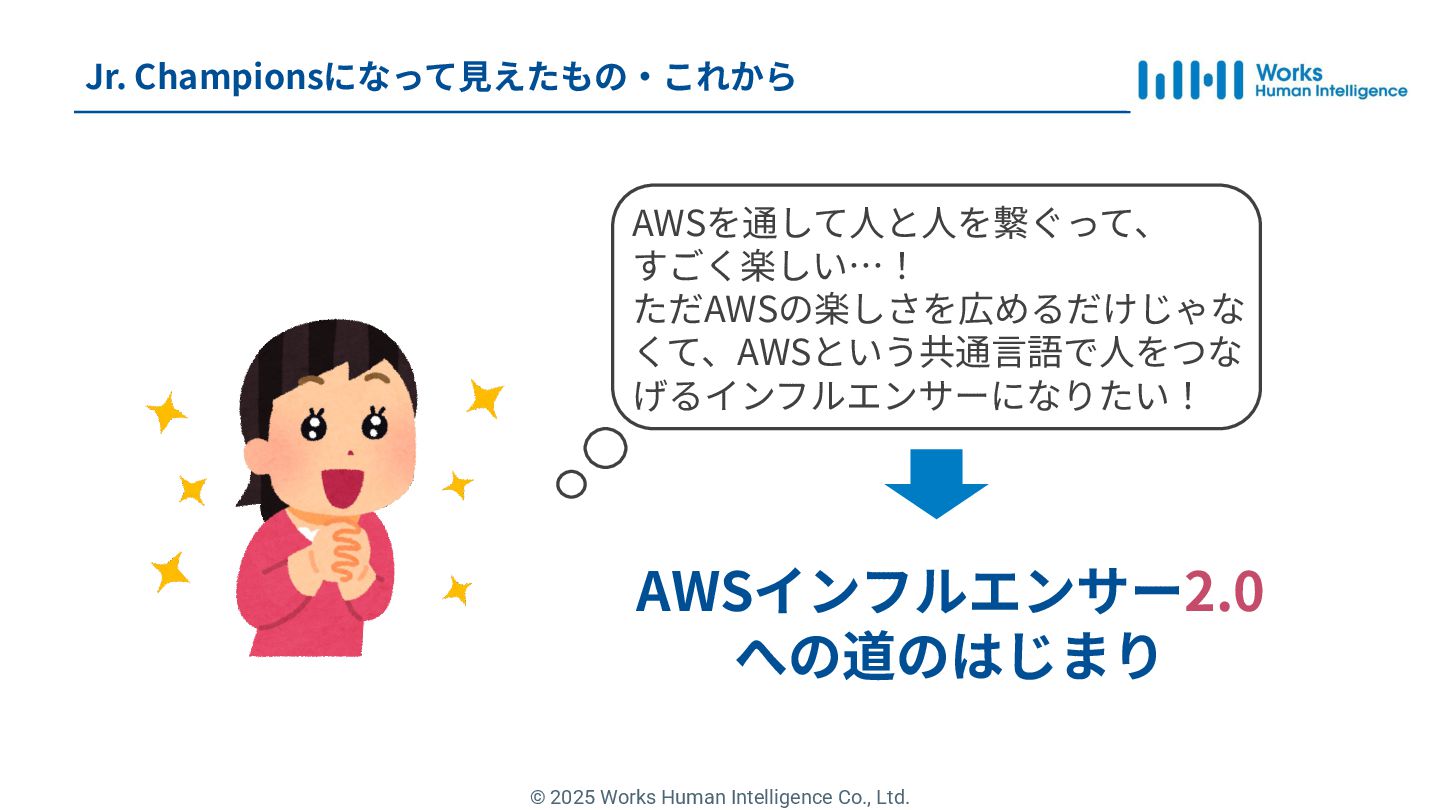 © 2025 Works Human Intelligence Co., Ltd. 2025のJr. Championsに無事選ばれた! AWSインフルエンサーになるためにやったこと