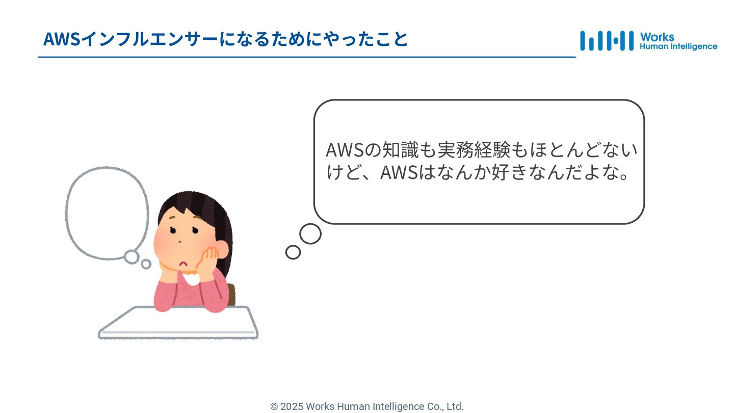 © 2025 Works Human Intelligence Co., Ltd. AWSの知識も実務経験もほとんどない けど、AWSはなんか好きなんだよな。 AWSインフルエンサーになるためにやったこと