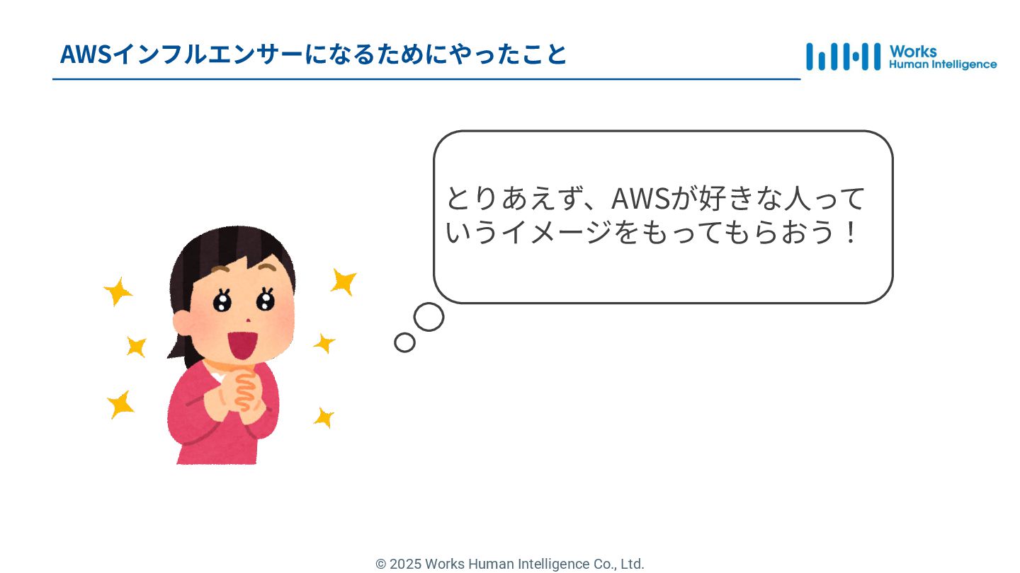 © 2025 Works Human Intelligence Co., Ltd. AWSインフルエンサーになるためにやったこと とりあえず、AWSが好きな⼈って いうイメージをもってもらおう!